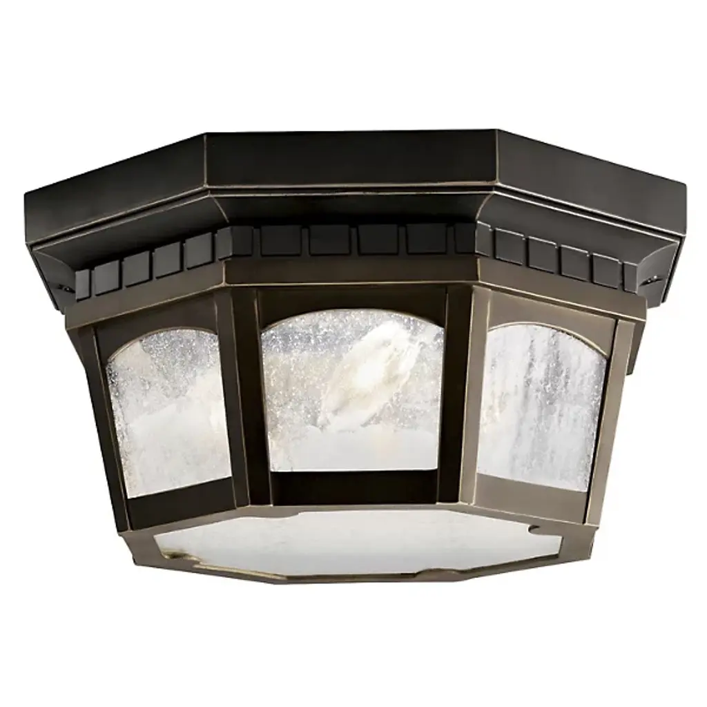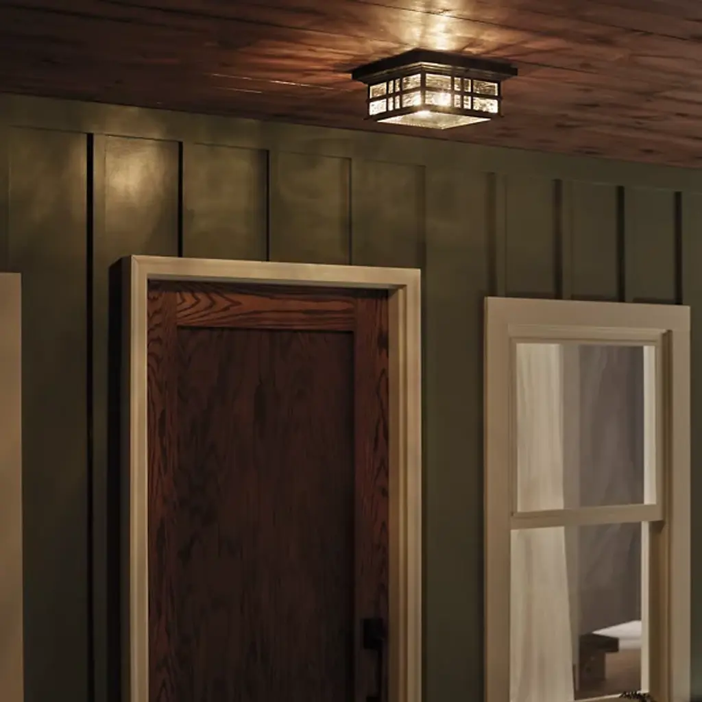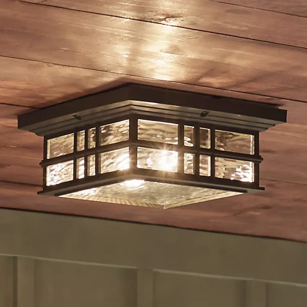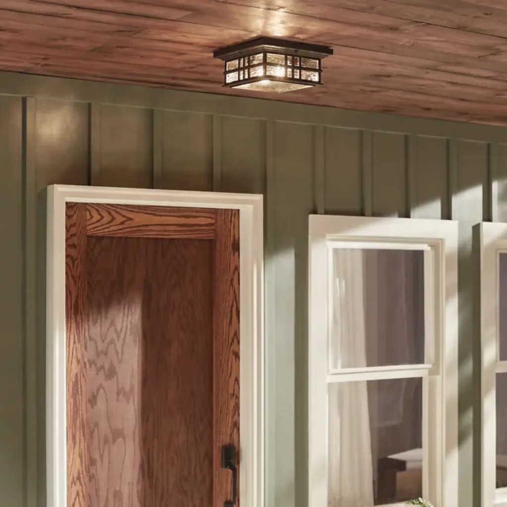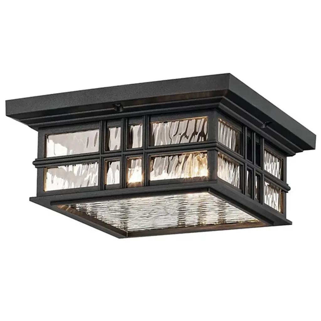 Classic craftsman architecture and contemporary flair meet in the Beacon Square Outdoor Flushmount by Kichler. Clear hammered glass alludes to the surface of the ocean while the matte framing creates a window for its soft, warm light. This fixture is crafted from a special material that is designed to weather harsh outdoor conditions, including UV rays and saltwater spray, making it a durable and lasting lighting solution for decks, outdoor entryways, and the like.