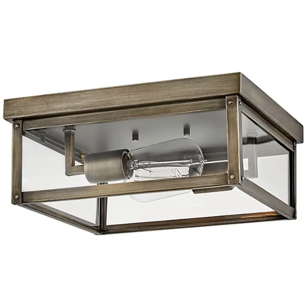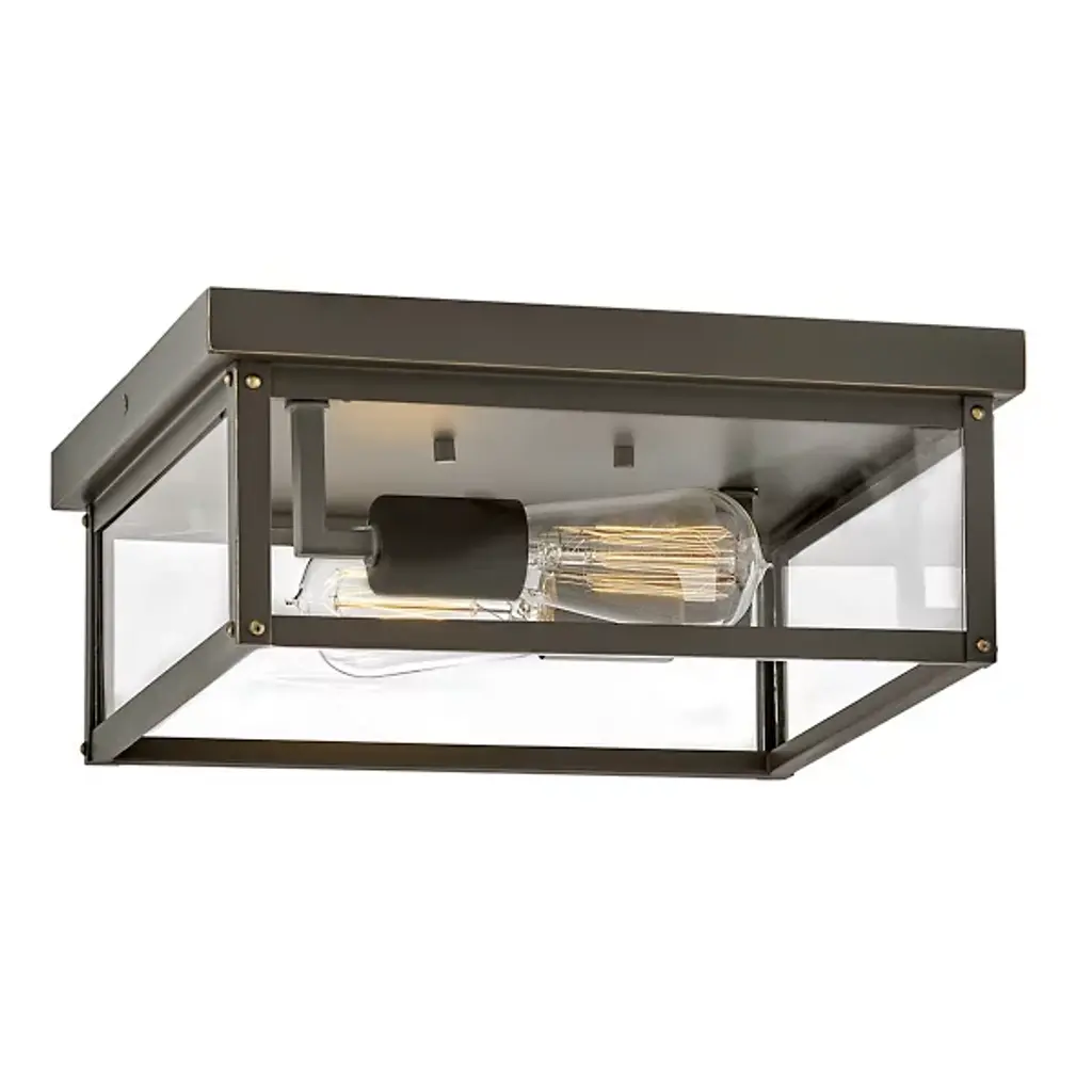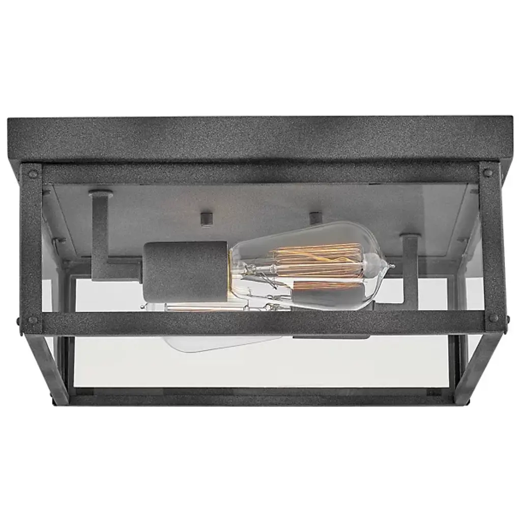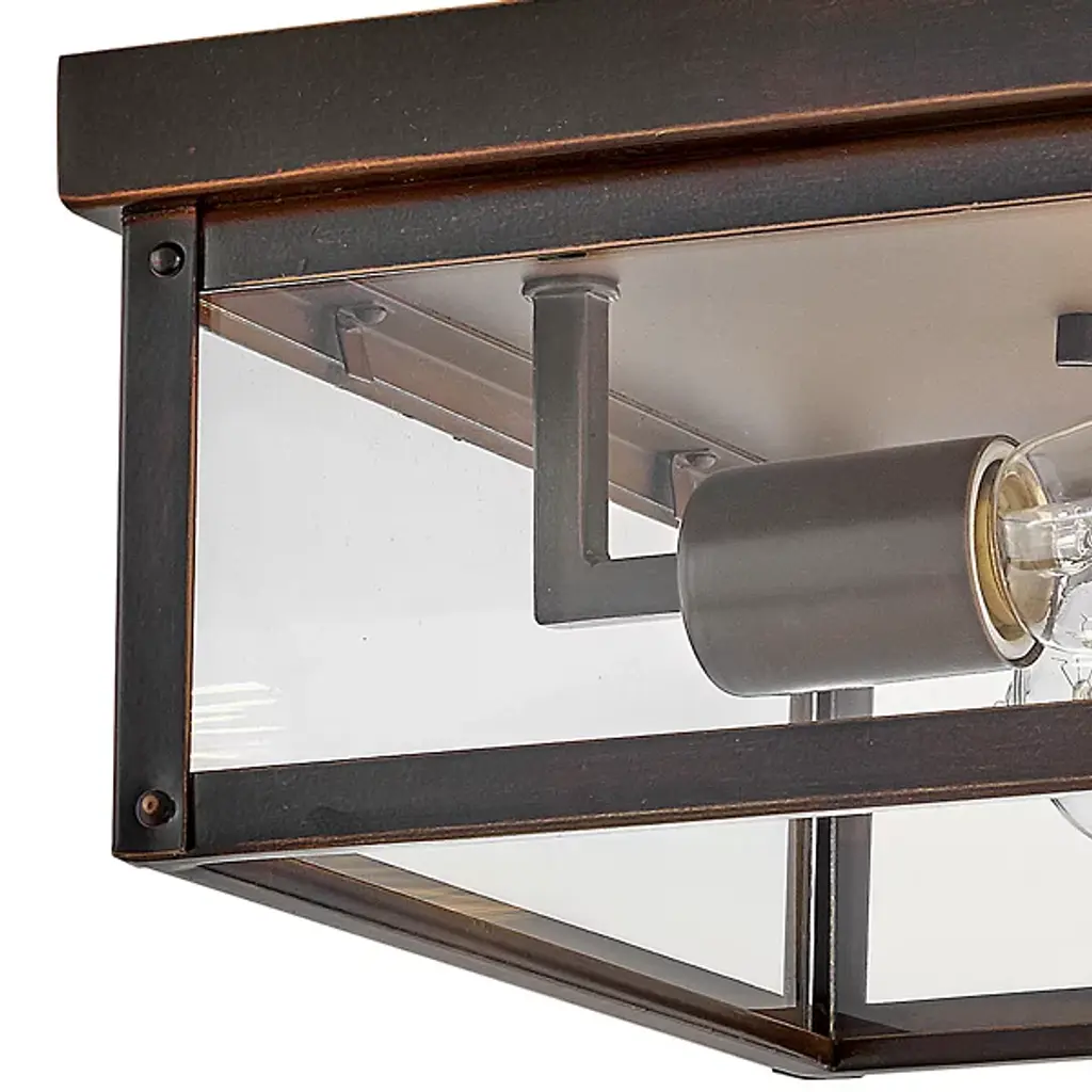 Add appealing illumination to your outdoor environments with the Beckham Outdoor Flushmount from Hinkley Lighting. A tasteful transitional design, this delightful fixture combines a sleek simplicity in its mounting with a more complex combination of angles in its sharp-cornered structure below. A rectangular aluminum canopy secures the fixture, extending two damp-listed sockets best used with vintage bulbs across it in opposing directions, while an angular metal cage and clear glass panels blunt excess brightness from above.