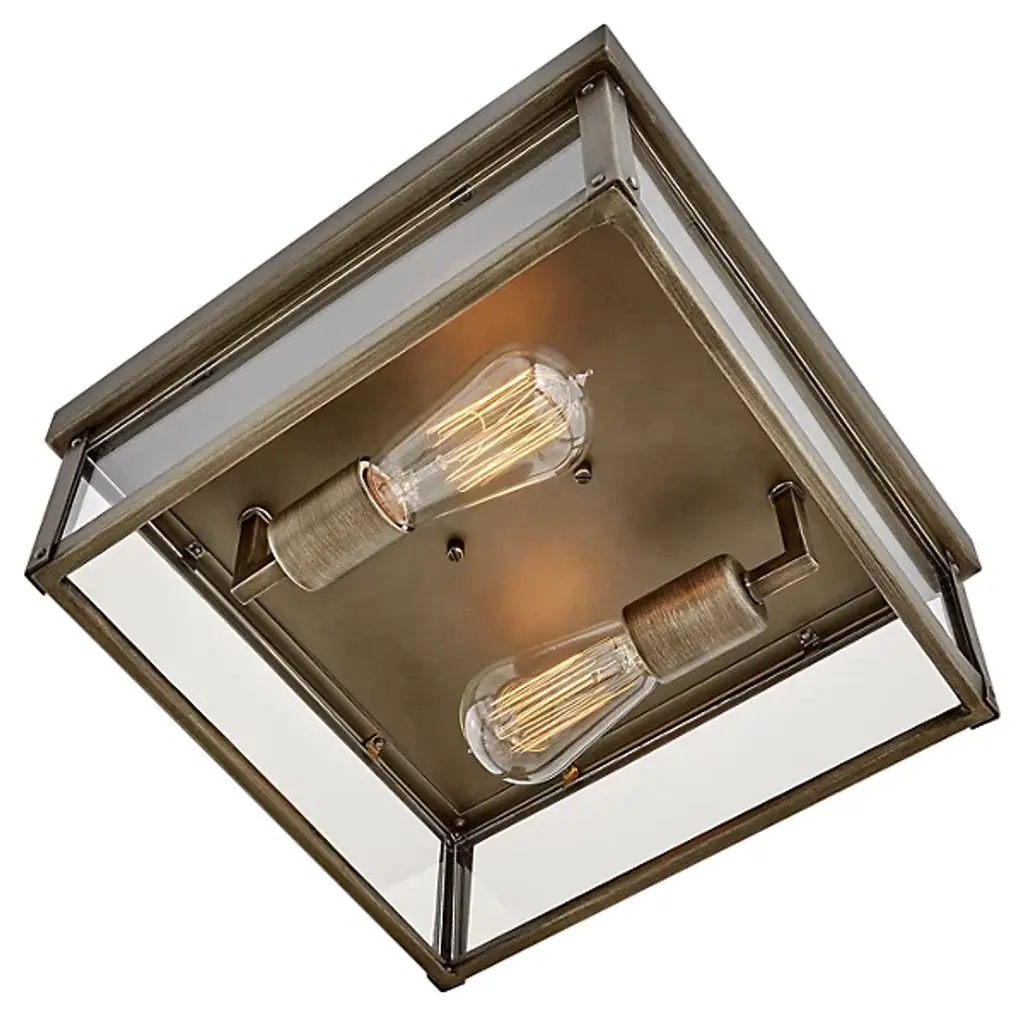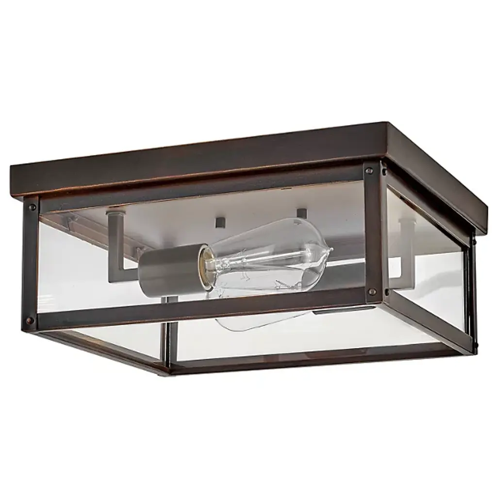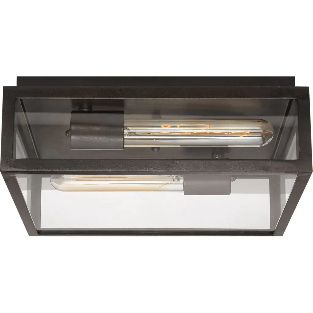 Add appealing illumination to your outdoor environments with the Beckham Outdoor Flushmount from Hinkley Lighting. A tasteful transitional design, this delightful fixture combines a sleek simplicity in its mounting with a more complex combination of angles in its sharp-cornered structure below. A rectangular aluminum canopy secures the fixture, extending two damp-listed sockets best used with vintage bulbs across it in opposing directions, while an angular metal cage and clear glass panels blunt excess brightness from above.