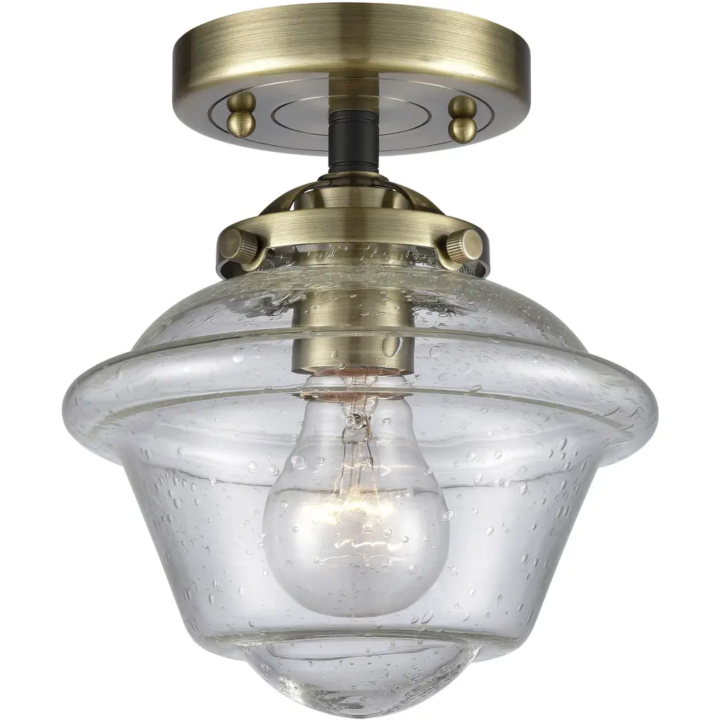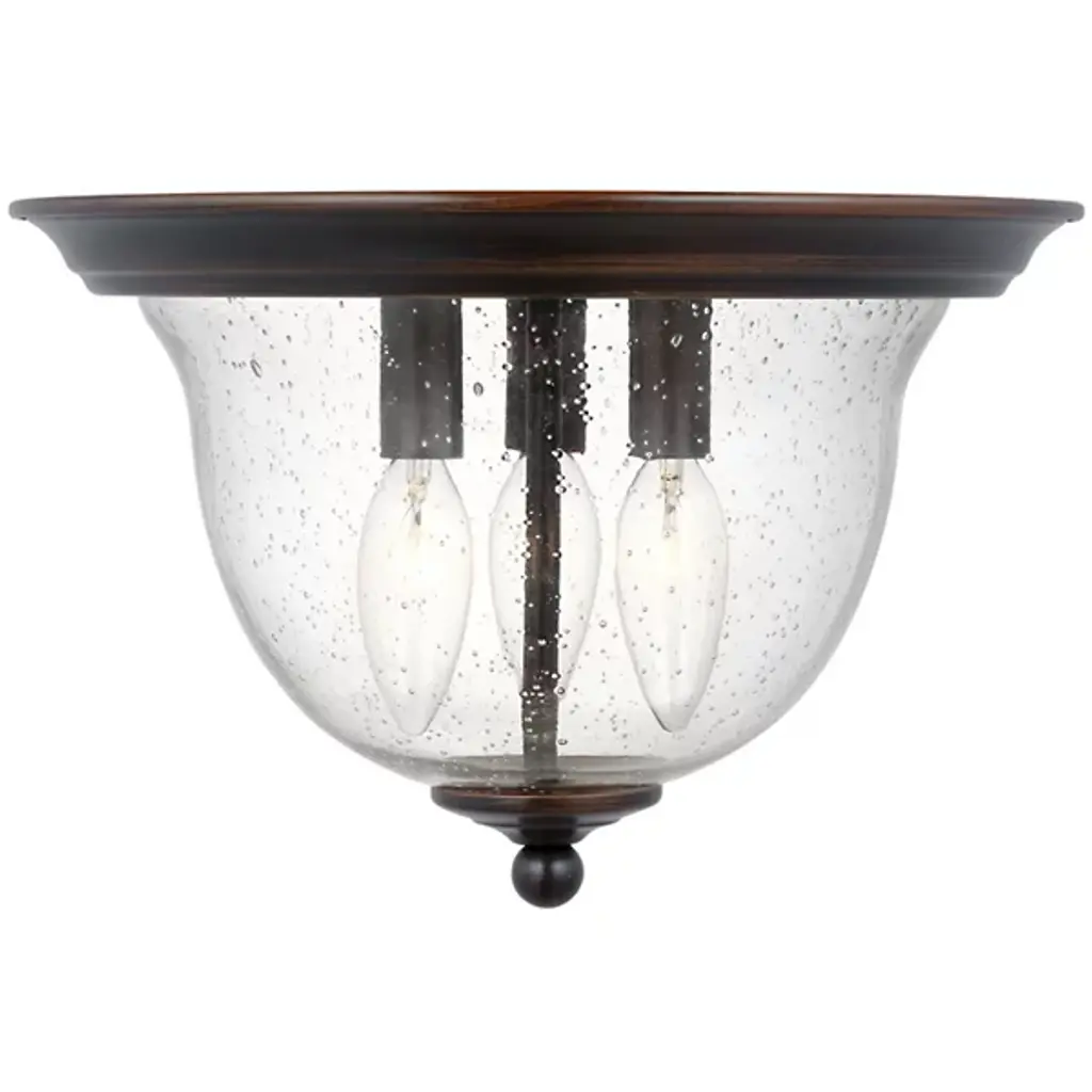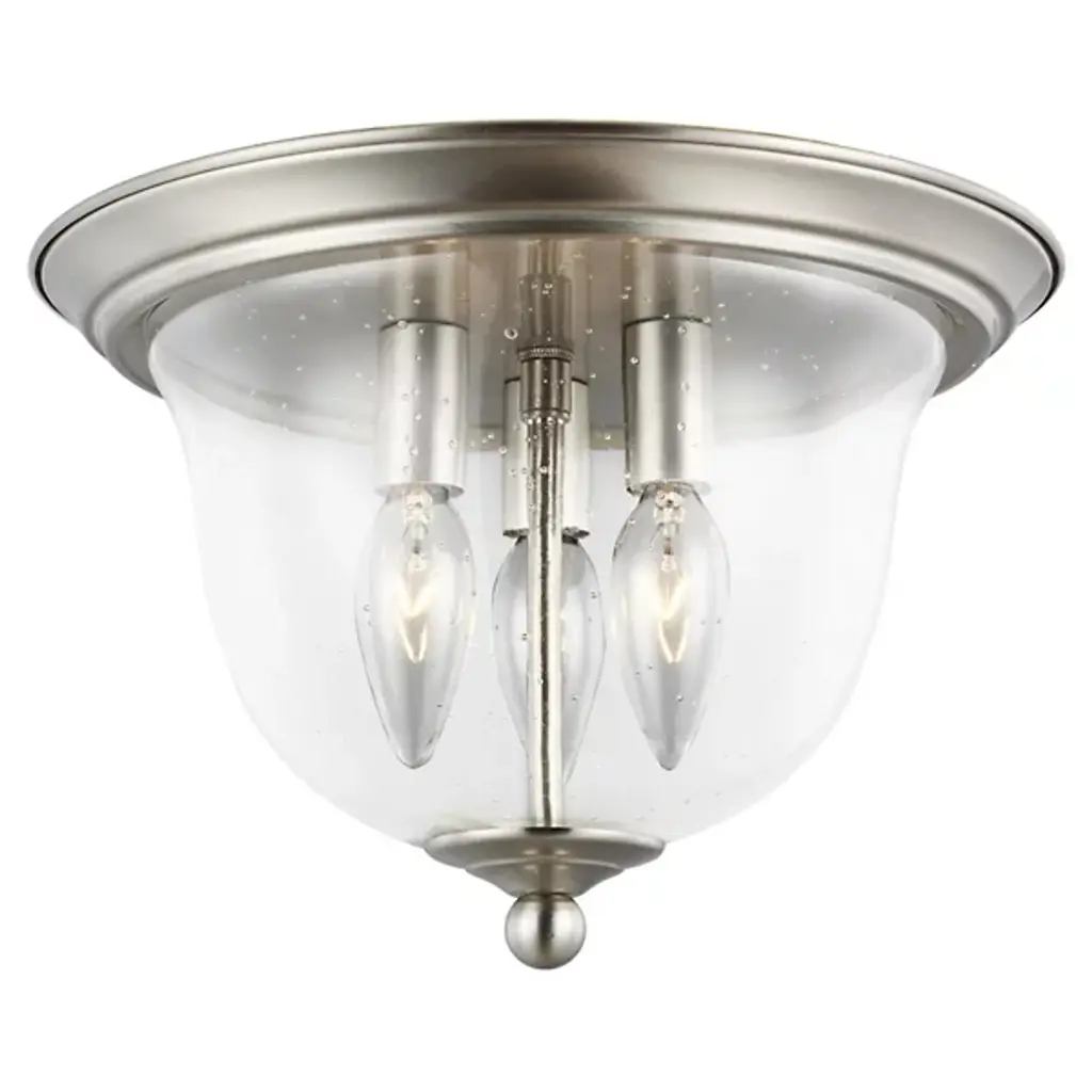 A contemporary cloche-style luminaire. The Belton Flushmount by Generation Lighting, formerly known as Sea Gull Lighting, adds a striking, graceful dimension to the ceiling. A shapely shade crafted from clear seeded glass is juxtaposed with a tiered, round, steel ceiling canopy at the top and finial detail at the bottom for an eye-catching flair. The short stem at the center of this shade is surrounded by candelabra bases facing downwards. When lit, the light diffuses through the glass shade to deliver a warm, even glow that highlights the bubbles on the surface to enhance the visual interest.