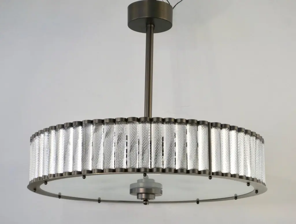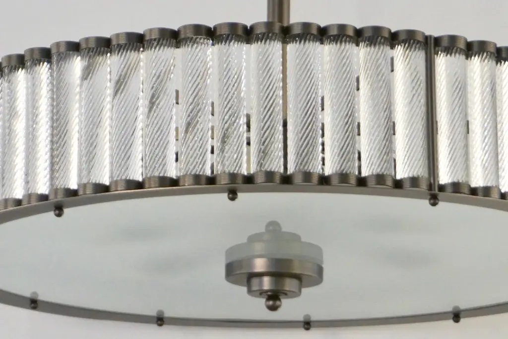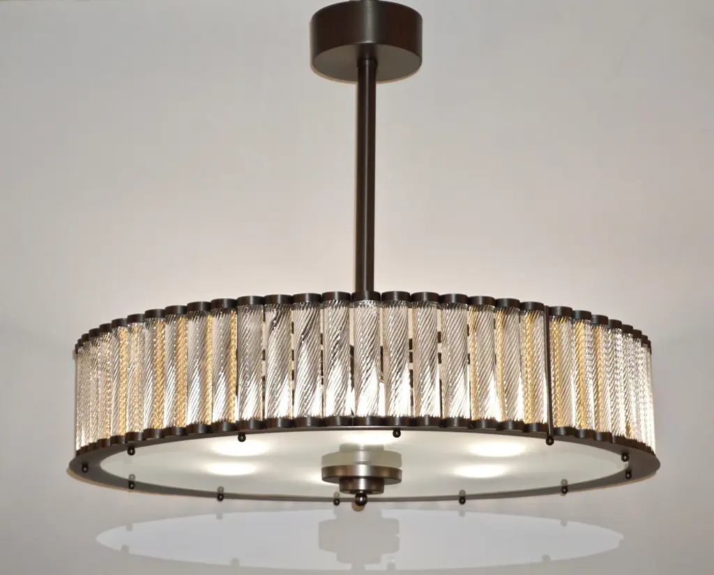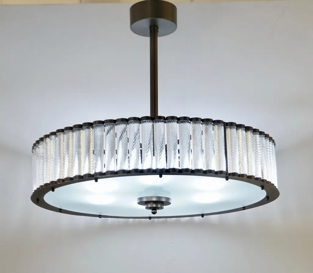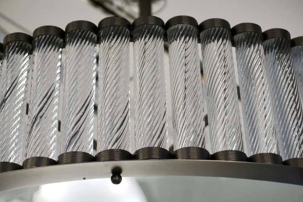 Contemporary Italian Art Deco Design customizable round chandelier/pendant of drum shape, entirely handcrafted, with a dark steel colored metal finish. The nicely scalloped airy brass structure supports crystal clear Murano glass rods, each individually handcrafted in the sophisticated technique Torchon: twisted glass, that not only makes this organic lantern more precious but multiplies the light reflections.High quality of construction and details with 6 sockets in the same finish, a brass decorative ring to enclose the bottom fitted with an elegant frosted Murano glass decorated with a double-stepped finial. Can also be flush mount as the height of the central pole can be shortened or lengthened to requirements.Fitted with 6 Edison base sockets. Height of the sole structure with glass: 6 in. Dimensions of the canopy: 6" Diameter x 2.5" HQuote for polished nickel: $9,950, Contact us for order details
