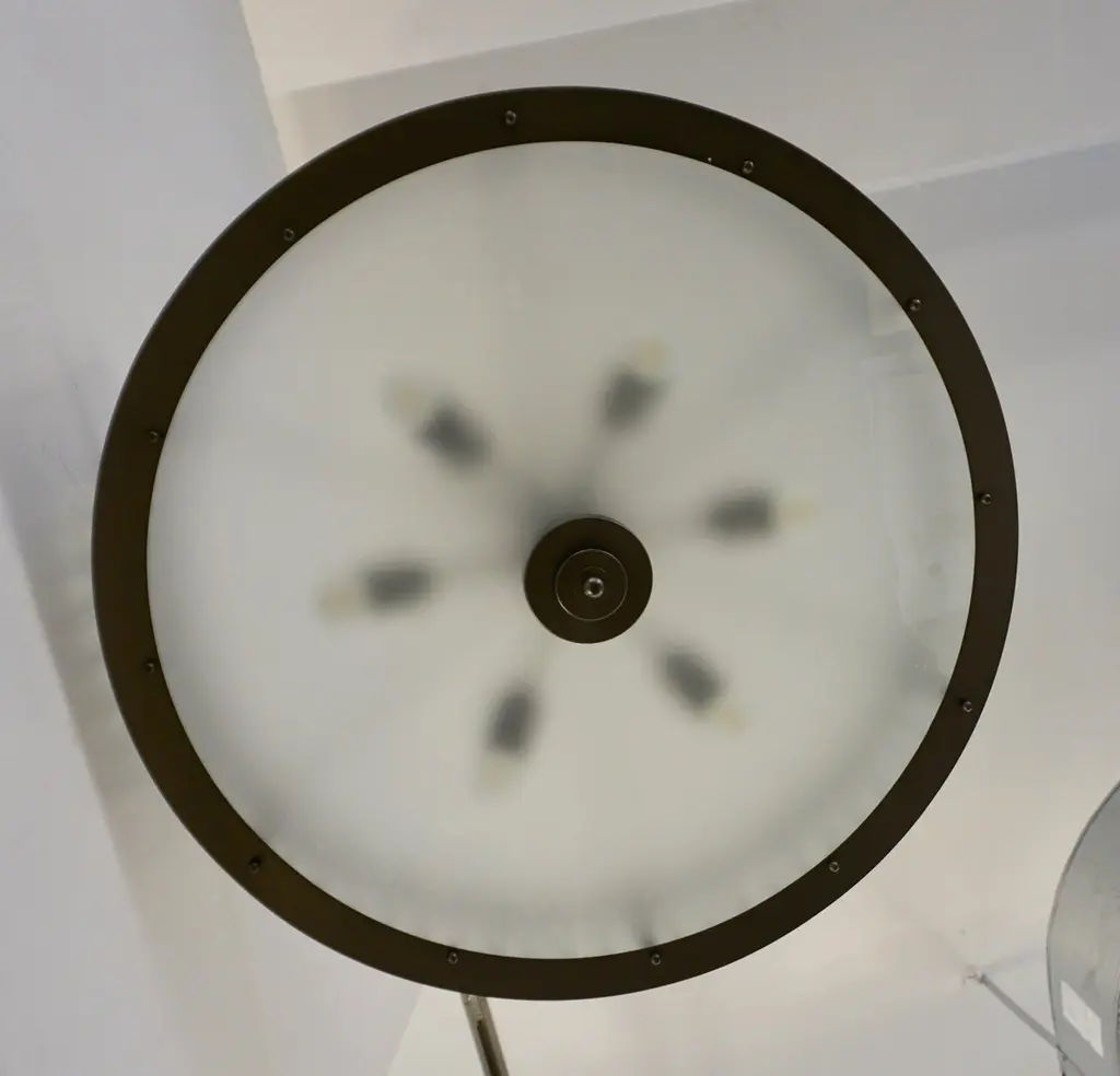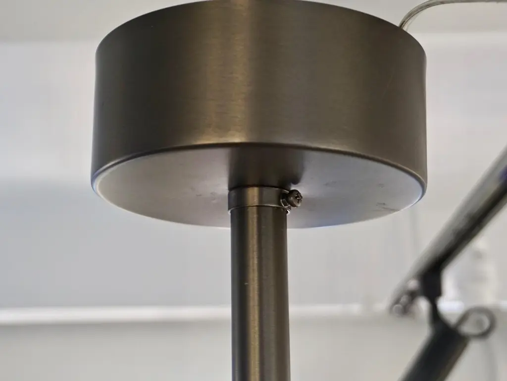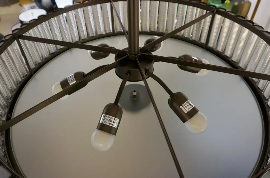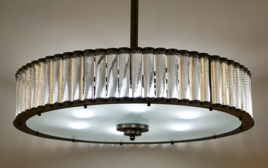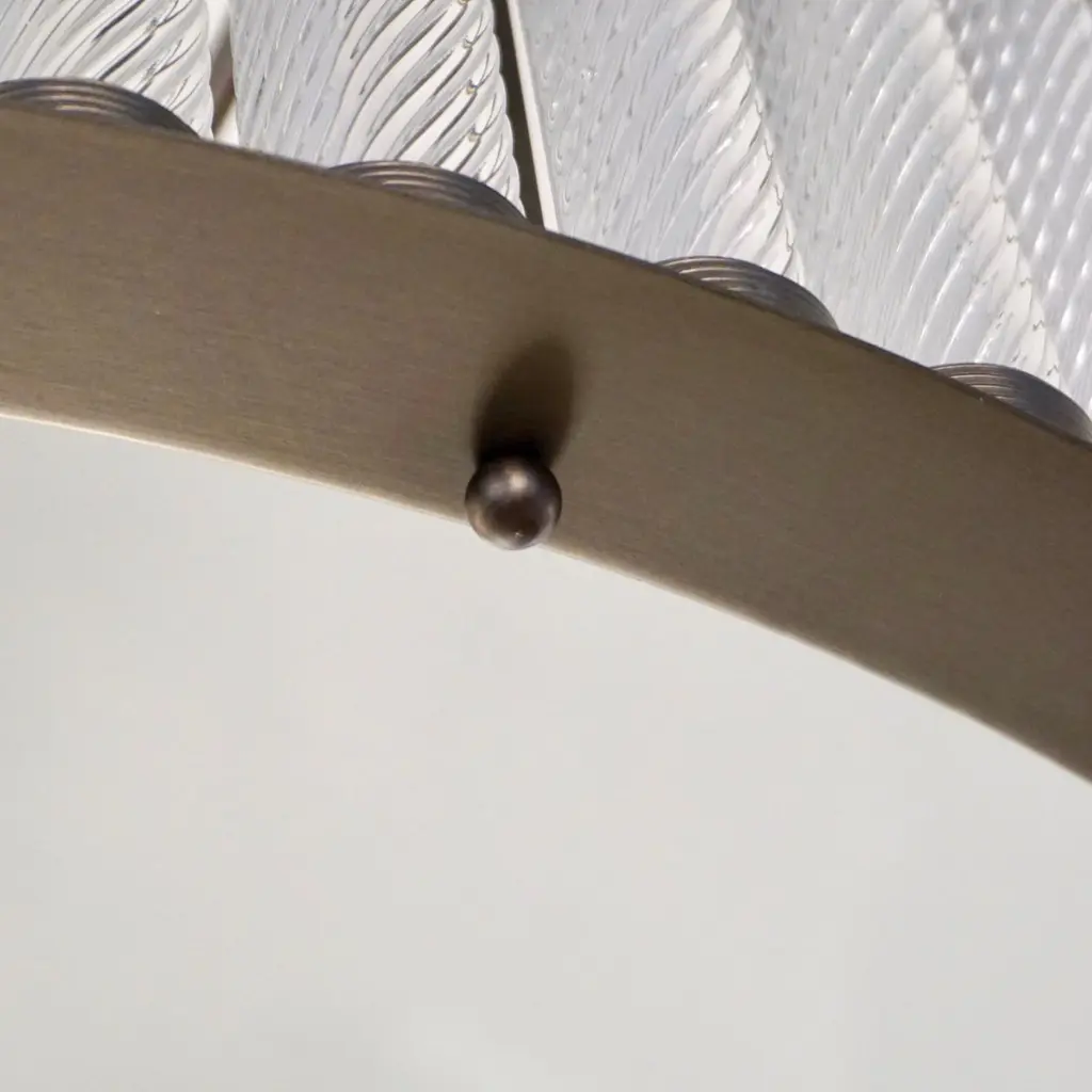 Contemporary Italian Art Deco Design customizable round chandelier/pendant of drum shape, entirely handcrafted, with a dark steel colored metal finish. The nicely scalloped airy brass structure supports crystal clear Murano glass rods, each individually handcrafted in the sophisticated technique Torchon: twisted glass, that not only makes this organic lantern more precious but multiplies the light reflections.High quality of construction and details with 6 sockets in the same finish, a brass decorative ring to enclose the bottom fitted with an elegant frosted Murano glass decorated with a double-stepped finial. Can also be flush mount as the height of the central pole can be shortened or lengthened to requirements.Fitted with 6 Edison base sockets. Height of the sole structure with glass: 6 in. Dimensions of the canopy: 6" Diameter x 2.5" HQuote for polished nickel: $9,950, Contact us for order details