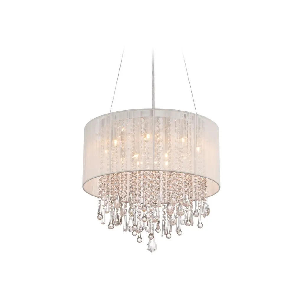 Bring a dramatic focal point to any area of your home with the unique round Beverly Dr. collection convertible ceiling mount's stunning style. Cut and polished crystals are held in place with stainless-steel rings and illuminated by brilliant halogen points of light and graced by a beautiful silk string shade.
