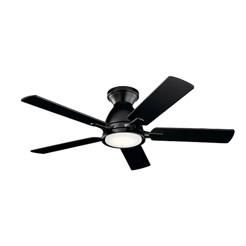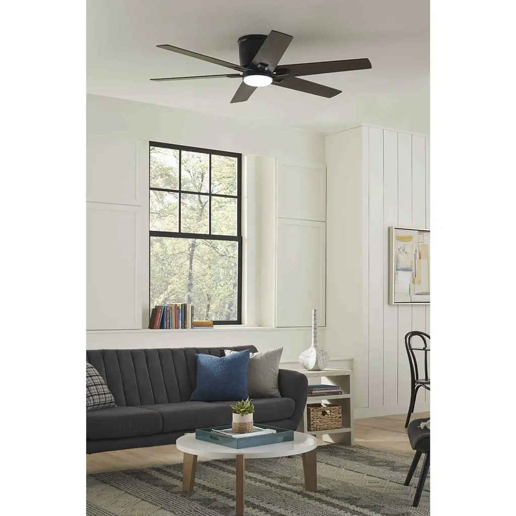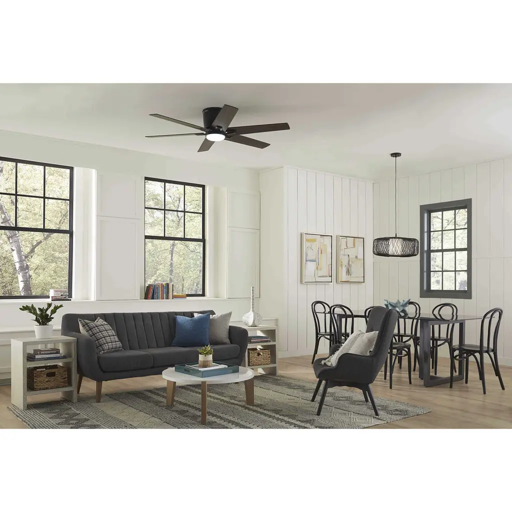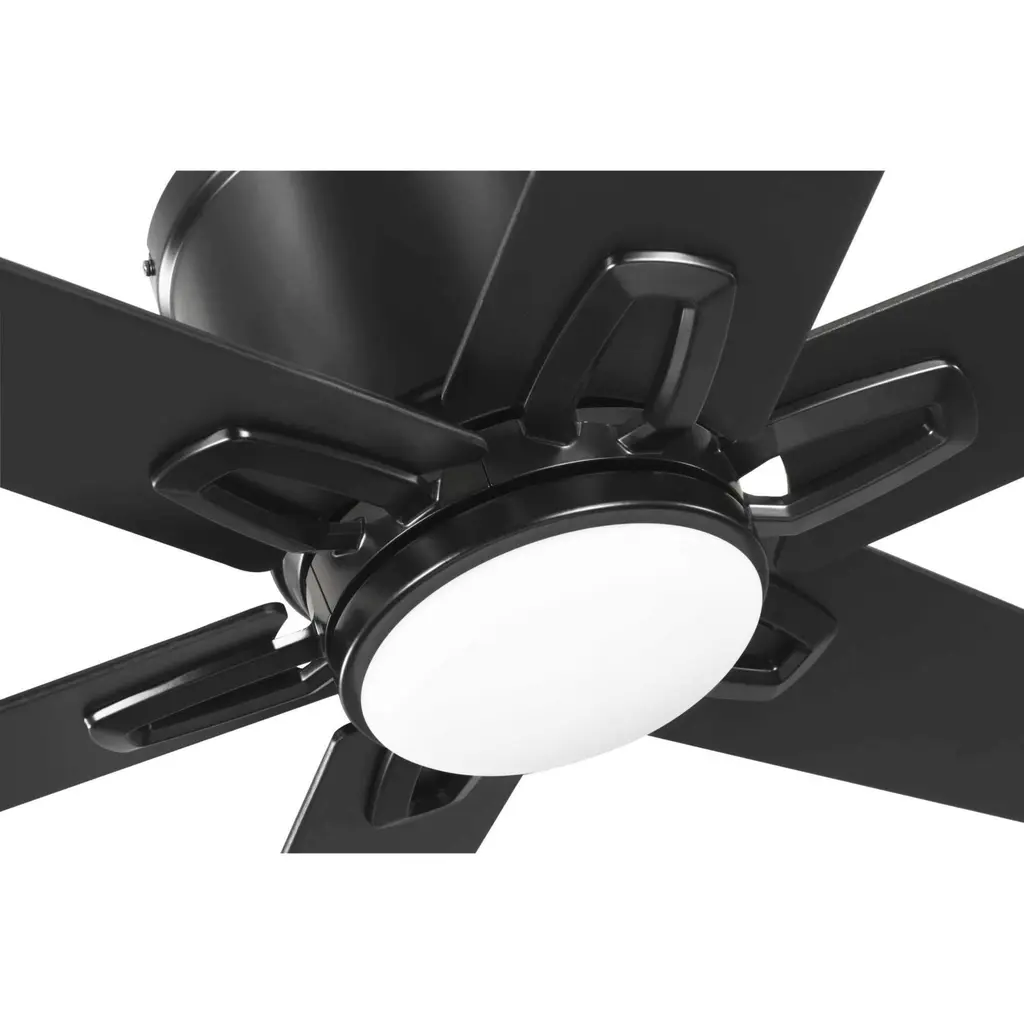 Unique metal detailing on the blades of the Bexar ceiling fans join to form a flower-like pattern, bringing a touch of whimsy to modern farmhouse and transitional settings. This flush mount ceiling fan features six reversible plywood blades and is finished in Matte Black with Distressed Ebony and Matte Black blades. An integrated 18W LED module illuminates the space with soft, 3000K light. It is UL dry for indoor use and includes a full-function, hand-held remote with a wall bracket. .
