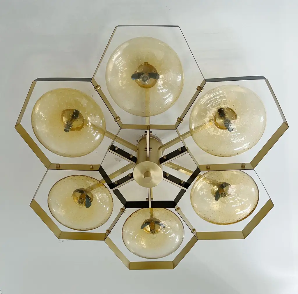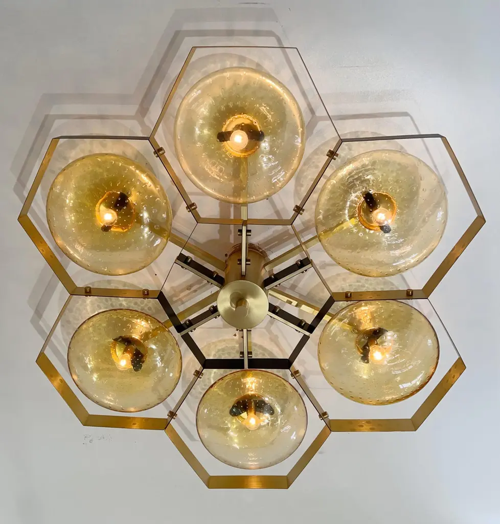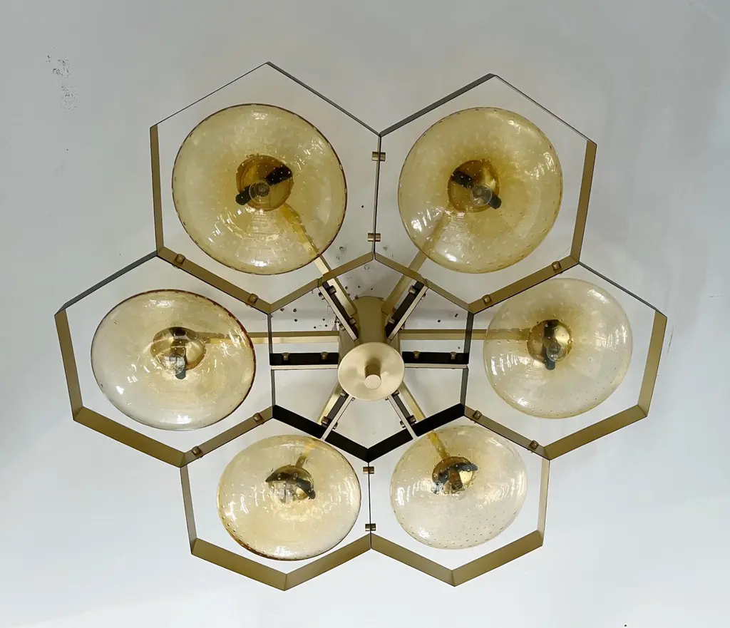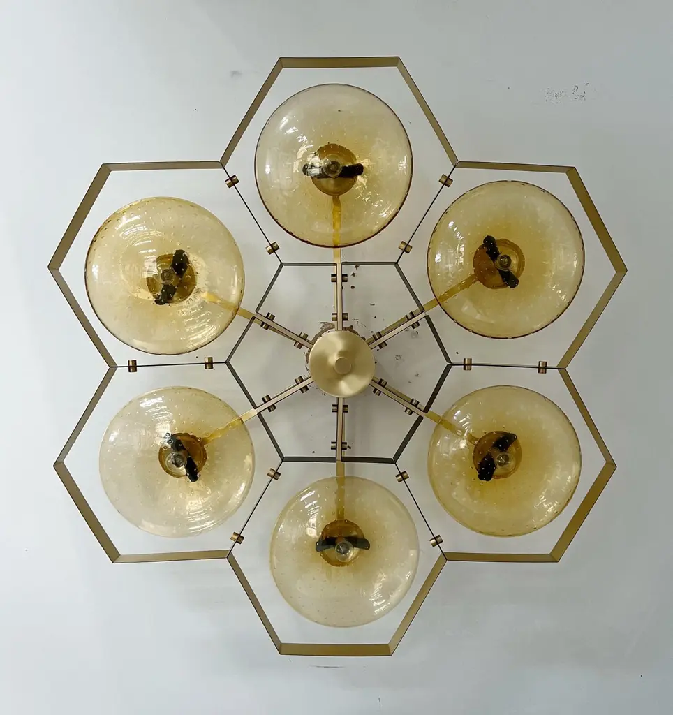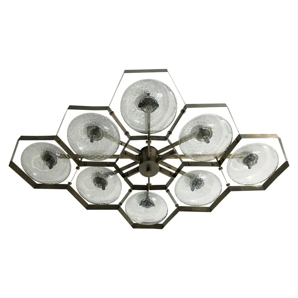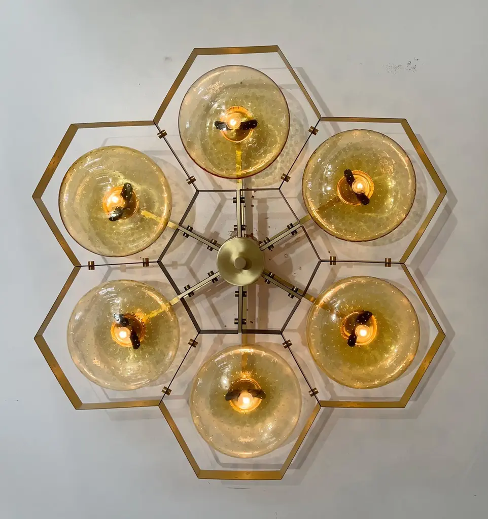 Italian flush mount with Murano glass shades mounted on solid brass frame / Made in ItalyDesigned by Fabio Ltd, inspired by Angelo Lelli and Arredoluce styles6 lights / E12 or E14 / max 40W eachMeasures: Diameter 43 inches / height 10 inchesOrder only / This item ships from ItalyOrder reference #: FABIOLTD HIVE FLUSH MOUNT 6The listed price applies to the following finishes : Bronzed, Polished Chrome, Satin Chrome, Polished Nickel, Satin Nickel, Polished Black Nickel, Satin Black Nickel, Polished Copper, Satin CopperOther finishes are available : Unlacquered Natural Brass, Unlacquered Polished Brass, Lacquered Polished Brass, Lacquered