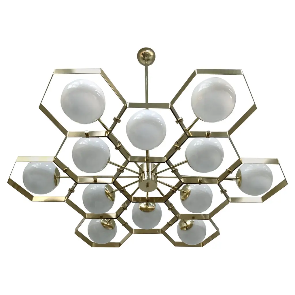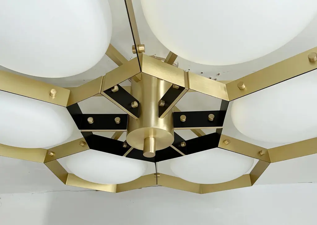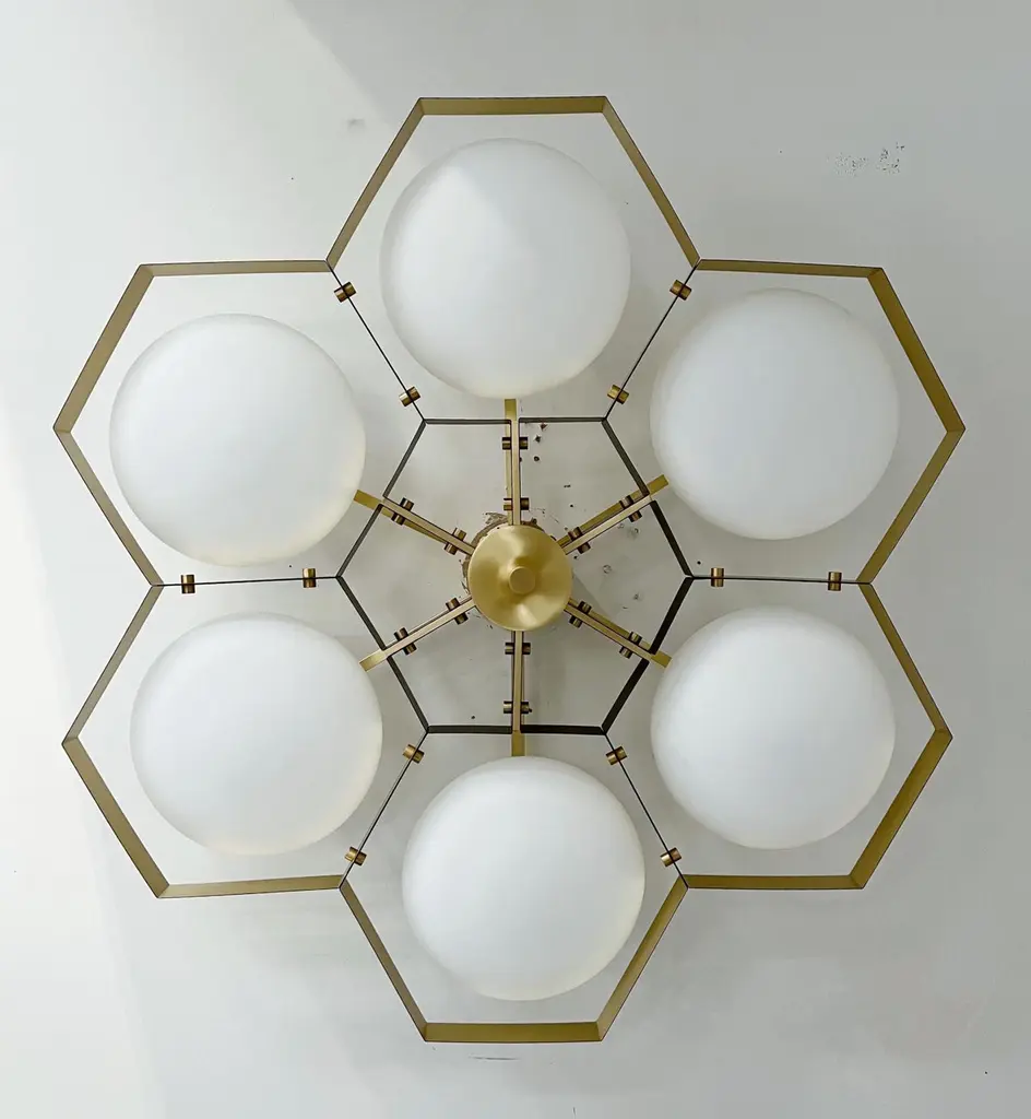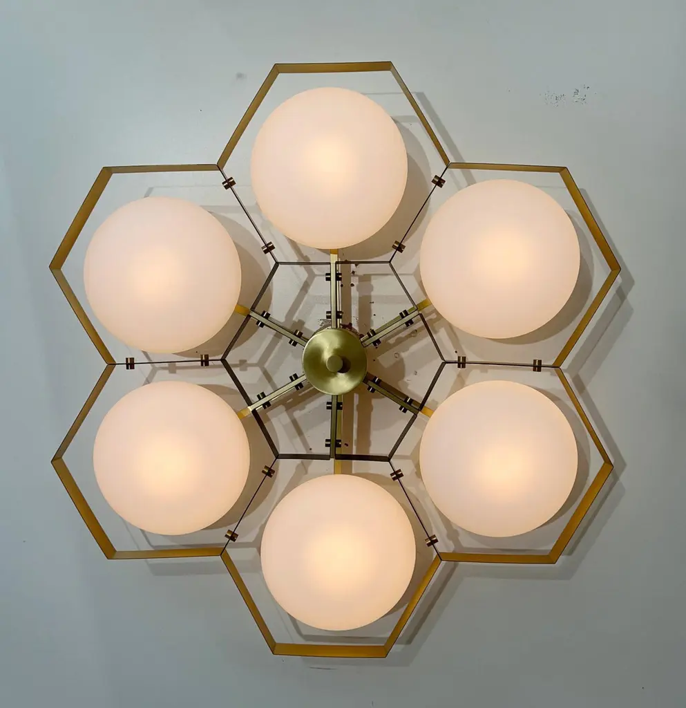 Italian flush mount with Murano glass shades mounted on solid brass frame / Made in ItalyDesigned by Fabio Ltd, inspired by Angelo Lelli and Arredoluce styles6 lights / E12 or E14 / max 40W eachMeasures: Diameter 43 inches / height 10 inchesOrder only / This item ships from ItalyOrder reference #: FABIOLTD HIVE FLUSH MOUNT 6The listed price applies to the following finishes : Bronzed, Polished Chrome, Satin Chrome, Polished Nickel, Satin Nickel, Polished Black Nickel, Satin Black Nickel, Polished Copper, Satin CopperOther finishes are available : Unlacquered Natural Brass, Unlacquered Polished Brass, Lacquered Polished Brass, Lacquered