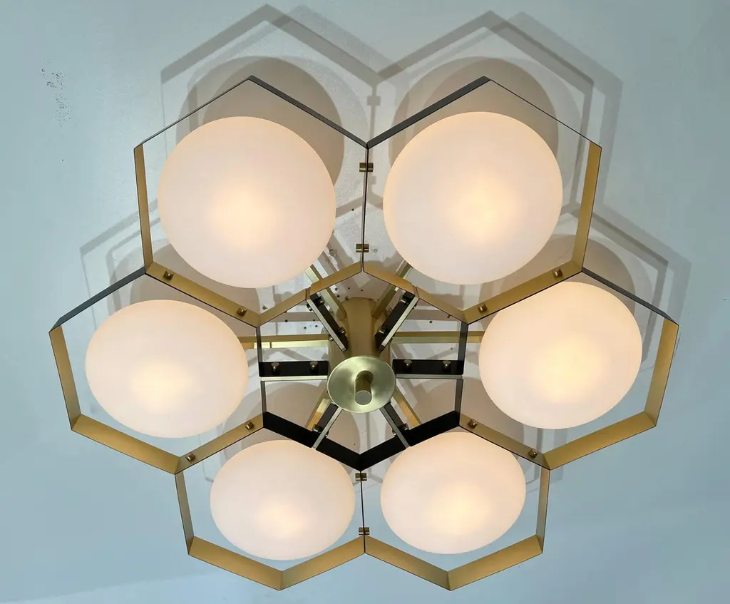 Italian flush mount with Murano glass shades mounted on solid brass frame / Made in ItalyDesigned by Fabio Ltd, inspired by Angelo Lelli and Arredoluce styles6 lights / E12 or E14 / max 40W eachMeasures: Diameter 43 inches / height 10 inchesOrder only / This item ships from ItalyOrder reference #: FABIOLTD HIVE FLUSH MOUNT 6The listed price applies to the following finishes : Bronzed, Polished Chrome, Satin Chrome, Polished Nickel, Satin Nickel, Polished Black Nickel, Satin Black Nickel, Polished Copper, Satin CopperOther finishes are available : Unlacquered Natural Brass, Unlacquered Polished Brass, Lacquered Polished Brass, Lacquered