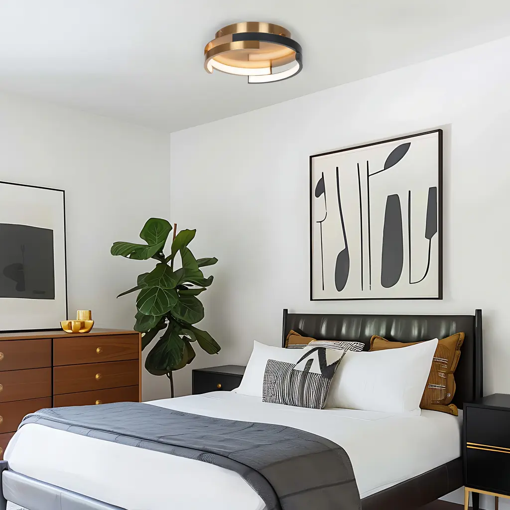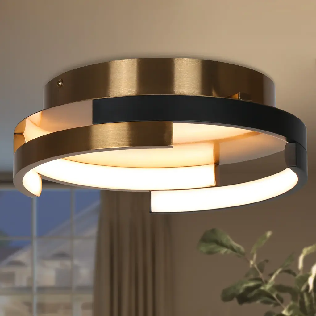 The LED ceiling light is designed in a circular shape for a luxurious and elegant look. The flush mount ceiling light is crafted from metal in black and electroplated copper finish, bringing a simple and stylish touch to your bedroom, living room, etc. Whether it is a single installation or multiple combined installations, it will be a bright light.Features:High-quality materials: The lamp body is made of high-quality metal with a black and electroplated copper finish, which is sturdy and durable.Built-in LED: The ceiling light has a built-in LED source, good color rendering, high brightness, energy-saving and electricity-saving, soft light, and no damage to the eyes.Dimmable: Compatible with dimmer (Dimmer is not included). LED lights are much brighter than traditional lights of the same wattage, so kindly suggest using an LED-compatible dimmer to create a comfortable atmosphere.Wide application: This modern ceiling light is ideal for kitchens, living rooms, corridors, restaurants, foyers, bedrooms, and cafes lighting your space with refraction.Easy to install: The flush mount lighting is pre-assembled, you just need to wire it. It is easy and convenient.Specifications:Finish: Black and electroplated copperStyle: Modern, glam, stylishColor temperature: 3045 K, Warm WhiteWattage: 25 WLumen: 525 LMCRI up to 90Overall: 12" D x 3.5" HCanopy: 9.5" D x 1.8" H