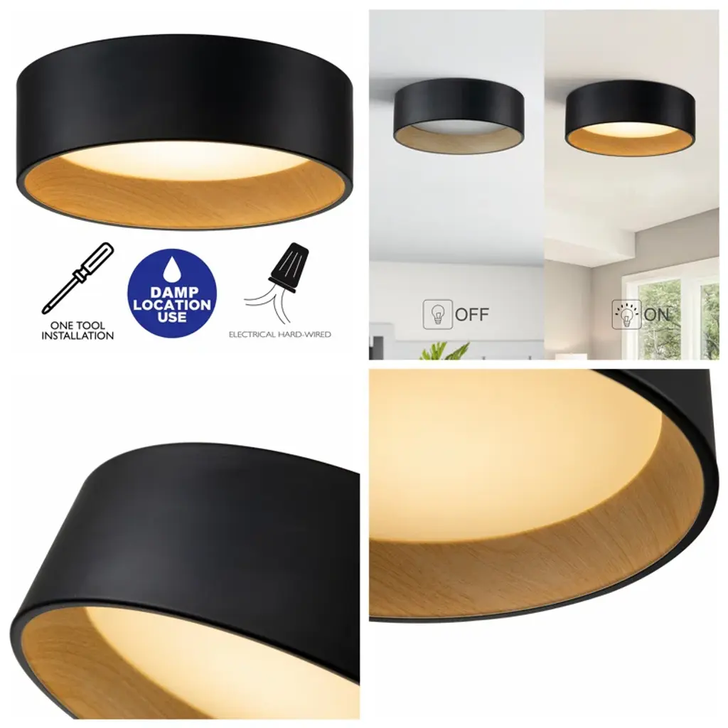 Simply sleek. Our unique flush mount light with a minimalist design features a circular iron base in a black tone, complemented by a natural wood grain interior. The acrylic shade filters light for a soothing ambient glow that's dimmable to match your mood. With a hanging height of 3.75", this fixture is perfect for smaller spaces and damp locations like bathrooms with steamy showers. The hidden LED bulb is included for added convenience. Wipe clean with a dry cloth for easy maintenance.