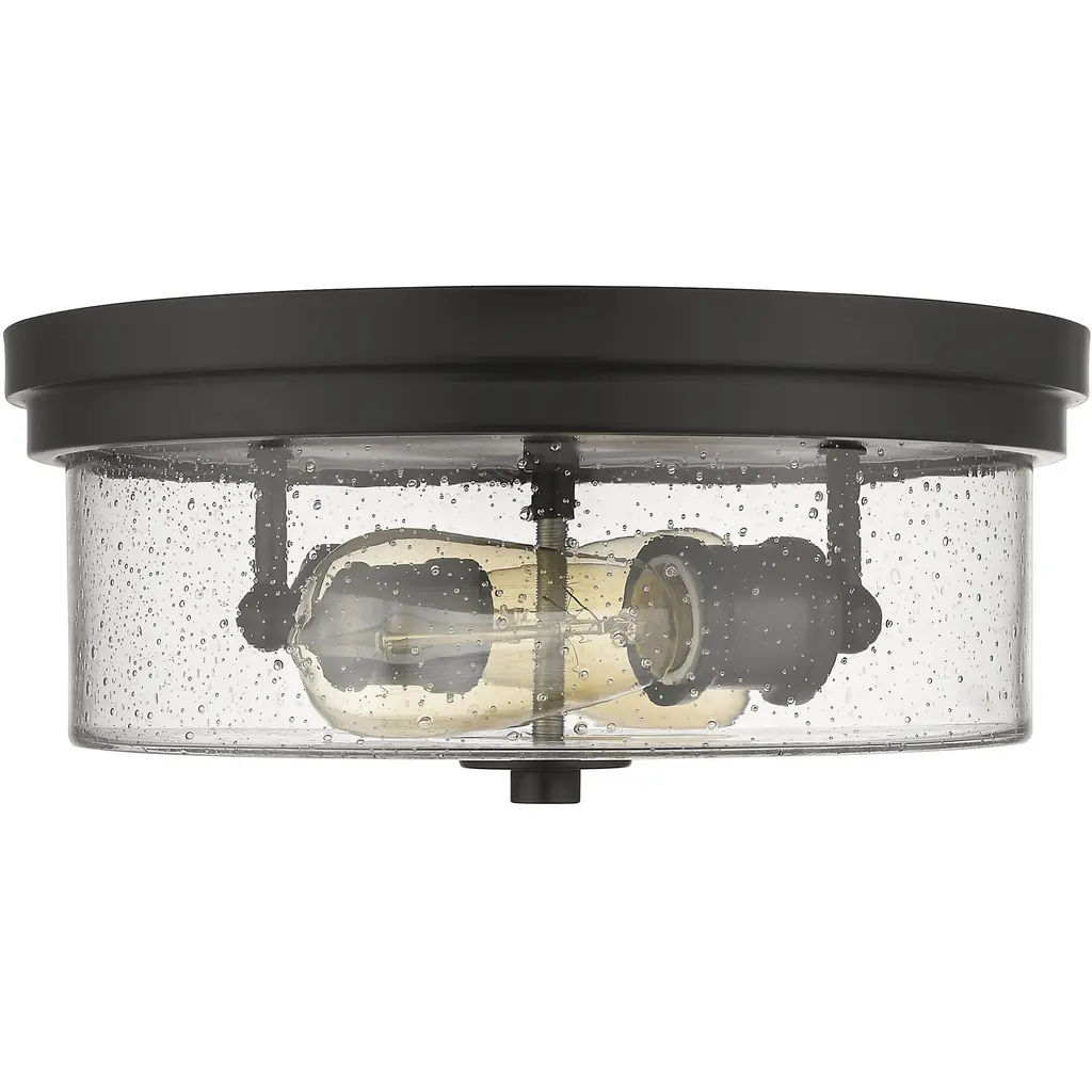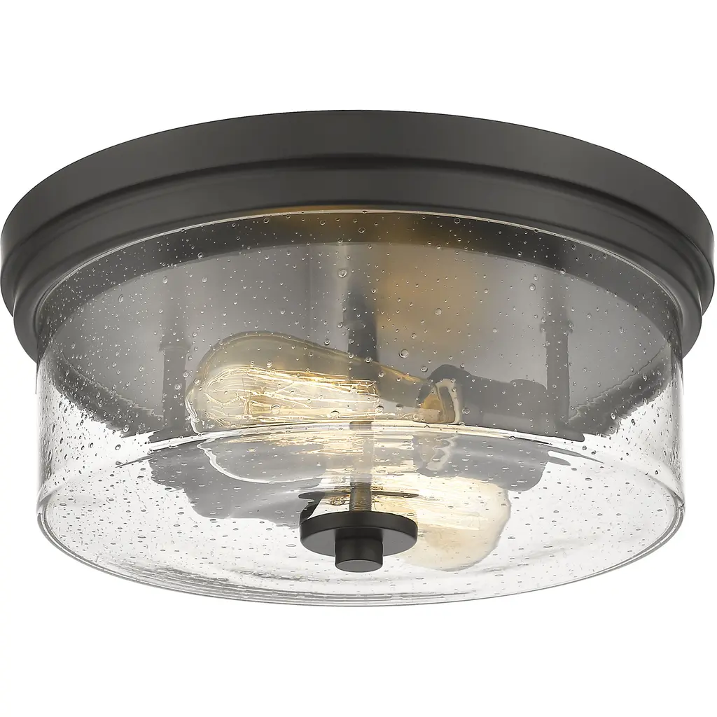 An artful blend of matte black finish steel and clear seedy glass creates a compelling look for both contemporary and transitional spaces. With classic Art Deco appeal, this two-light flush mount ceiling light delivers the perfect motif compromise and weaves into a tasteful overall design scheme.