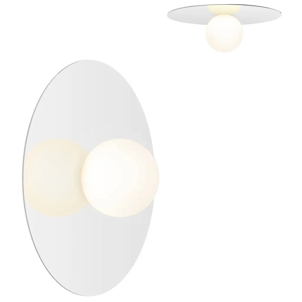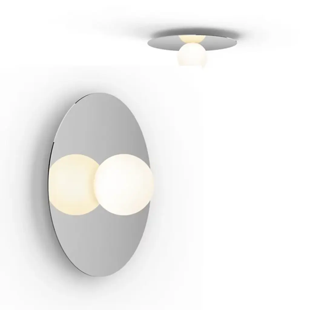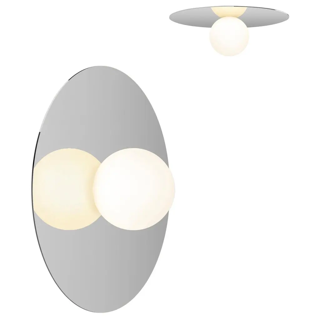 A study in refined simplicity, Bola Disc Flush offers a magical combination of mirror and globe refined down to its bare essentials. The objective with the Bola Disc Flush is to provide both direct and reflected light from either ceiling or wall mounted vantage points. Bola Disc Flush brings elegance and refinement with four sizes and four finishes in white, brass, rose gold, or chrome. An ideal fixture for adding diffused and reflected light in hallway corridors, nooks, dining settings, bedrooms, or living areas. Stunning groupings can also be created by mixing different sizes and finishes together to form unique custom light displays.Specifications:Voltage: 120V, 240V, or 277V 50/60HzPower consumption: 8W (18”)Color temperature: 2700KLuminosity: 640 Lumens (18”)Luminaire efficacy: 57 Lumens/WattColor rendition index: 95 CRILight source: Custom LED high-output chip on boardLight control: Hard-wired Dimmable (ELV or 0-10V dimmer recommended)50K hour lifespanMaterials:Aluminum or SS disc, opal glass globe, steel canopy.