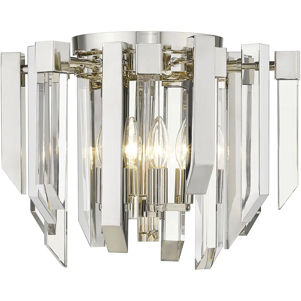 Add some sparkle to a hallway or foyer with this exquisite, clear crystal flush mount ceiling light. This stunning fixture flaunts four glowing lights that glisten and gleam against the dazzling crystal shade and shining polished nickel frame.