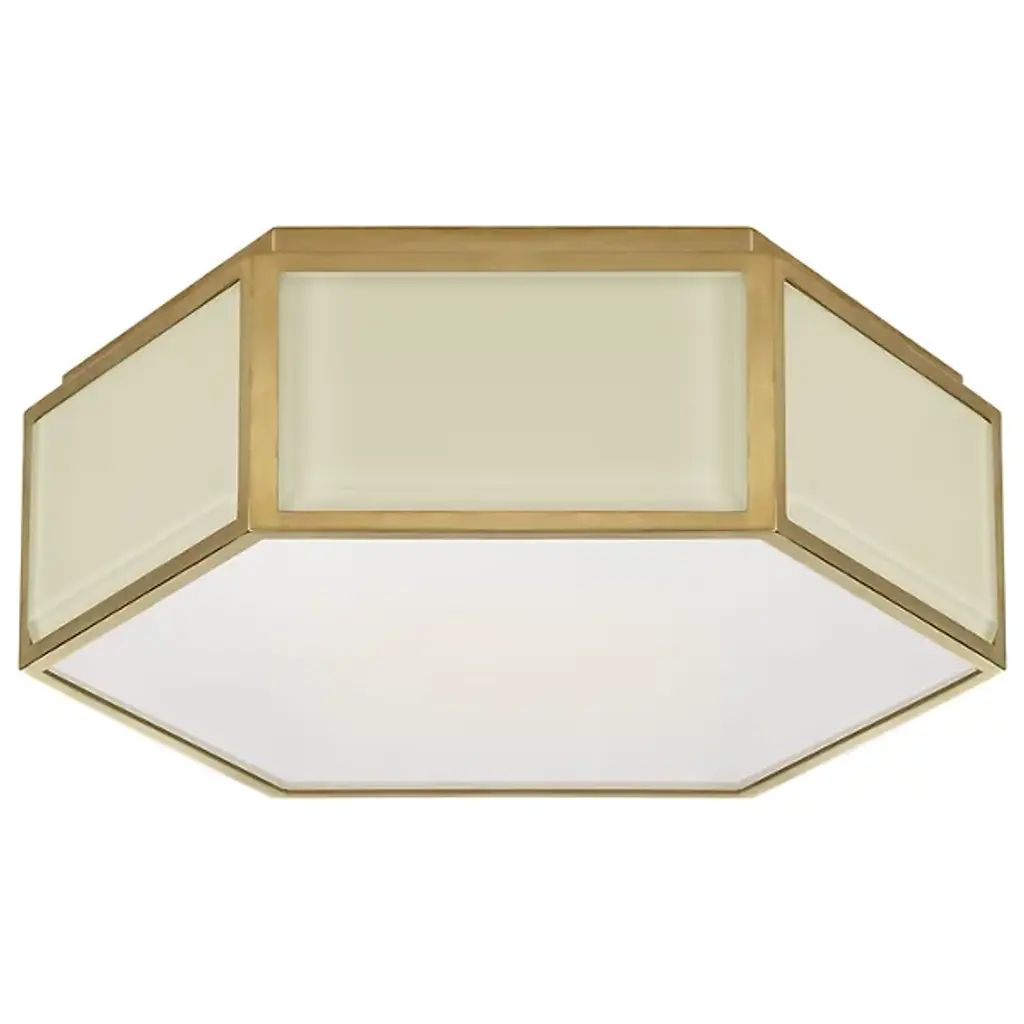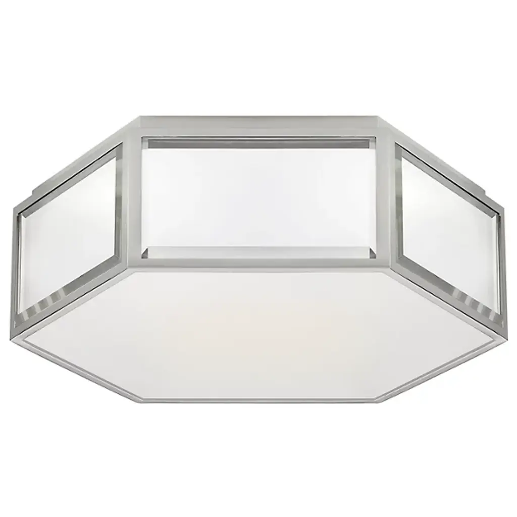 The Bradford Hexagonal Flushmount by Visual Comfort Signature, formerly known as Visual Comfort, has a well-structured design that reflects the traits of modern style. Its hexagonal profile is surrounded by rectangular, stylized panels that, together, create a geometric pattern. Each panel comes to life once the fixture is lit, and the frosted glass radiates light throughout the structure and onto the space below.