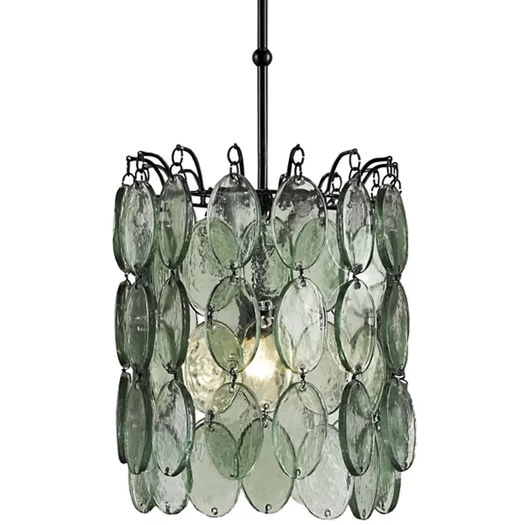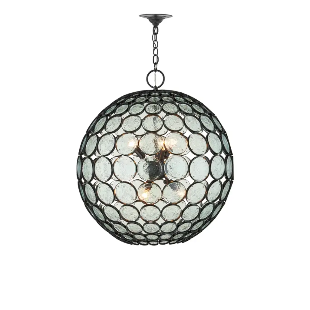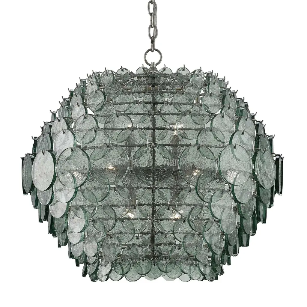 Recycled glass discs dangle from the Braithwell Chandelier to form a textural shade. The discs vary in size and overlap on the wrought iron frame in a silver Granello finish to turn this glass chandelier into a mottled mosaic. We also offer the Braithwell in a flush-mount. Ships In 7-10 Business Days This image is for illustrative purposes only. The colors shown are accurate within the constraints of lighting, photography, and the color accuracy of your screen.
