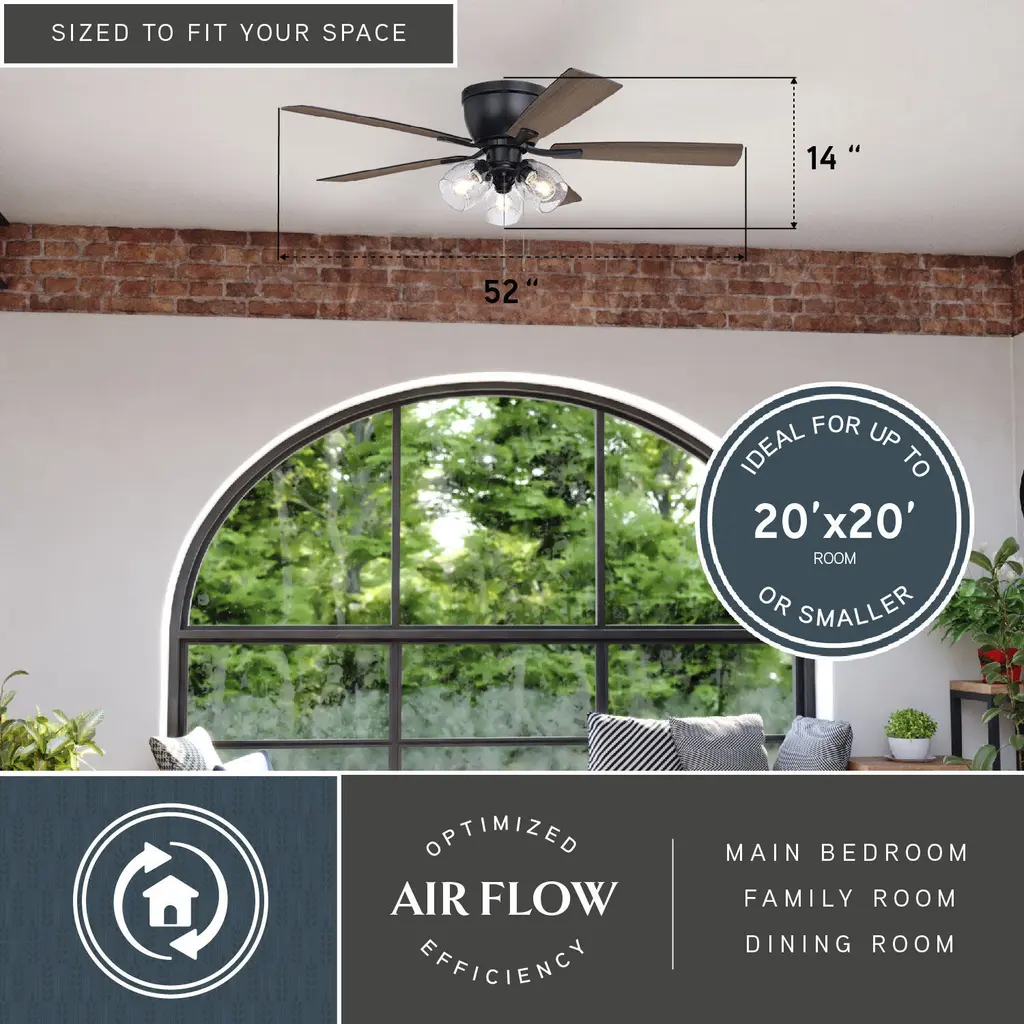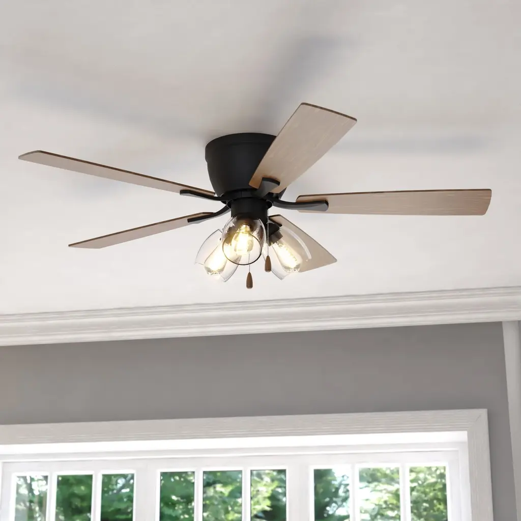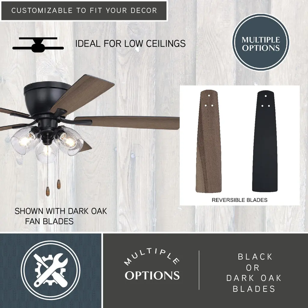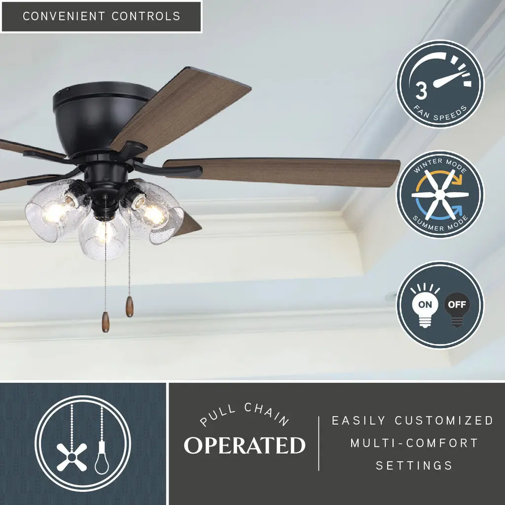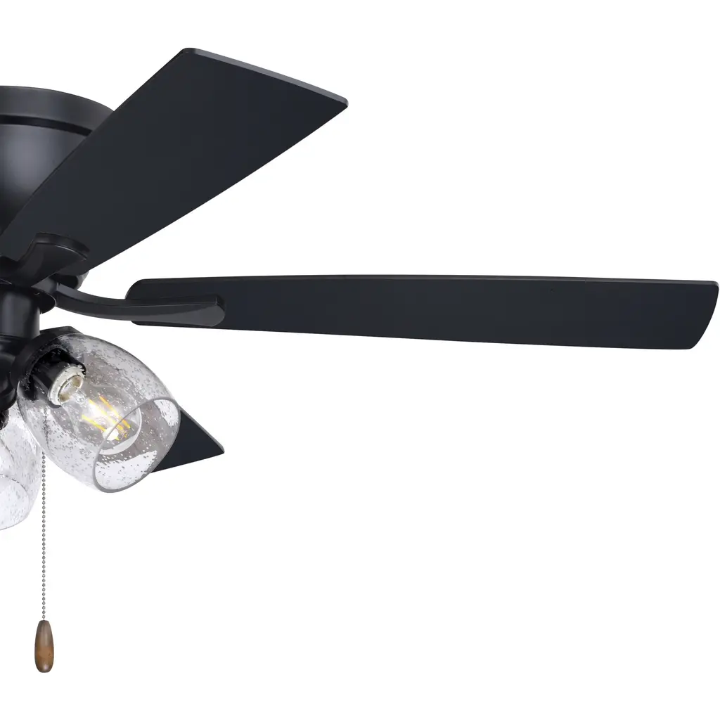 The Brayton ceiling fan in a black finish is transitional styling with a modern look and good value price. The light kit features three distinct clear seeded glass shades and includes clear LED bulbs. Attractive reversible black or dark oak blades allow you to coordinate with any decor. A pull chain makes it easy to control the three speeds. The flush mount motor housing is ideal for low ceilings and standard height rooms. This fan is perfect for your living room, bedroom, kitchen, or home office. Can be alternatively installed without the light kit.
