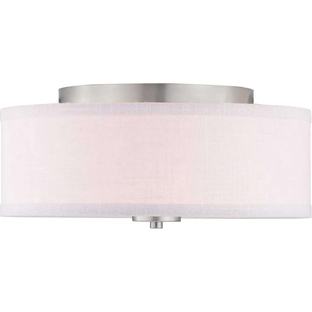 Harkening back to a simpler time, the Briscoe Collection freshens traditional forms with flowing lines. The two-light flush mount fixture features an etched glass diffuser with a summer linen shade finished with Brushed Nickel details. This fixture is suitable for a variety of design styles, including Modern, Traditional and Farmhouse and the simple design is a perfect complement to a variety of fixture collections.