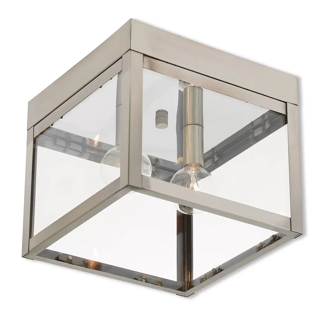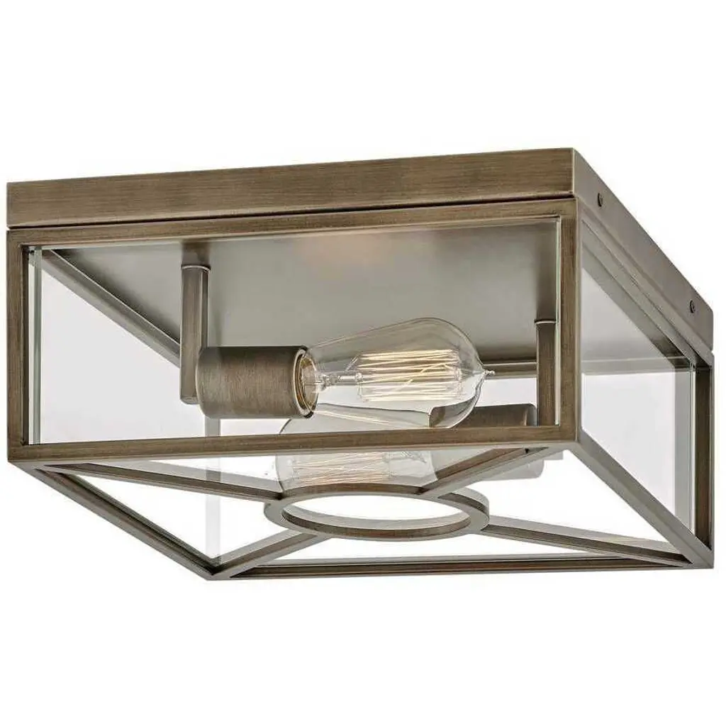 Match the sharp architectural lines of your home with the Brixton Outdoor Flushmount from Hinkley. The piece is ideal for low ceiling porches and patios, thanks to its tight construction. It offers rust and corrosion-resistant properties. The geometric structure is simple and handsome. An x-shaped design at the base focuses the eye on the bulbs inside. Clear glass panels add a crisp note that resonates with the lights turned on. With filamented bulbs, the sharp modern silhouette gets a classic texture and warmth. The bulbs generate a comfortable, inviting ambient light.