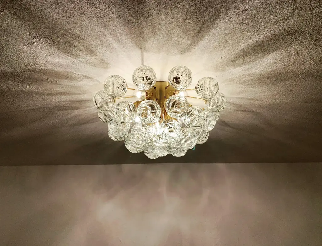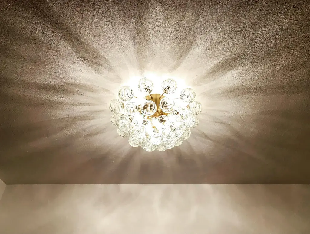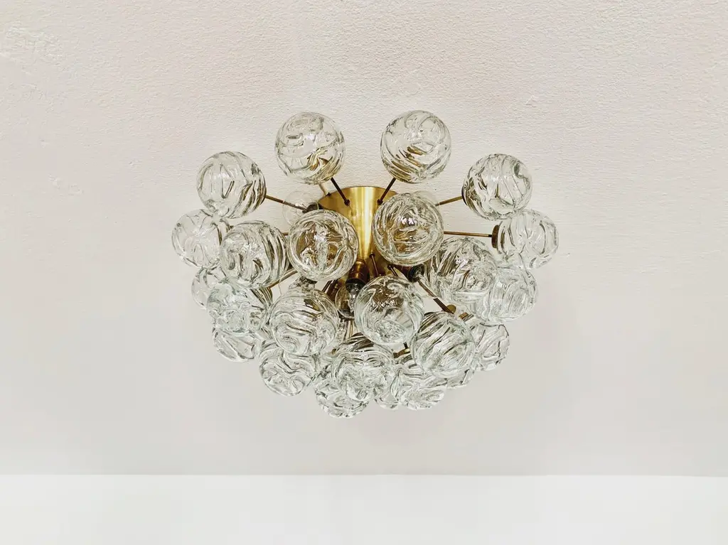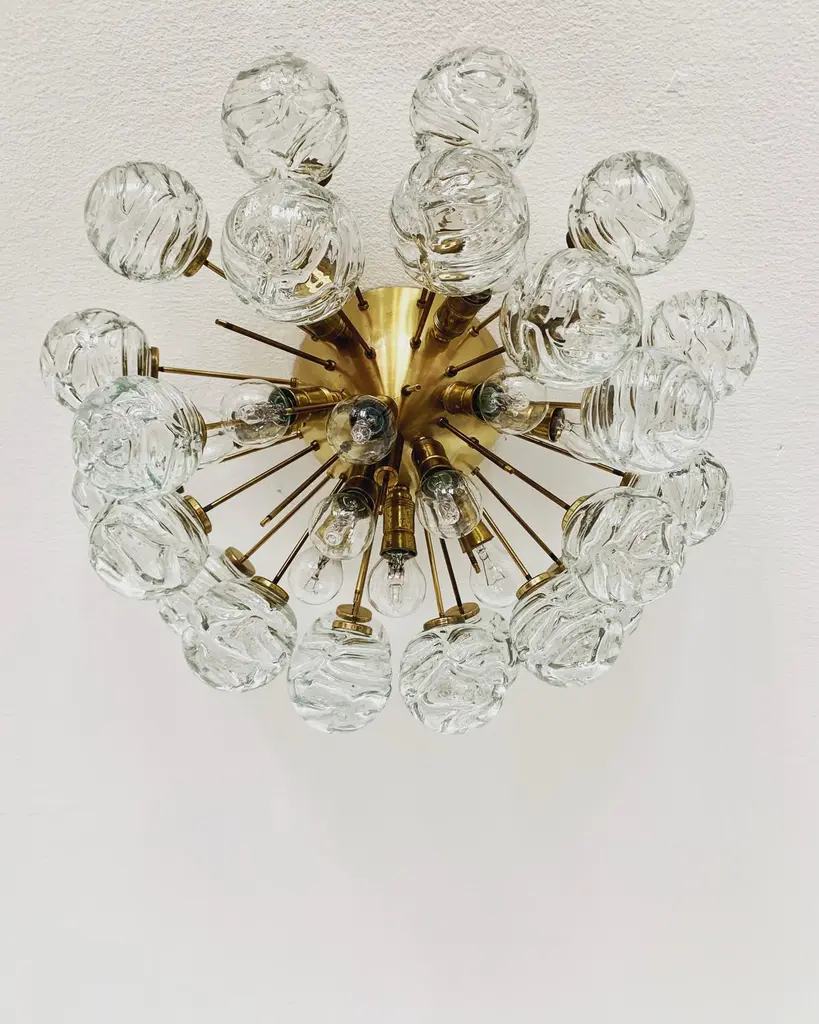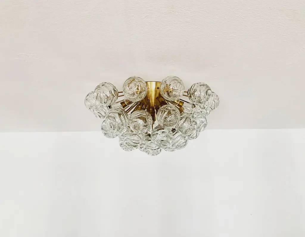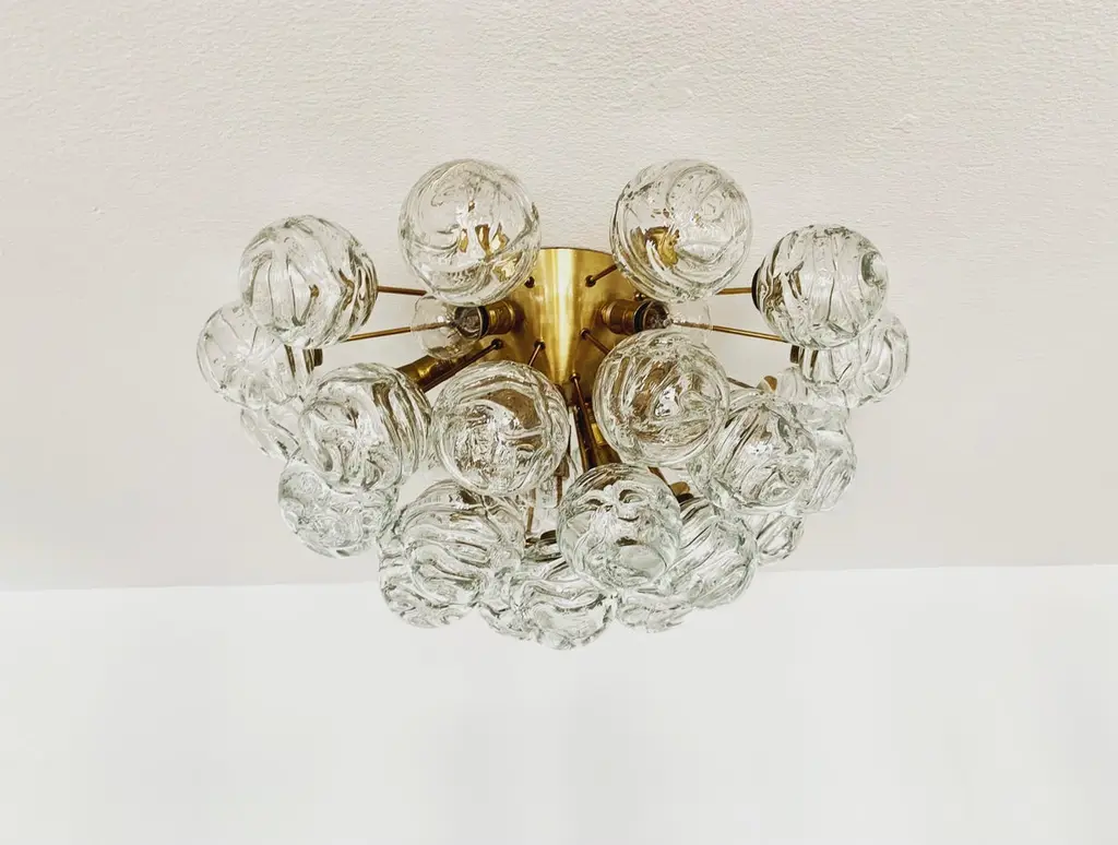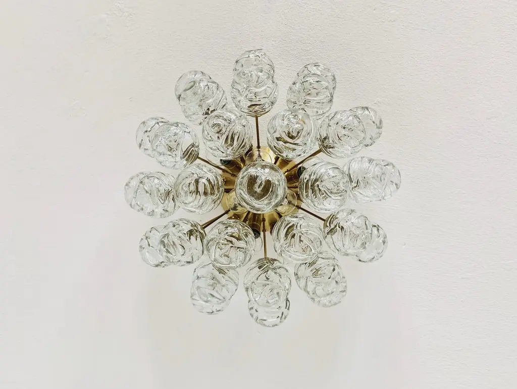 Fabulous golden ice glass ceiling lamp from the 1960s.The lamp with its 31 glass globes is very elegant.The structure of the glass shades creates a spectacular play of light.A real eye-catcher.Manufacturer: DoriaCirca 1960Condition:Very good vintage condition with slight signs of age-related wear.The glasses are in very good condition with slight signs of age-related wear.The gold metal parts have a light and very beautiful patina.The pictures are part of the description.I am happy to help with any questions.Dimensions:Diameter: 50 cm/19.69 in.Height: 28 cm/11.02 in.Glass diameter: 8 cm/3.15 in.12x E14 socketsBulbs are not included.Shipping does not include bulbs. Works from 110V to 230V and is suitable for all countries.