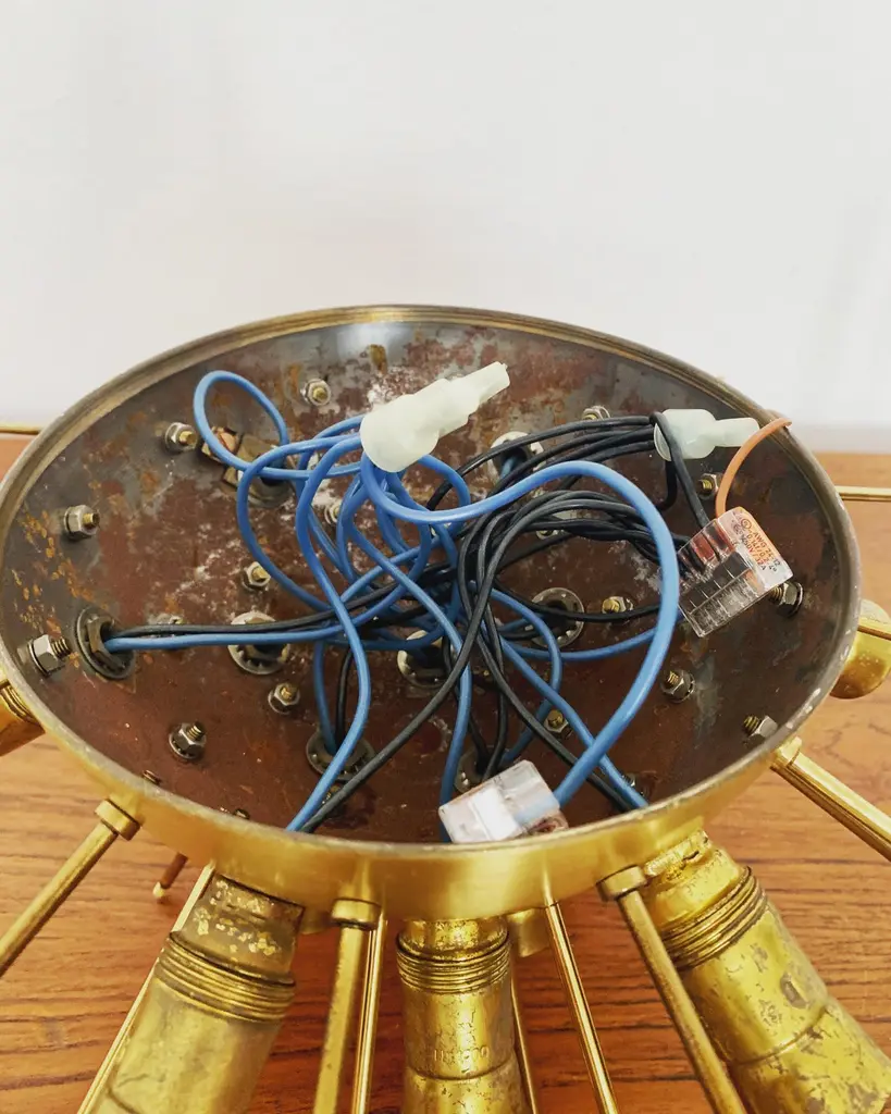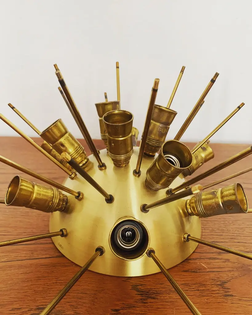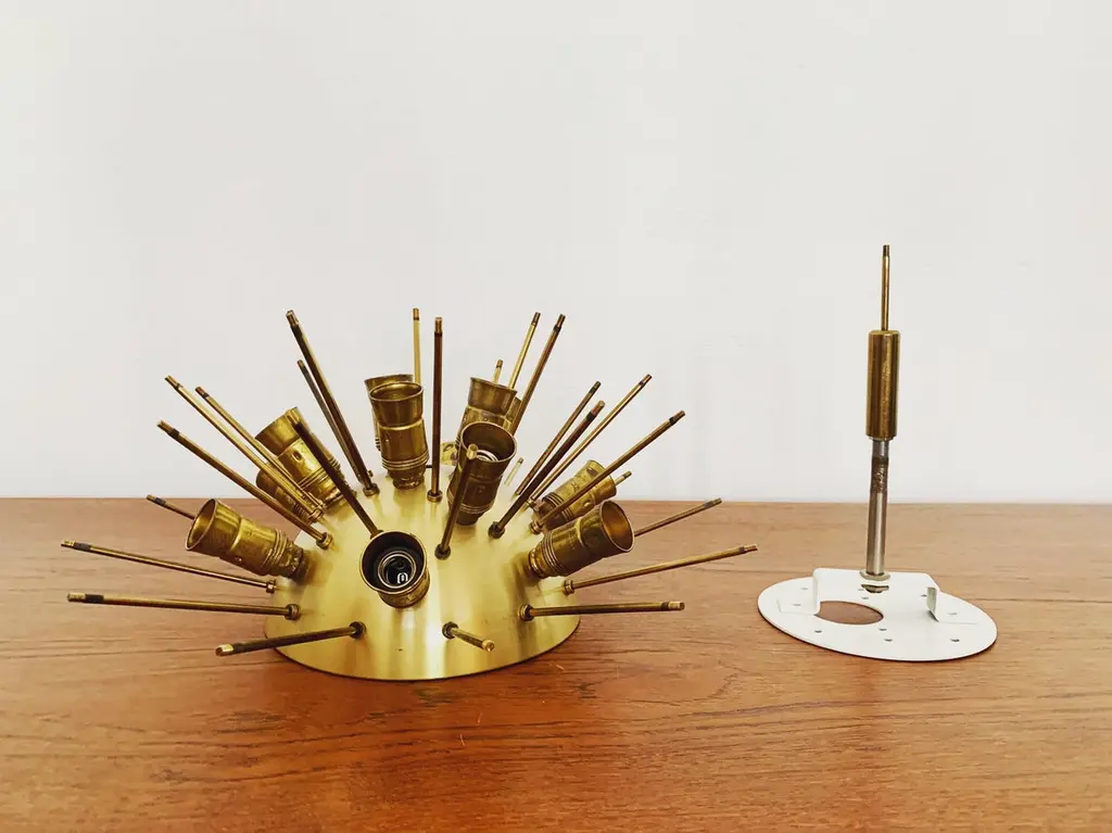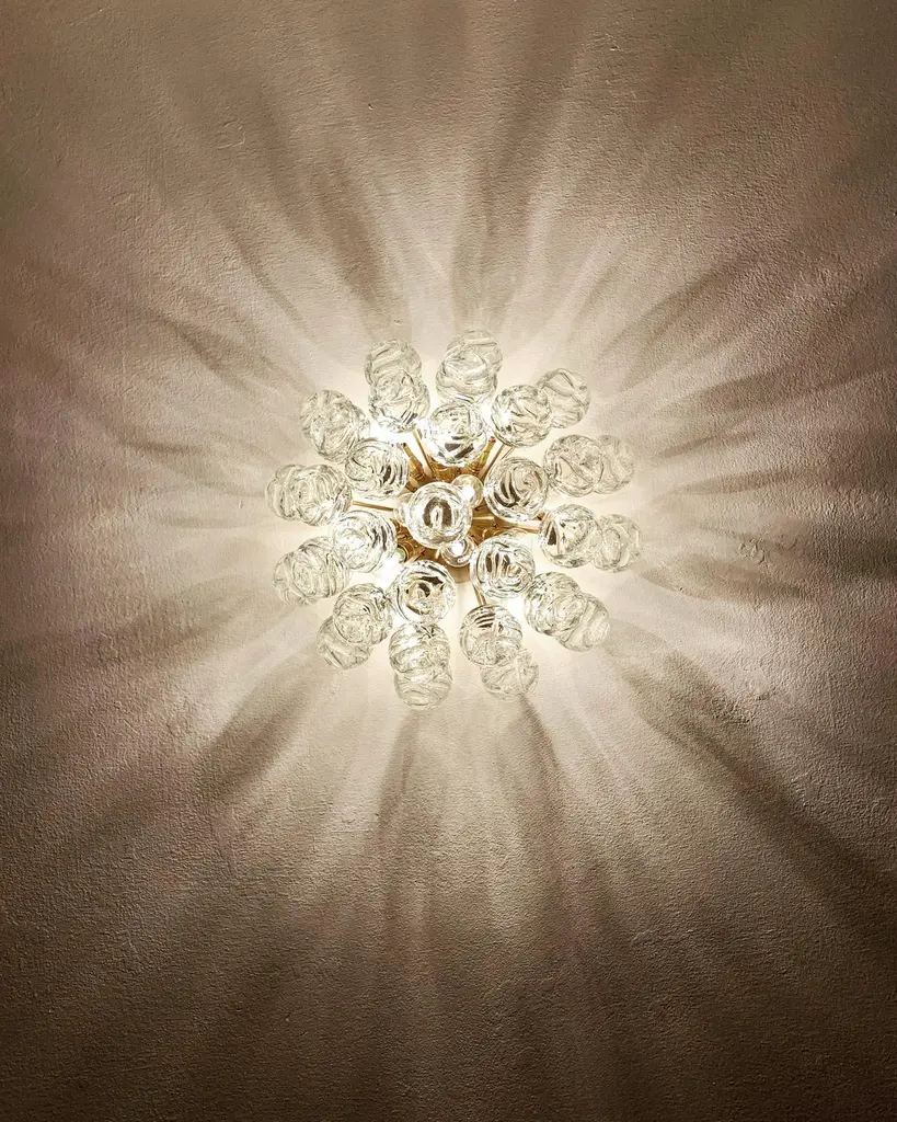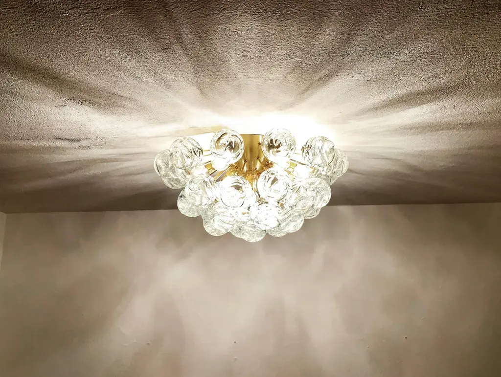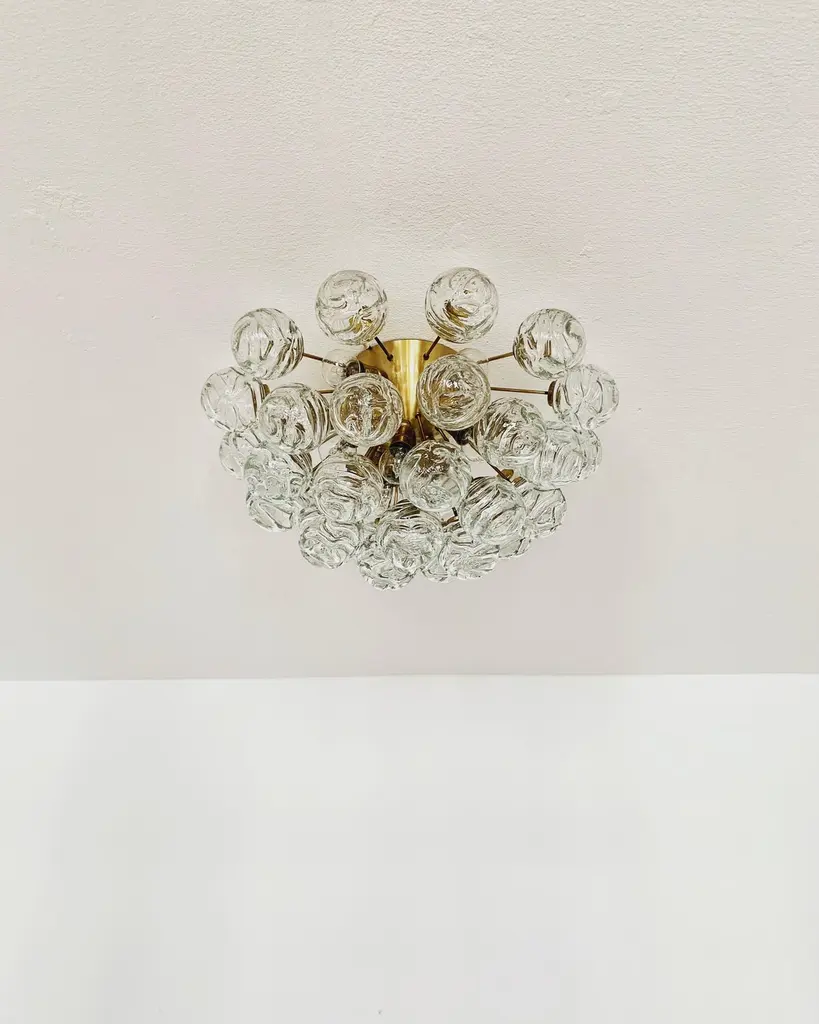 Fabulous golden ice glass ceiling lamp from the 1960s.The lamp with its 31 glass globes is very elegant.The structure of the glass shades creates a spectacular play of light.A real eye-catcher.Manufacturer: DoriaCirca 1960Condition:Very good vintage condition with slight signs of age-related wear.The glasses are in very good condition with slight signs of age-related wear.The gold metal parts have a light and very beautiful patina.The pictures are part of the description.I am happy to help with any questions.Dimensions:Diameter: 50 cm/19.69 in.Height: 28 cm/11.02 in.Glass diameter: 8 cm/3.15 in.12x E14 socketsBulbs are not included.Shipping does not include bulbs. Works from 110V to 230V and is suitable for all countries.