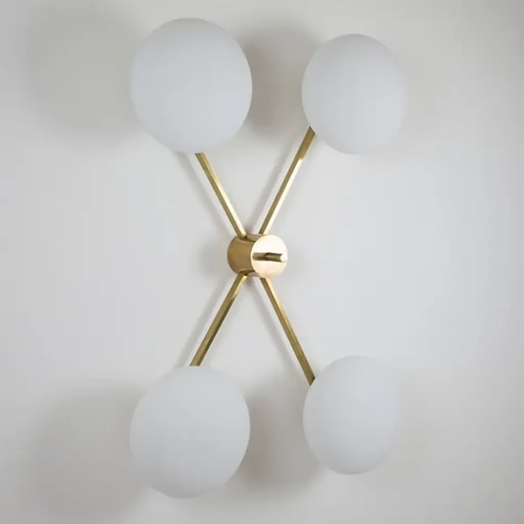Delicate and outstretched like a butterfly's mesmerizing wings. Like its namesake, the Butterfly Wall / Flushmount from Design For Macha draws one's attention through its sense of weightlessness and familiar beauty. Creator Design For Macha celebrates Italian craftsmanship with each design. This handmade piece looks natural in various settings thanks to its wall or ceiling-mounting backplate. Crafted in brass, a group of fine arms shoots out to create an unforgettable x-shaped silhouette. Murano opaline glass globes appear to defy gravity atop the arms with plump, airy shapes. These globes present a soft, spacious, and seductive light.