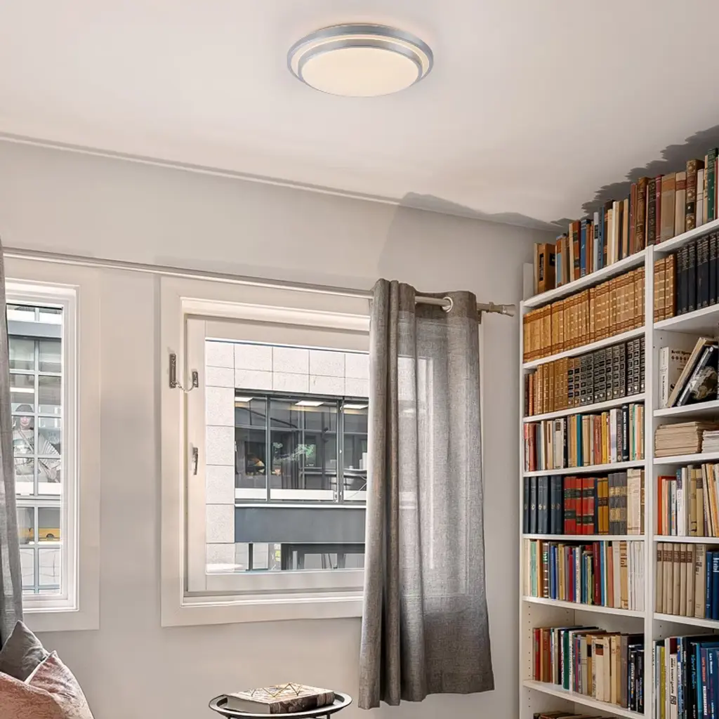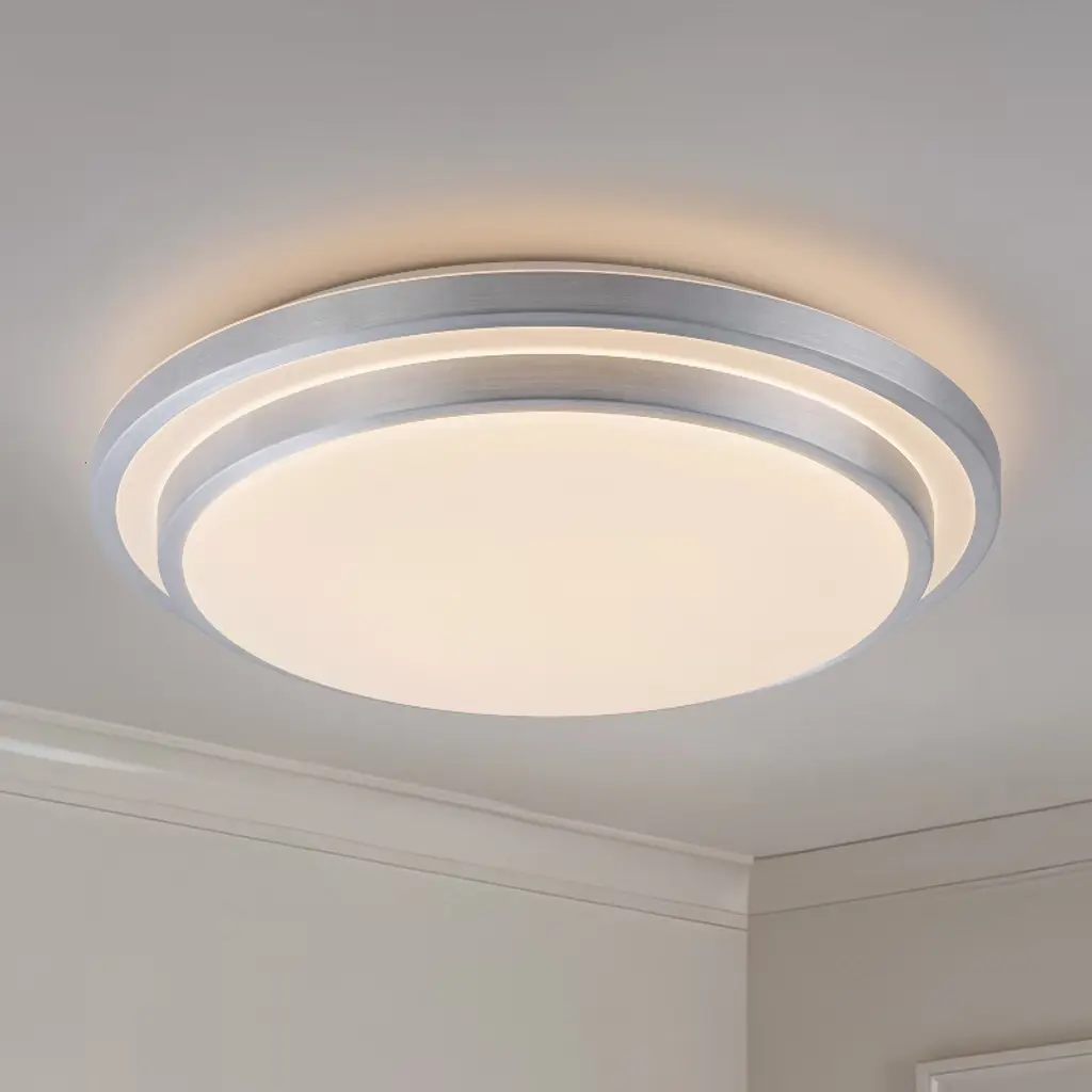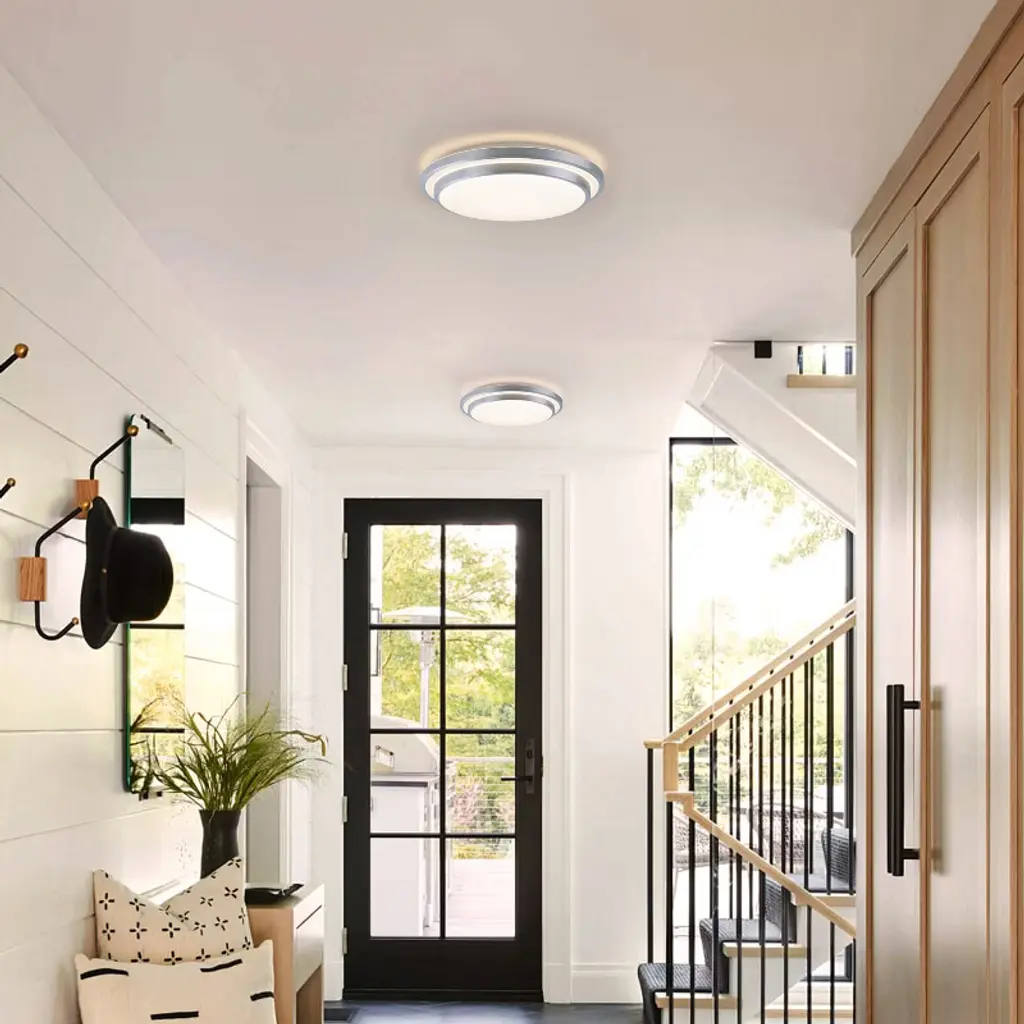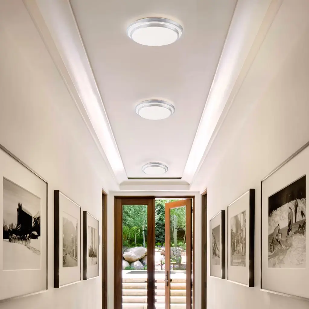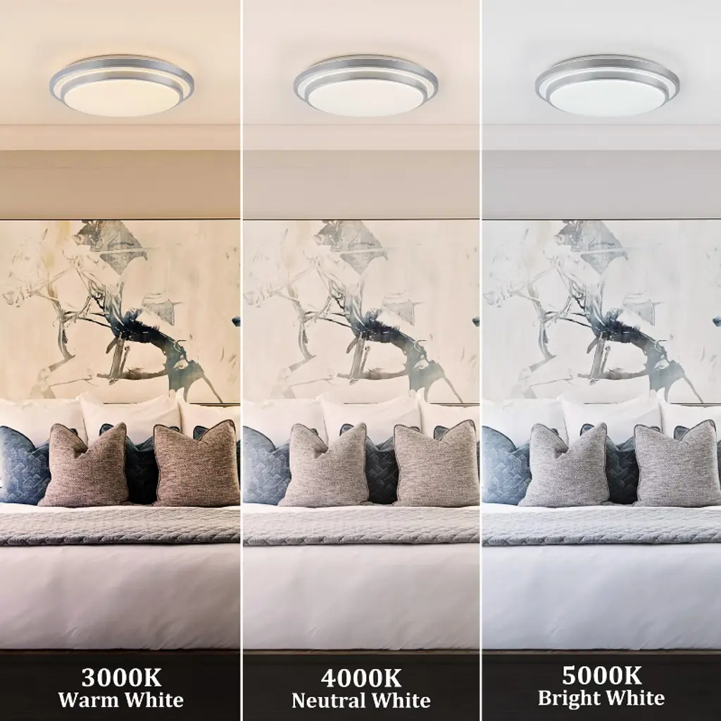 With smooth lines and double-layered round silhouette, this minimalist LED ceiling light shows a perfect blend of modern aesthetics and practical functions, bringing a soft and elegant lighting experience to your interior space. Equipped with three adjustable color temperatures (3000K warm white, 4000K neutral white, 5000K cool white) and dimmable function, it easily meets the lighting needs of bedrooms, kitchens, corridors and living rooms, and creates a cozy atmosphere.