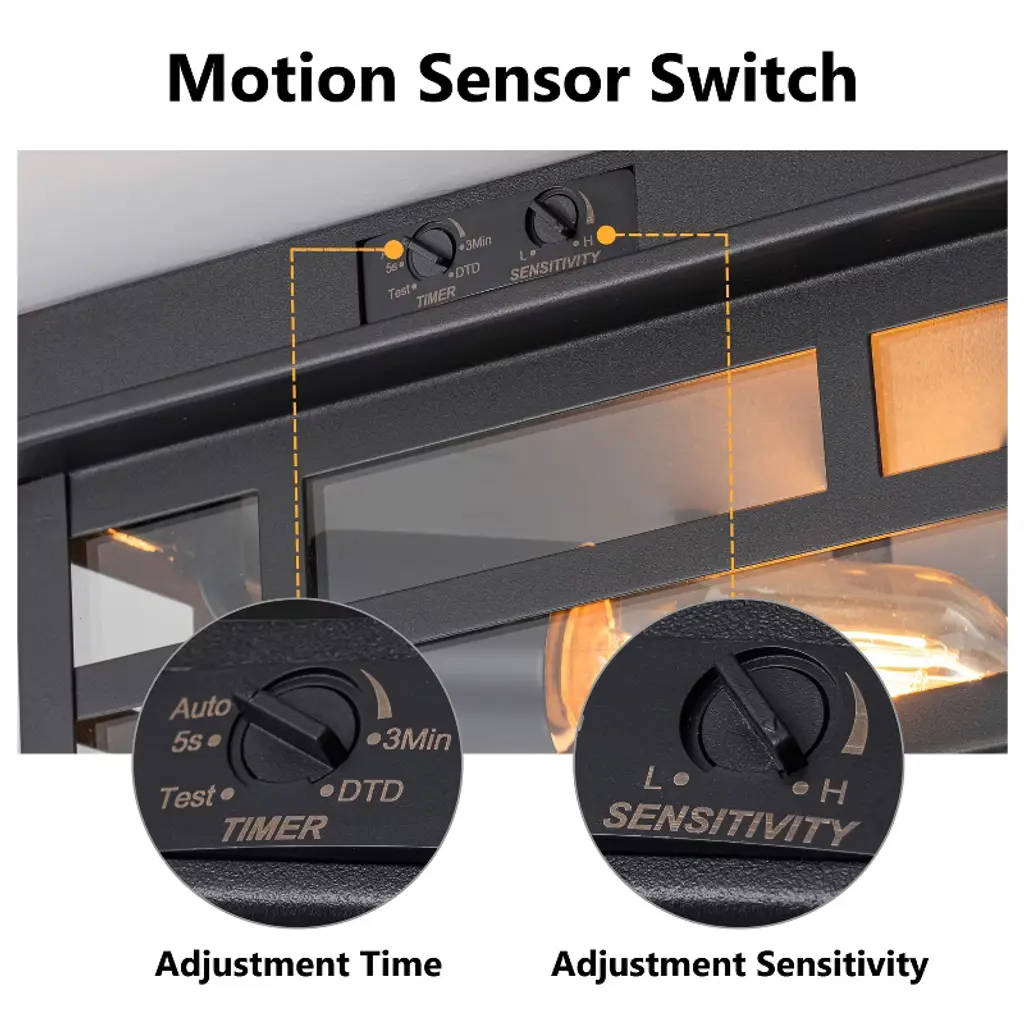 Enhance your outdoor spaces with this modern flush mount ceiling light, featuring a motion sensor and dusk-to-dawn technology for enhanced security and energy efficiency. Designed with a sturdy black metal frame and clear glass panels, this light provides a bright, welcoming glow while complementing a variety of home styles, including farmhouse, industrial, and modern aesthetics. The built-in motion sensor detects movement, turning the light on automatically when needed, while the dusk-to-dawn function ensures hands-free operation by turning the light on at night and off during the day. Weather-resistant construction makes it ideal for porches, patios, garages, and entryways, providing long-lasting illumination and security.