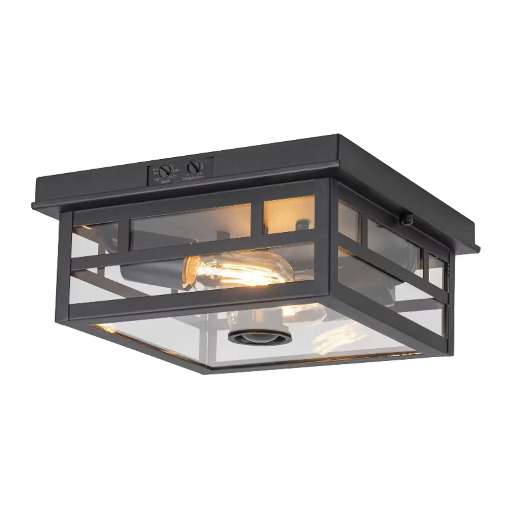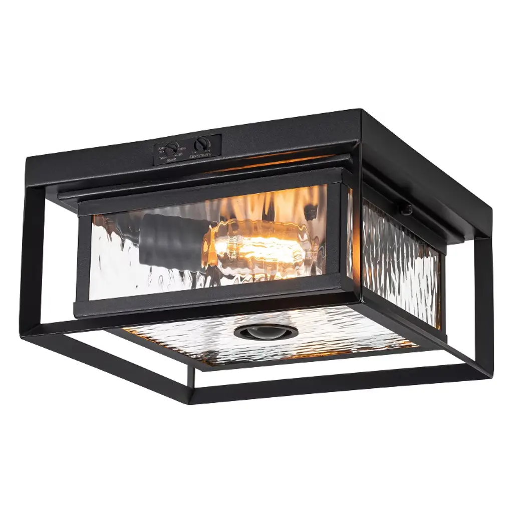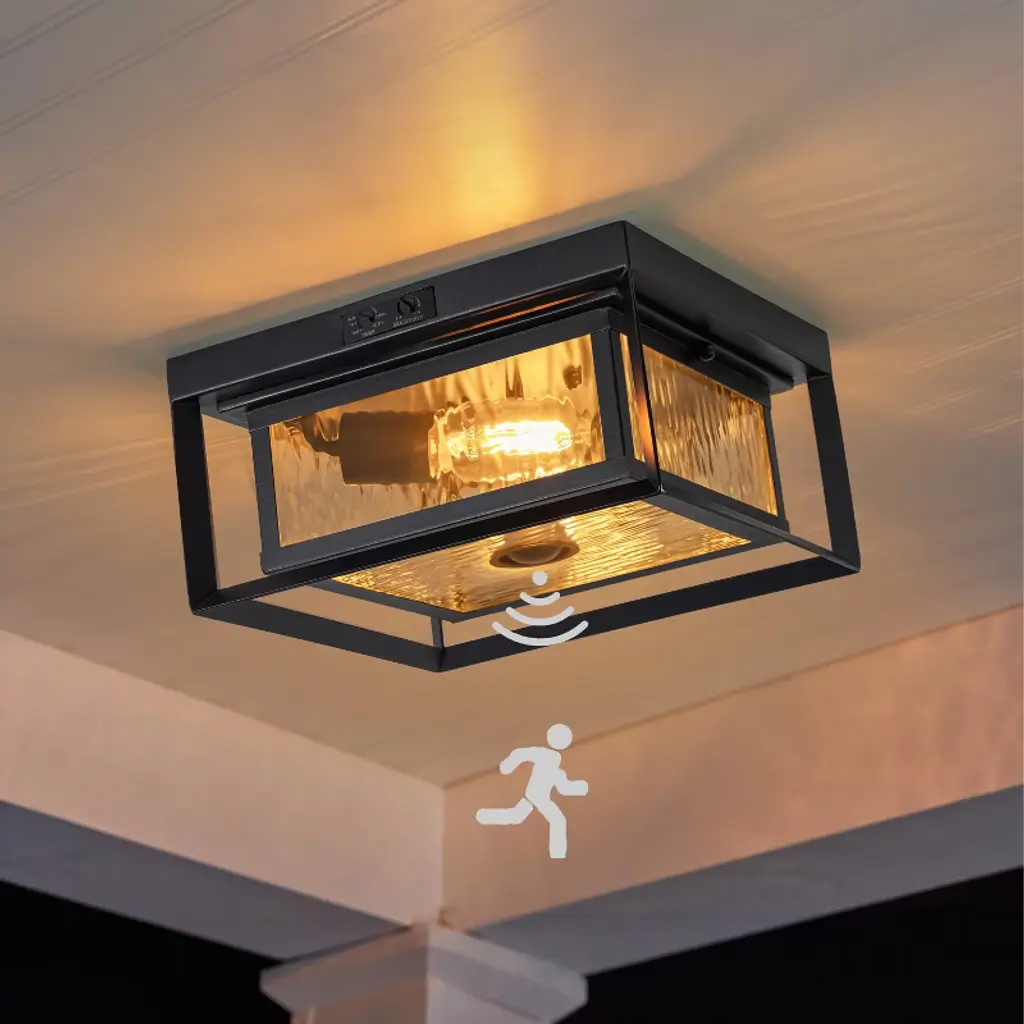 Upgrade your outdoor lighting with this modern flush mount ceiling light, featuring an integrated motion sensor and dusk-to-dawn functionality for security, convenience, and energy efficiency. This fixture is crafted with a durable black metal frame and clear water glass panels, creating a sleek and sophisticated look while ensuring bright and diffused illumination. The open geometric frame adds a touch of modern elegance, making it a stylish addition to porches, patios, garages, and entryways. With a weather-resistant design, adjustable motion detection, and compatibility with various bulbs, this fixture is a practical yet decorative lighting solution for your home.