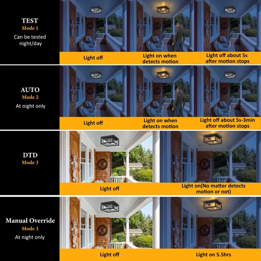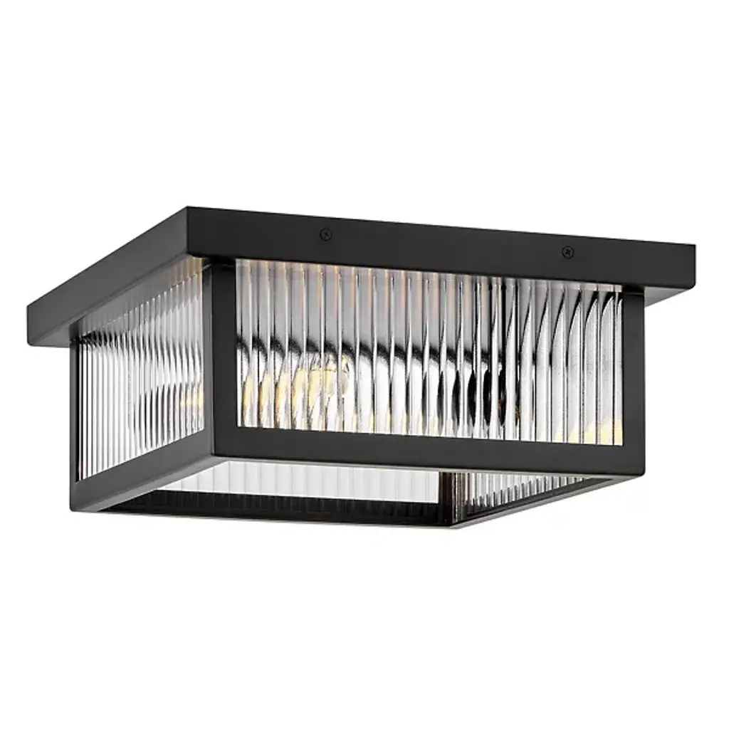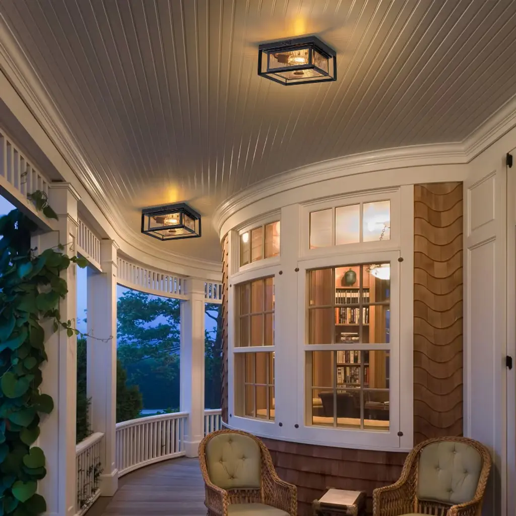 Upgrade your outdoor lighting with this modern flush mount ceiling light, featuring an integrated motion sensor and dusk-to-dawn functionality for security, convenience, and energy efficiency. This fixture is crafted with a durable black metal frame and clear water glass panels, creating a sleek and sophisticated look while ensuring bright and diffused illumination. The open geometric frame adds a touch of modern elegance, making it a stylish addition to porches, patios, garages, and entryways. With a weather-resistant design, adjustable motion detection, and compatibility with various bulbs, this fixture is a practical yet decorative lighting solution for your home.
