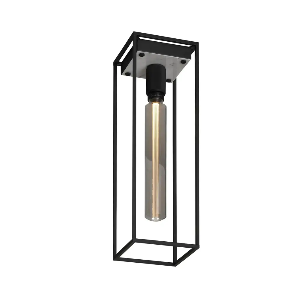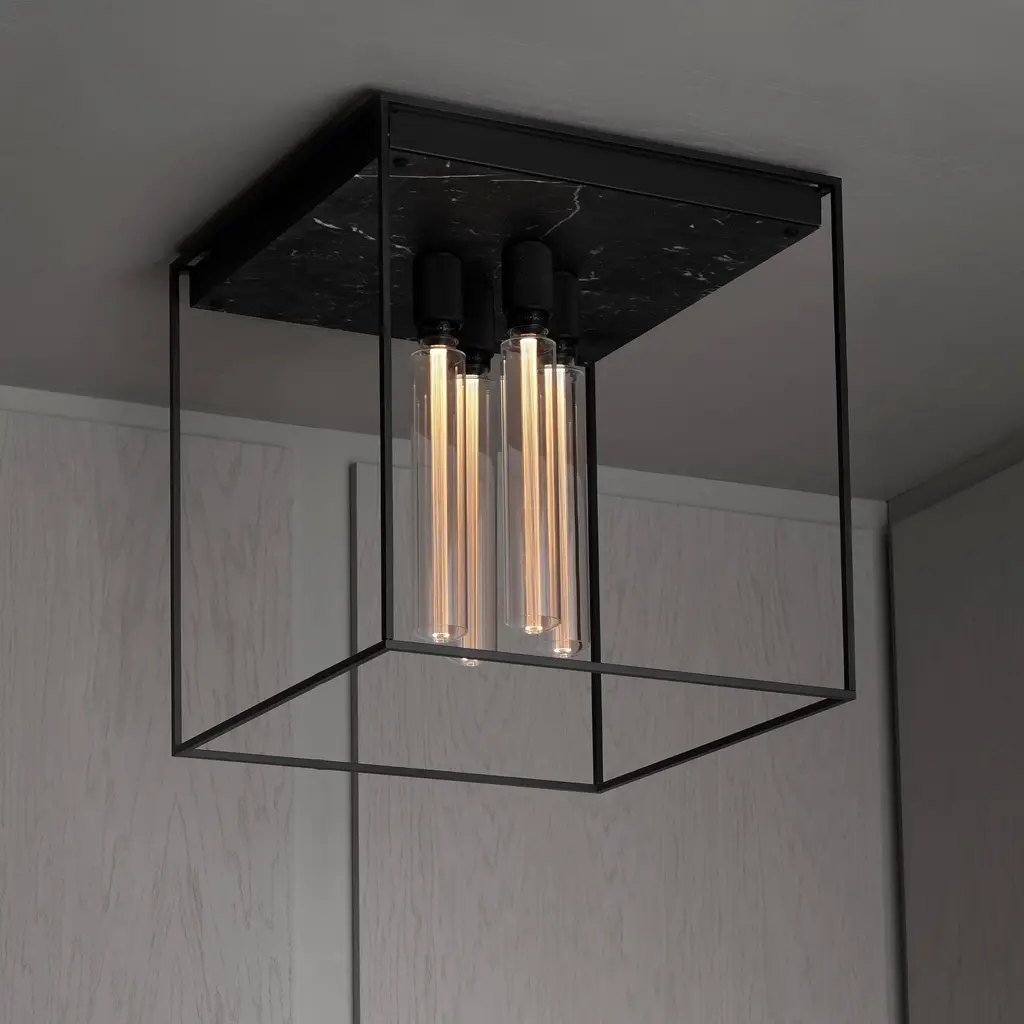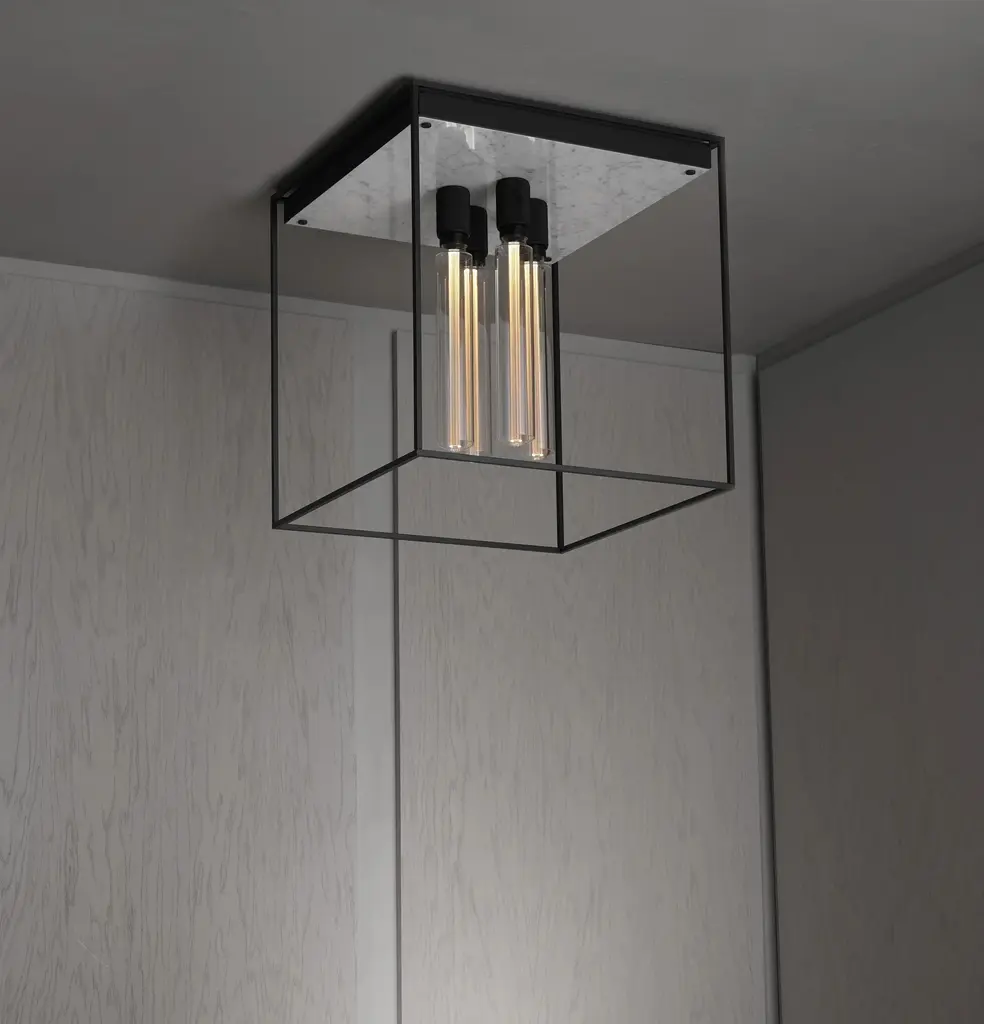 A statement of raw yet refined industrial design, the Caged 4.0 Square Flush Mount from Buster + Punch brings a touch of London's edgy style to your ceiling. This unique light is defined by its strong, metal cage, which is beautifully contrasted by a polished marble back panel that adds a luxurious touch. The design is completed with a signature knurled lamp holder and penny buttons, details that are unmistakably Buster + Punch. A fusion of raw materials and meticulous detailing, it’s a sophisticated and unconventional lighting choice for the modern interior. Highlights: