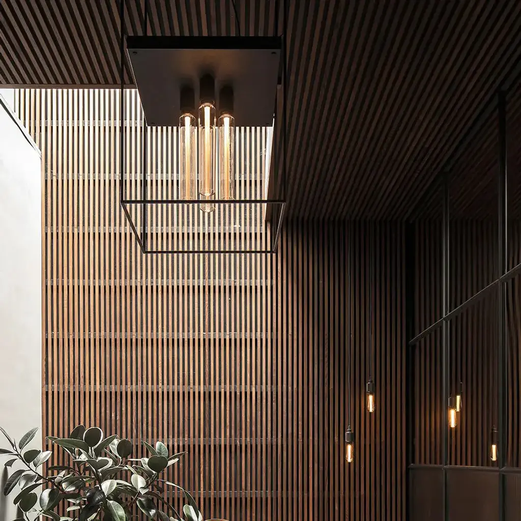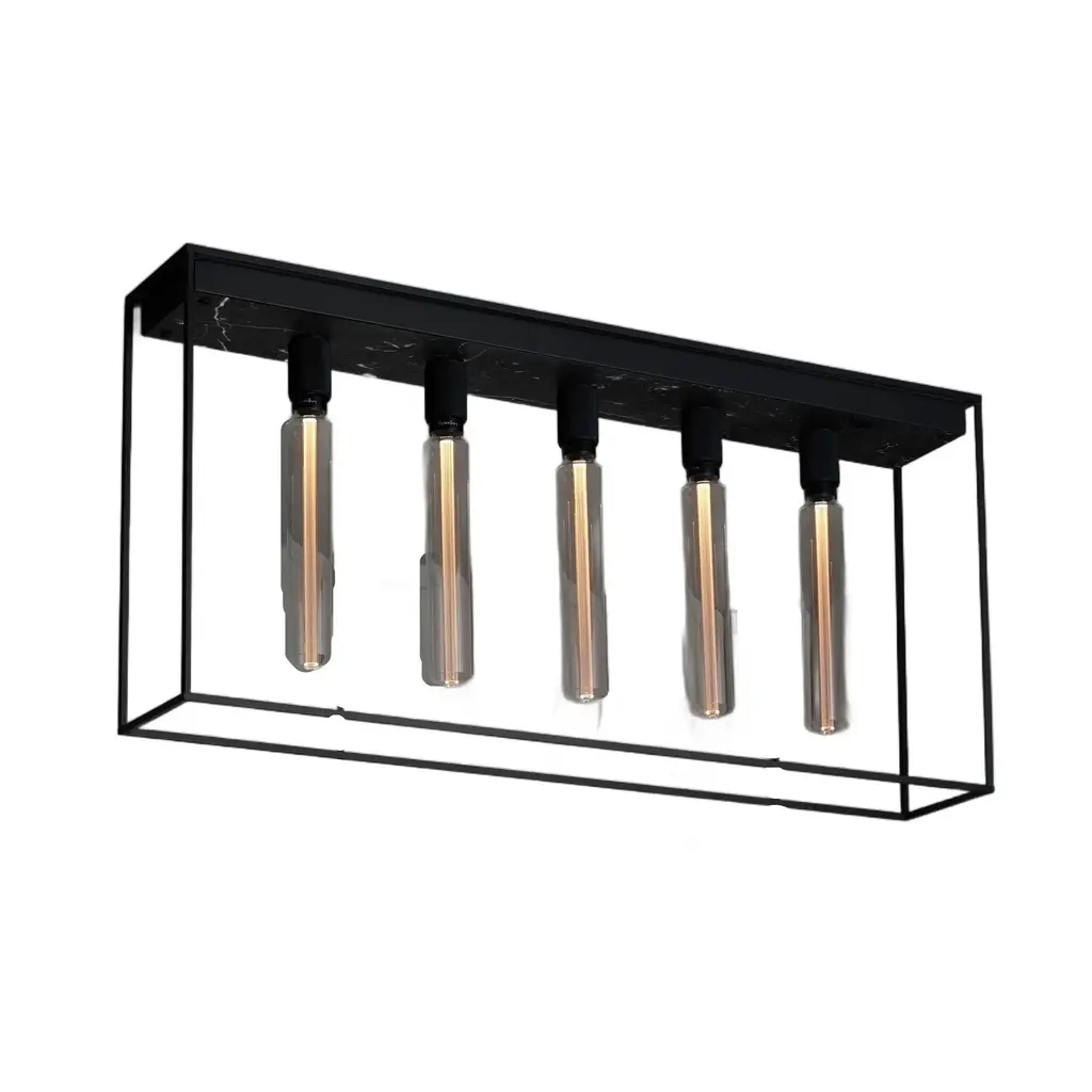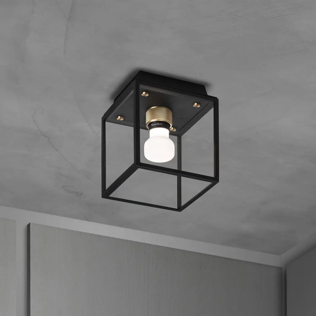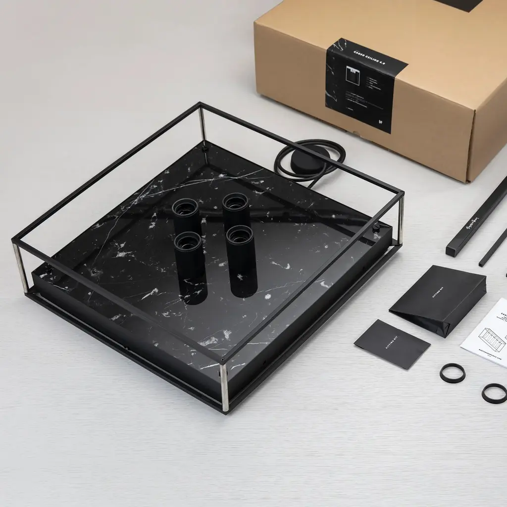 A statement of raw yet refined industrial design, the Caged 4.0 Square Flush Mount from Buster + Punch brings a touch of London's edgy style to your ceiling. This unique light is defined by its strong, metal cage, which is beautifully contrasted by a polished marble back panel that adds a luxurious touch. The design is completed with a signature knurled lamp holder and penny buttons, details that are unmistakably Buster + Punch. A fusion of raw materials and meticulous detailing, it’s a sophisticated and unconventional lighting choice for the modern interior. Highlights: