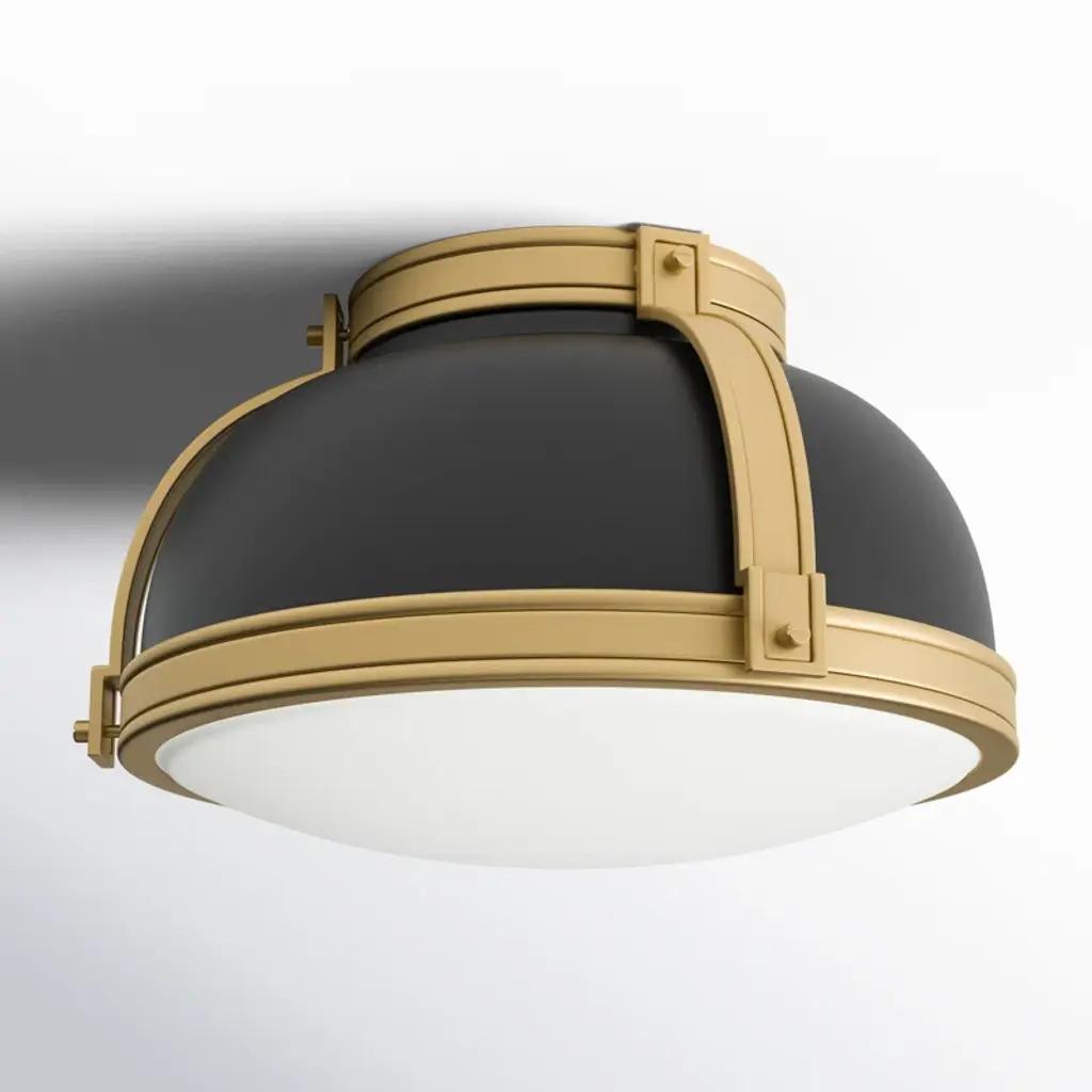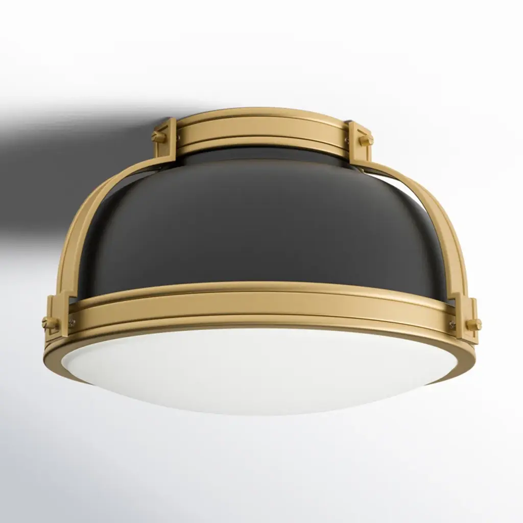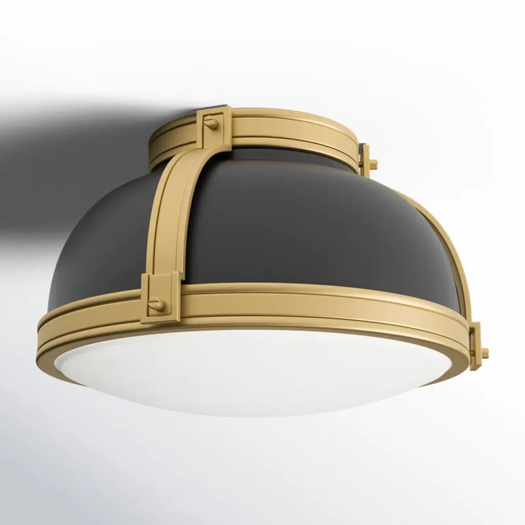 Here's a flush mount that's both on-trend and vintage-inspired. It strikes a bold steel dome silhouette with a double-strap design in contrasting finishes. A white glass inlay filters a soothing glow and casts light around any space. Two bulbs can be installed inside, and they're sold separately. It's also a dimmable fixture, so you can easily control the level of brightness – day or night. With a minimal hanging height, it's a great accent for foyers, landings, and rooms with low ceilings.