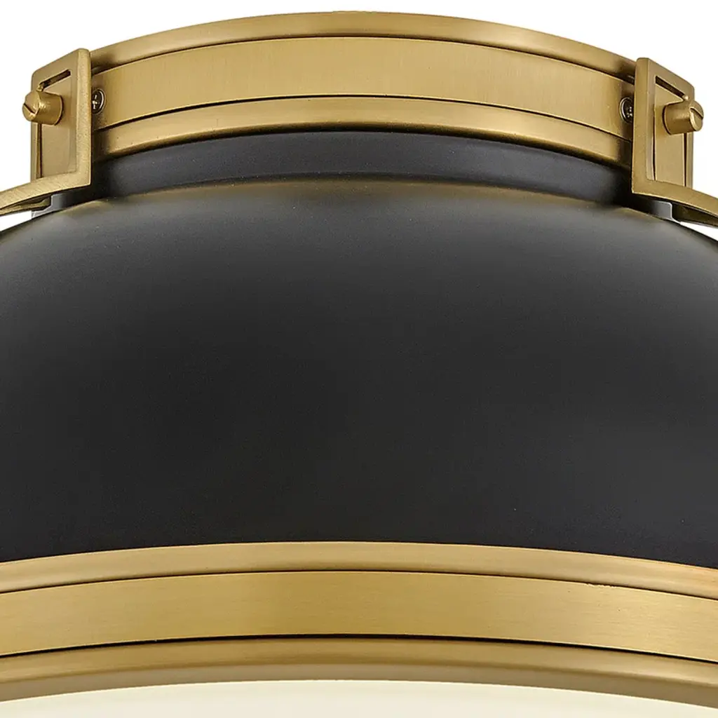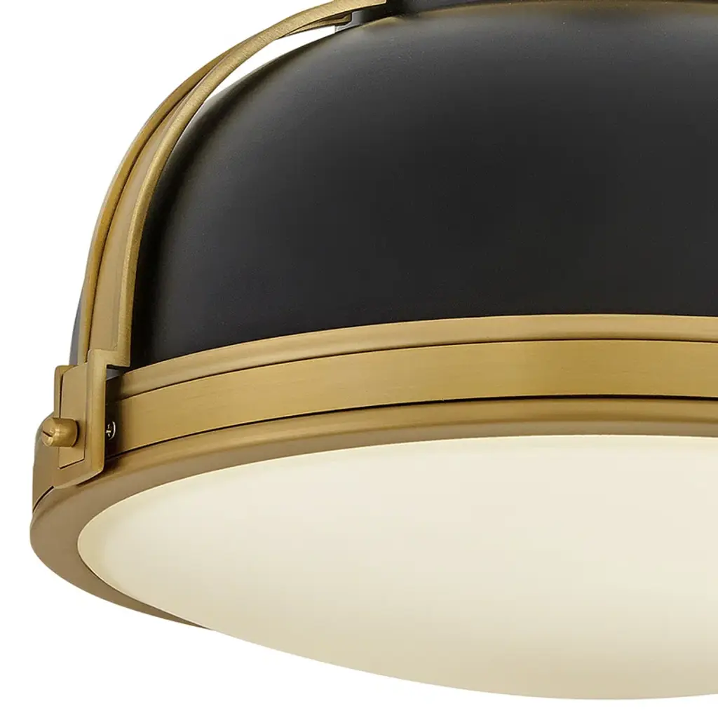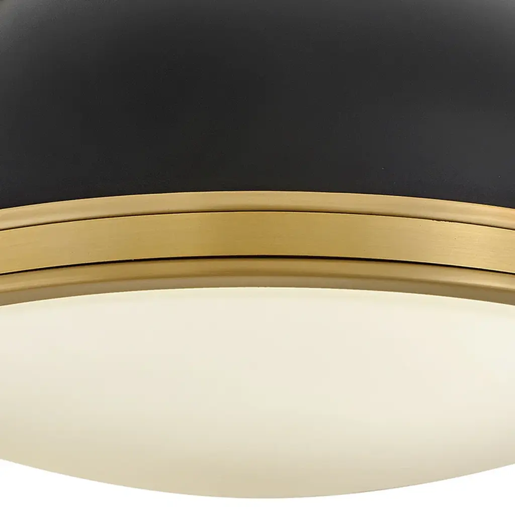 Here's a flush mount that's both on-trend and vintage-inspired. It strikes a bold steel dome silhouette with a double-strap design in contrasting finishes. A white glass inlay filters a soothing glow and casts light around any space. Two bulbs can be installed inside, and they're sold separately. It's also a dimmable fixture, so you can easily control the level of brightness – day or night. With a minimal hanging height, it's a great accent for foyers, landings, and rooms with low ceilings.