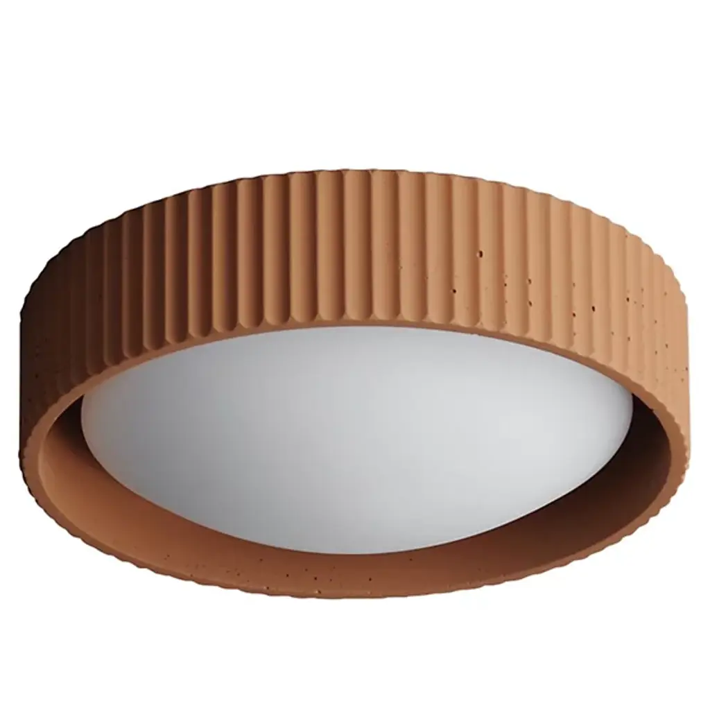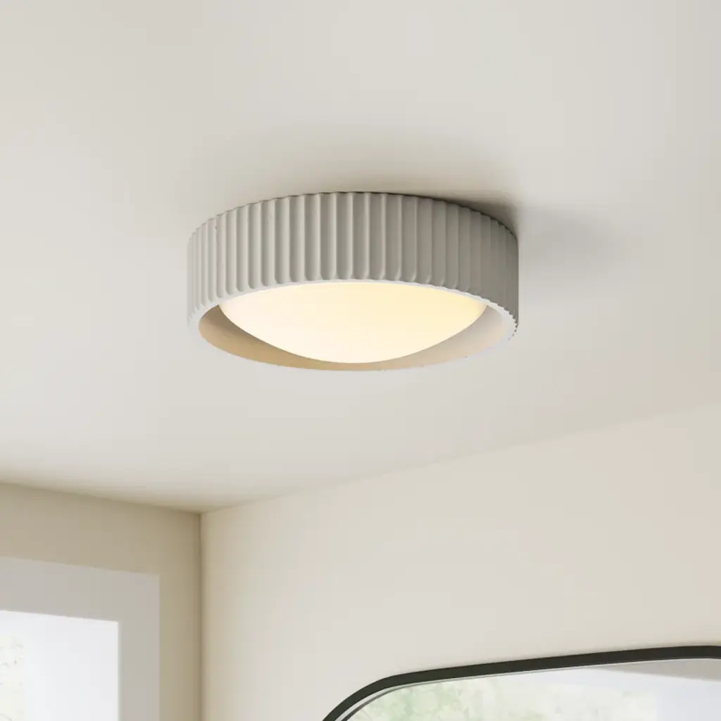 This round flush mount shows off scalloped edges and a minimalist silhouette for a distinctively organic look. Crafted from cast concrete and steel, the drum fixture surrounds the integrated LED. The light is encased within a curved opal white acrylic diffuser, giving you a milky dimmable glow. Its low hanging height makes it perfect for landings and rooms with low ceilings.