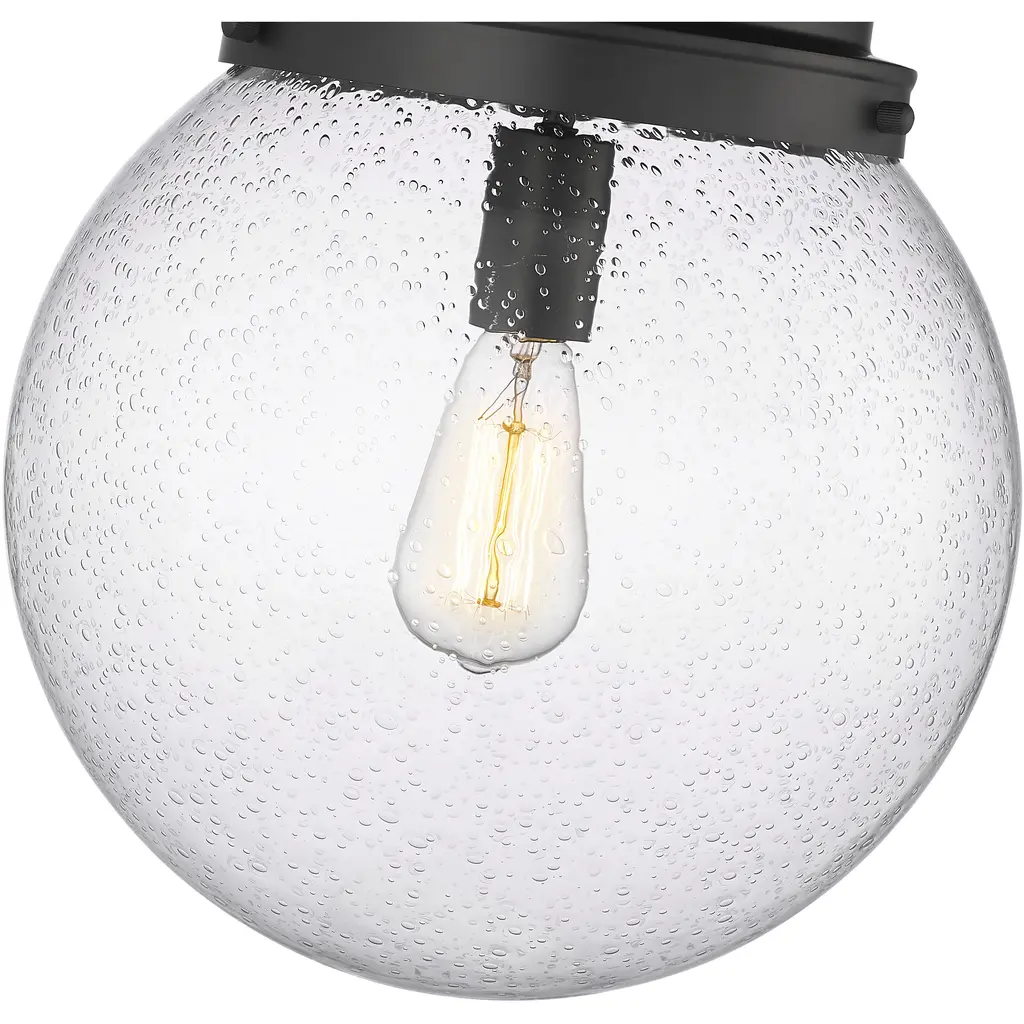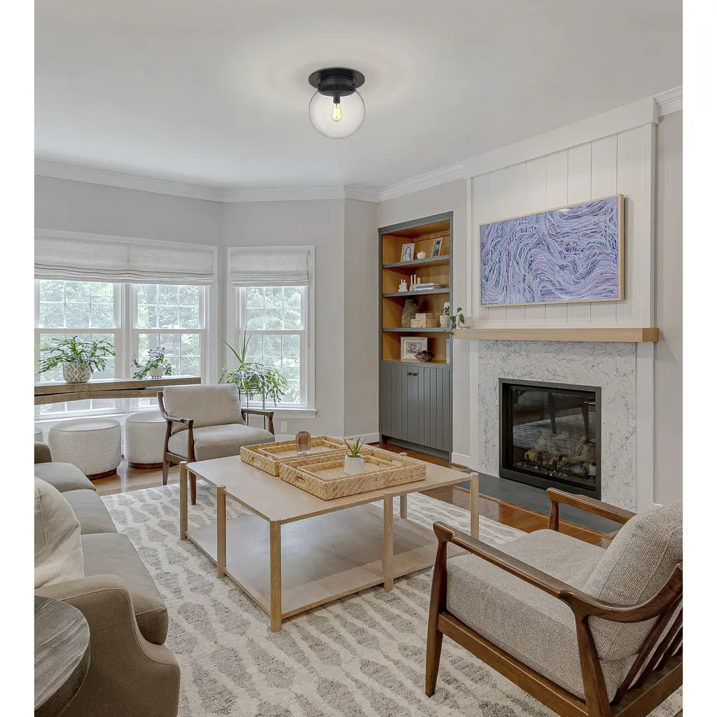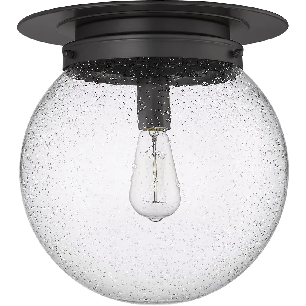 Customize your space with a light fixture blending Mid-Century Modern style with schoolhouse and industrial charm. This one-light flush mount from the Calhoun collection delivers a shapely, symmetrical silhouette with a frame and accents featuring bold matte black finish metal. A festive clear seedy glass globe shade adds a dose of elegance suitable for any application.