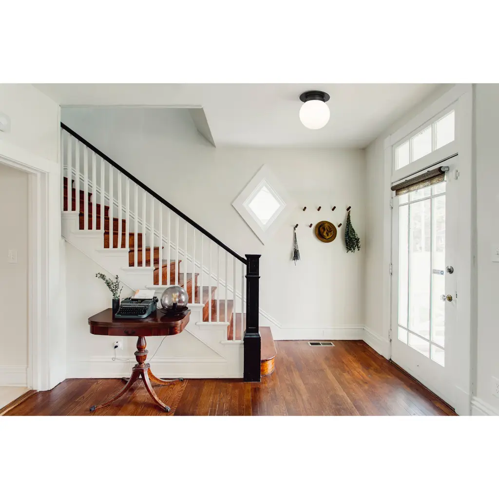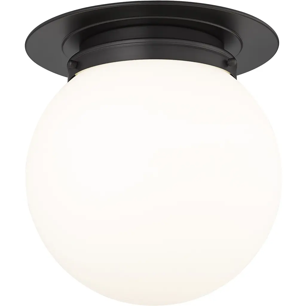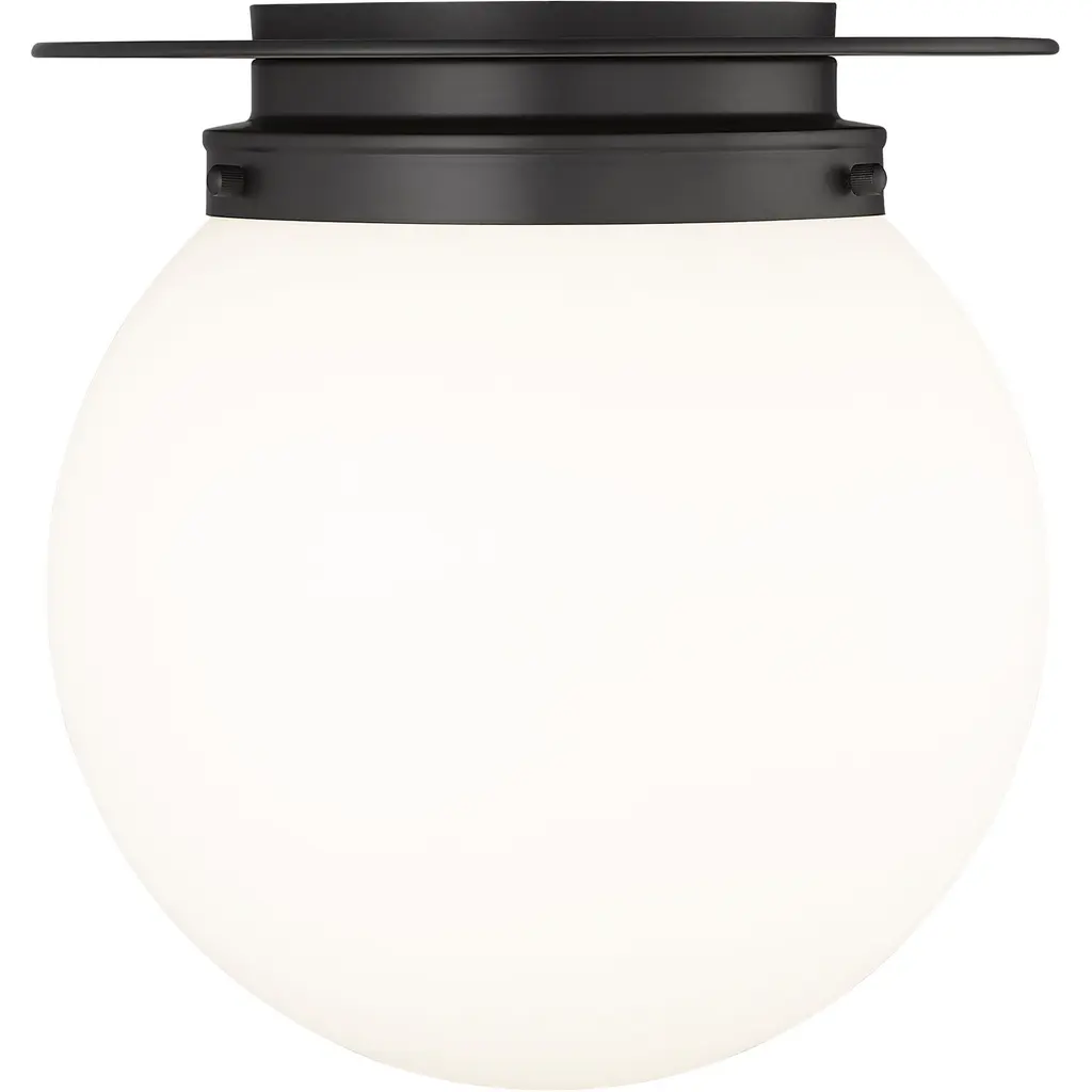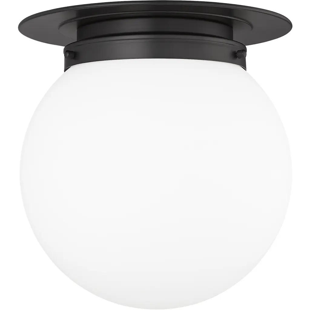 Mid-Century Modern and Schoolhouse styles reflect in this one-light flush mount from the Calhoun collection, delivering a clean artistic look in any application. This chic fixture stands out with a white glass globe attached to matte black finish steel framing and accents, creating a bold signature statement with easy style.