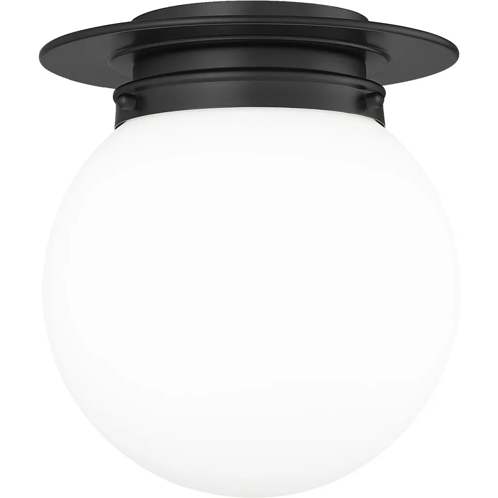 This one-light flush mount from the Calhoun collection shows off bold matte black finish metal framing and accents with a clean silhouette and laid-back attitude. Embrace a charming mix of schoolhouse and Mid-Century Modern design in a fixture with versatility and personality, complete with a white glass globe shade.