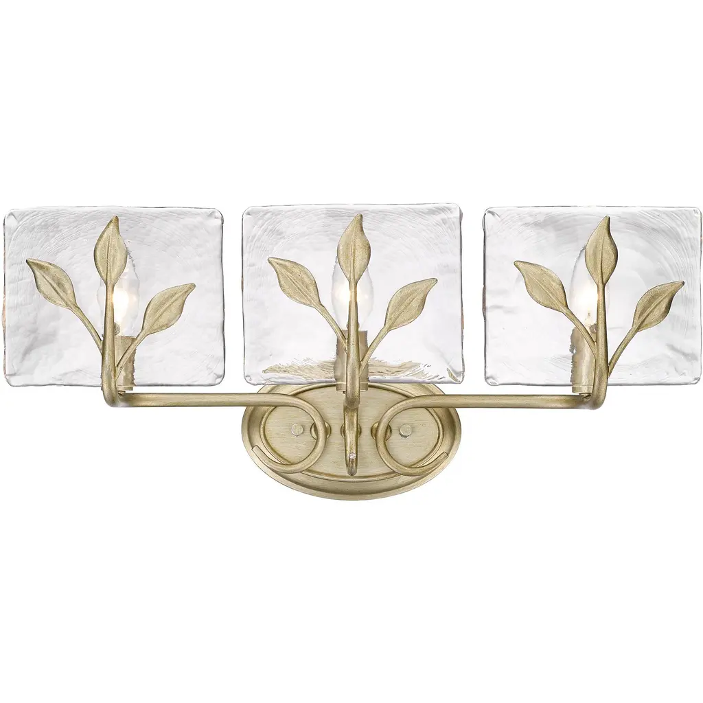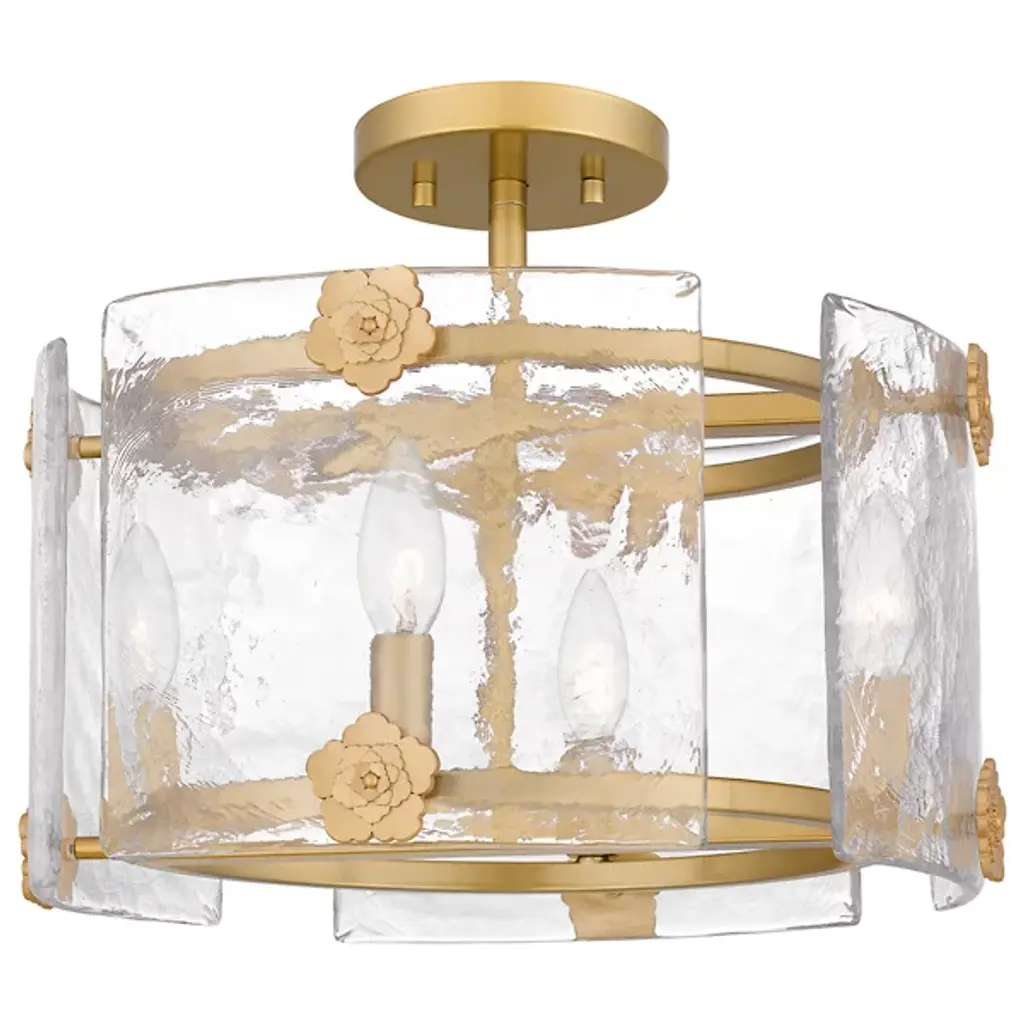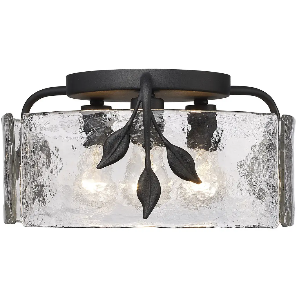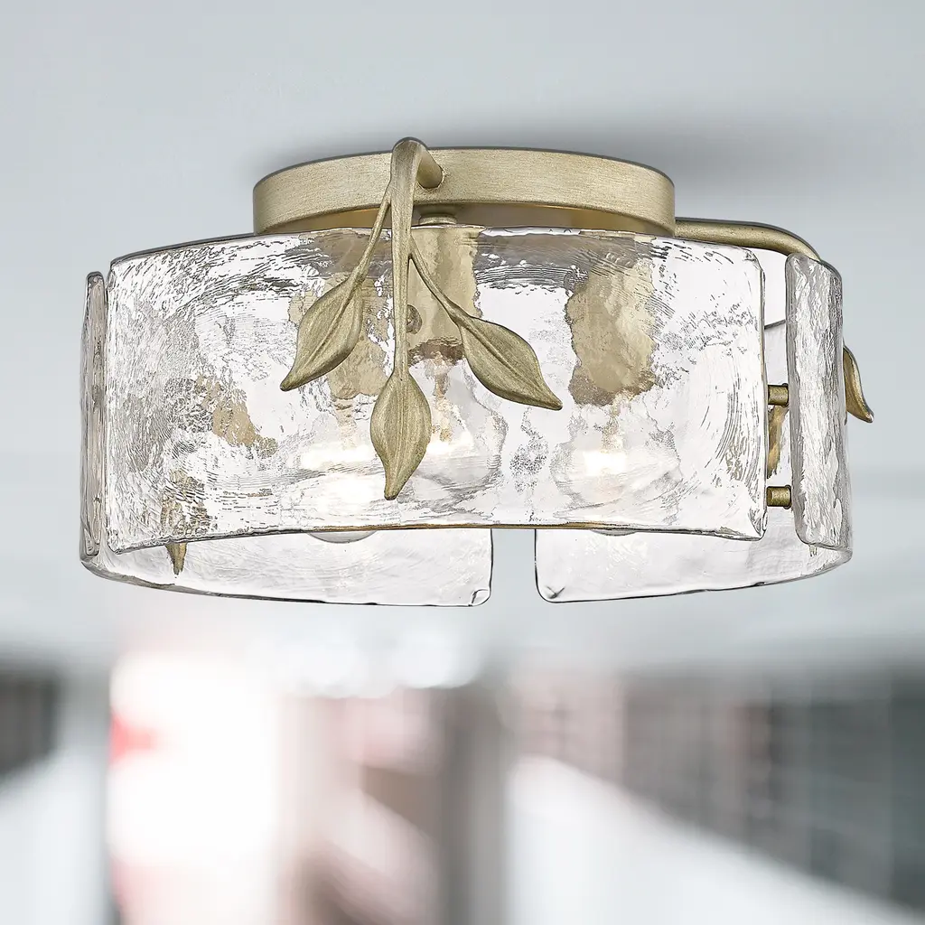 Bring Nature-Inspired elegance into your home with the Golden Lighting Calla 3-light Flush Mount in White Gold. Featuring a glass shade and a White Gold frame, it creates a welcoming atmosphere. This glass shade features Hammered Water Glass, characterized by its heavy, irregular, and organic texture, designed to create a beautifully distorted and refractive light effect. The sophisticated White Gold finish blends the warmth of gold with cool silver tones, offering an understated elegance suitable for any décor. Ideal for low ceilings in hallways, closets, and bathrooms, this fixture is Damp Location Rated, making it suitable for covered and semi-enclosed spaces with occasional moisture. Overall Dimensions: 15.13"W x 7"H x 15.13"D, requires 3 E26 Medium base bulbs (not included), max wattage 100 per bulb. Elevate your space with this artisanal lighting option that beautifully reflects quality and craftsmanship.