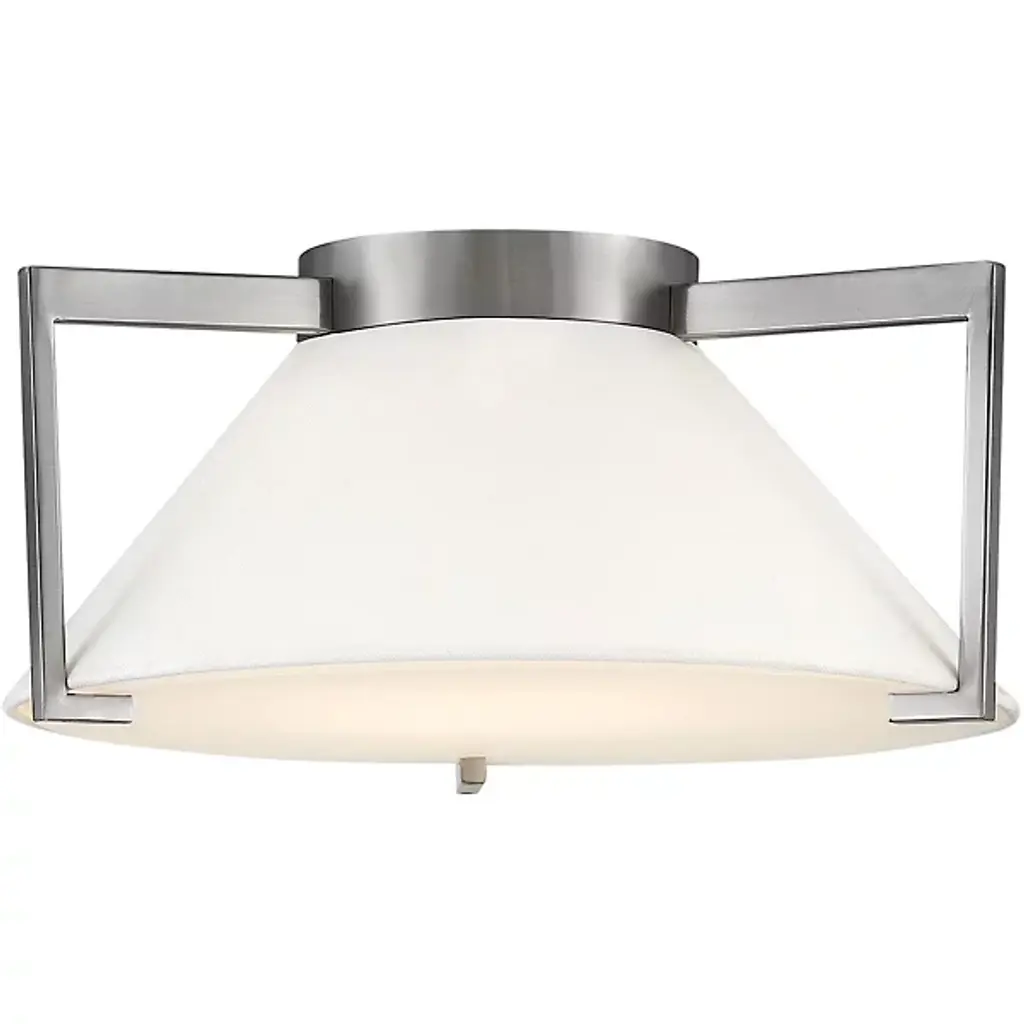 Step out of your comfort zone with the off-beat transitional presence of the Calla LED Flushmount by Hinkley Lighting. Its design features a quirky mishmash of rigid Steel framework and a seamless Off-White Cotton Twil shade with an Etched Acrylic diffuser. Once lit, an integrated LED lamp radiates through the opaque material, providing ample coverage as well as a luxurious metallic shimmer. Works well in a variety of settings, whether over a table, a hall, or spaced out over an open living space.