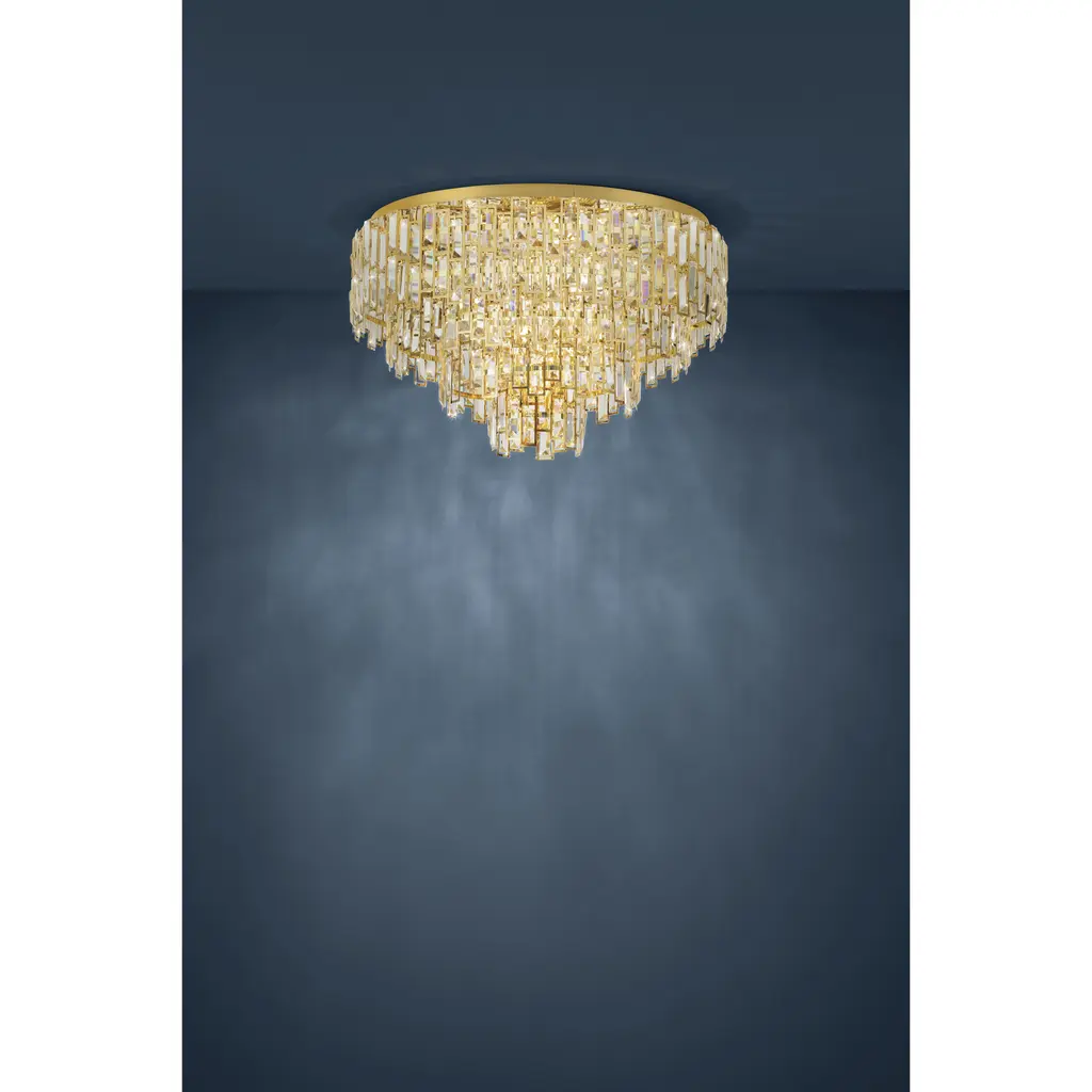 The Calmeilles flush mount features layers of cascading crystals, each suspended within a delicate brass-colored metal frame. Rows of crystals taper down to a point, creating a glamorous focal point. The high-end beveled glass crystals create a sparkling, sophisticated look once illuminated.