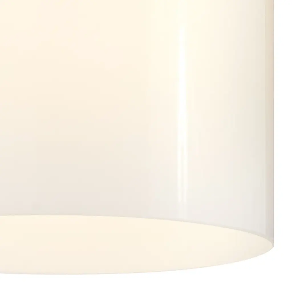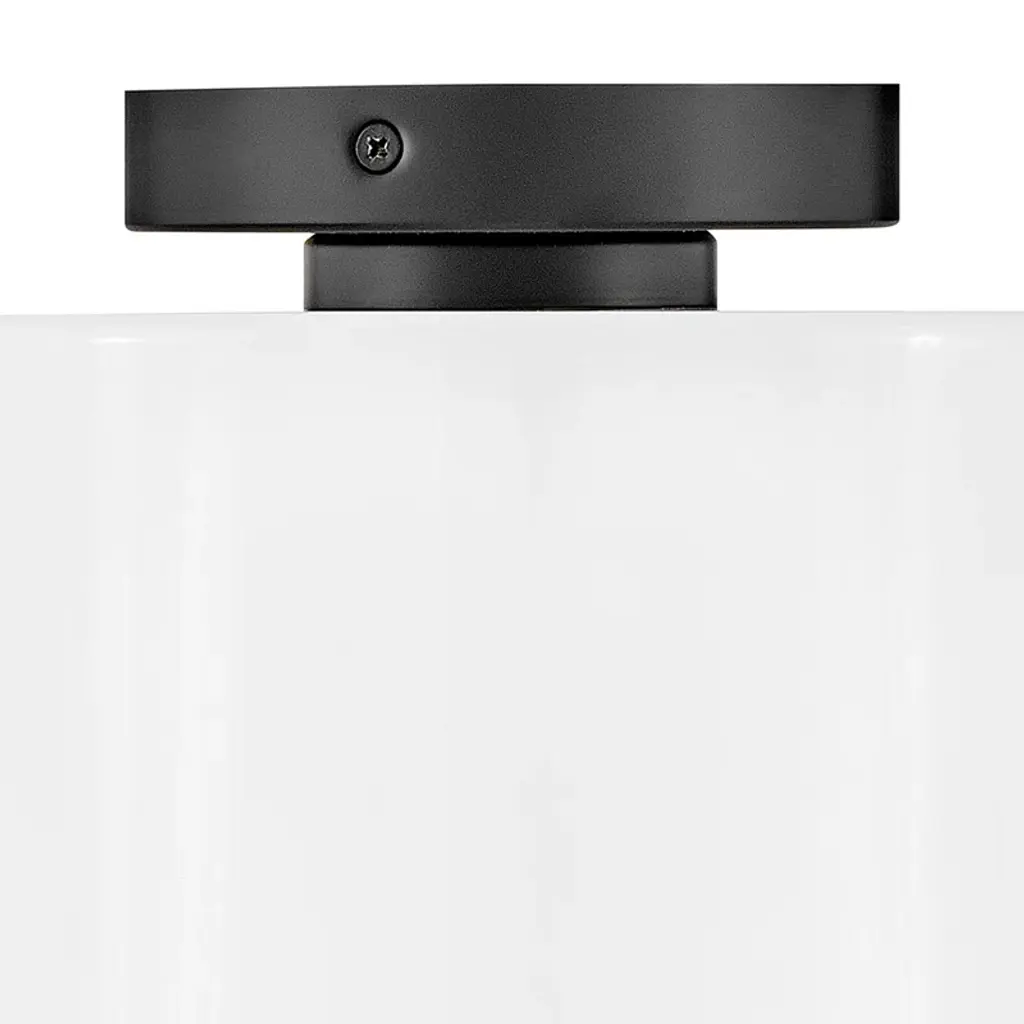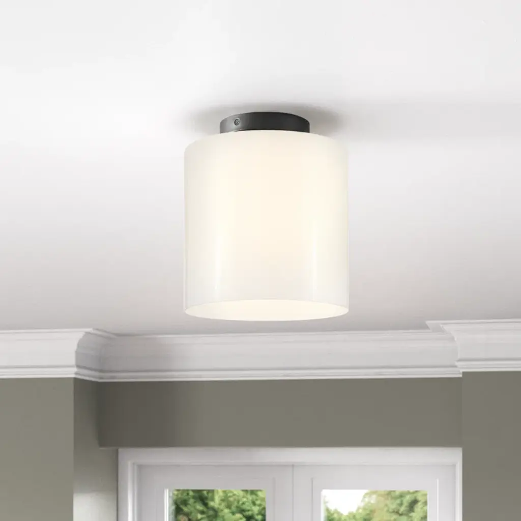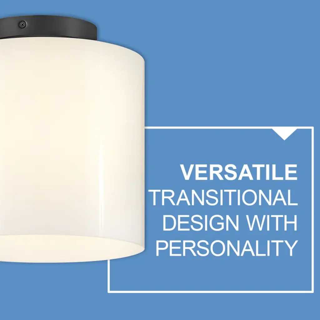 This Transitional flush mount fixture is a stylish option for rooms with shorter ceilings or spaces where maximum illumination is essential - staircases, hallways, closets, and mudrooms. A Cased Opal Glass cylindrical shade is suspended from a simple canopy, surrounding a singular socket in one of three finishes: Black, Lacquered Brass, or Polished Nickel. Illuminated by a 12w Med. LED bulb (not included) choose a G-Style or another vintage filament bulb for a dash of personalization.