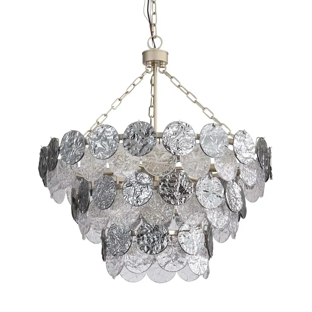 Intricate gold metal is flourished by hand pressed glass wafers. No two alike, the 3-colored rippled glass is juxtaposed for contrast and structure.