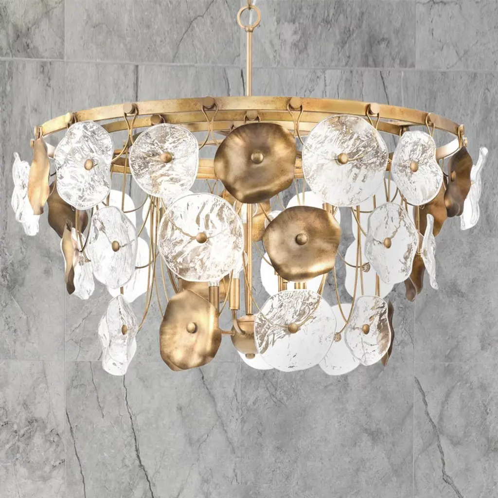 Intricate gold metal is flourished by hand pressed glass wafers. No two alike, the 3-colored rippled glass is juxtaposed for contrast and structure.