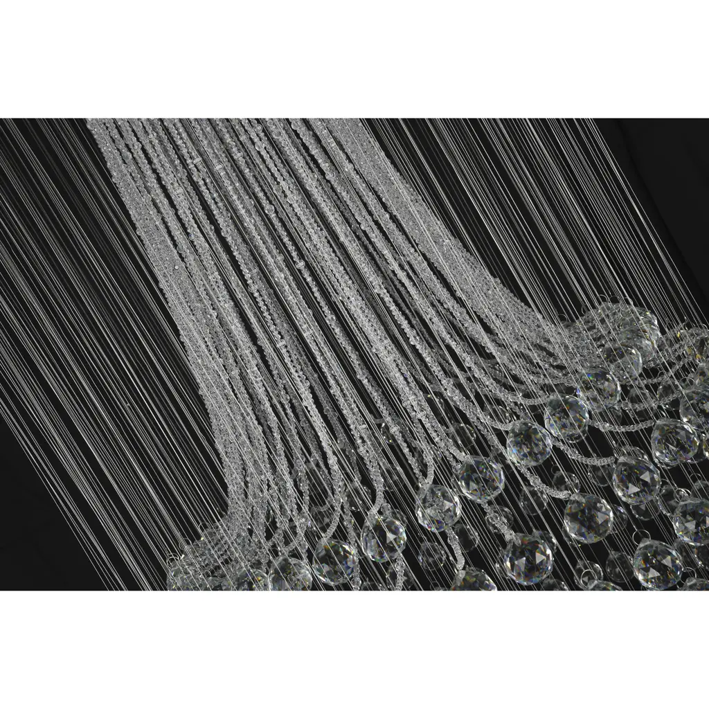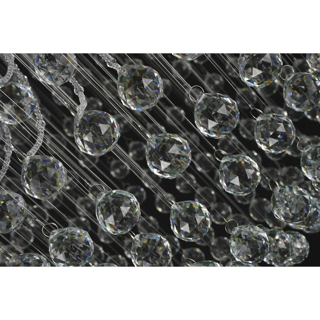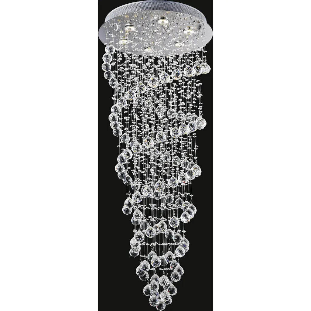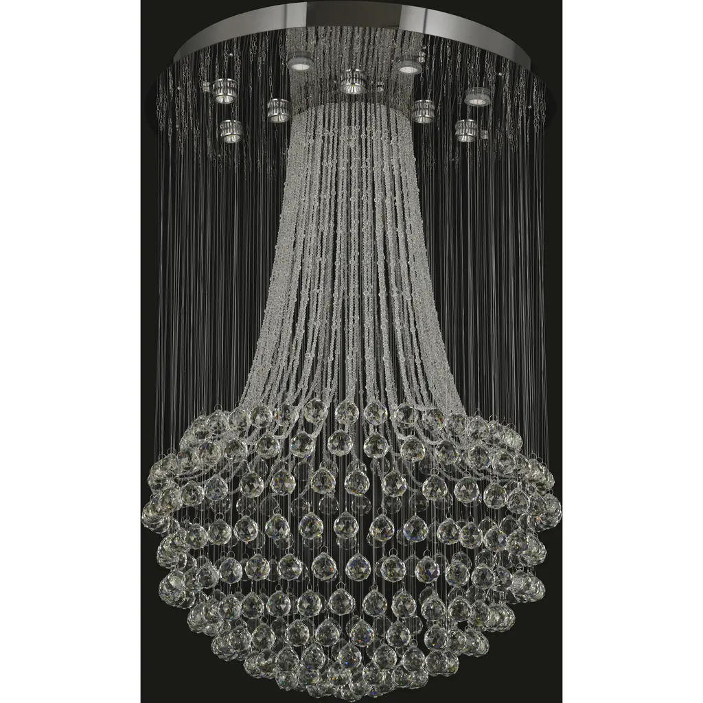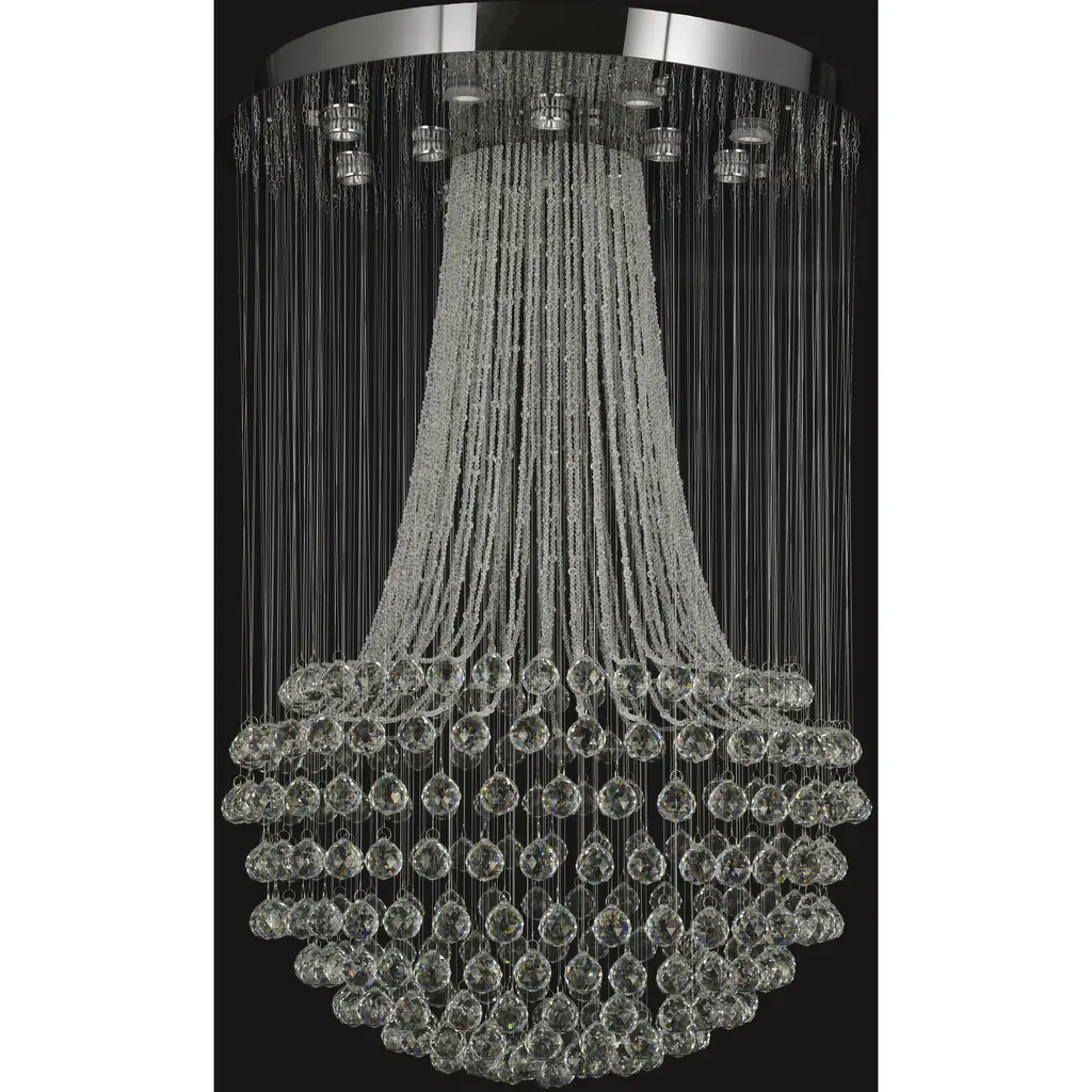 This flush mount is in a chrome finish. It comes with clear hanging crystals and beads. The materials for this flush mount consists of stainless steel and crystal.
