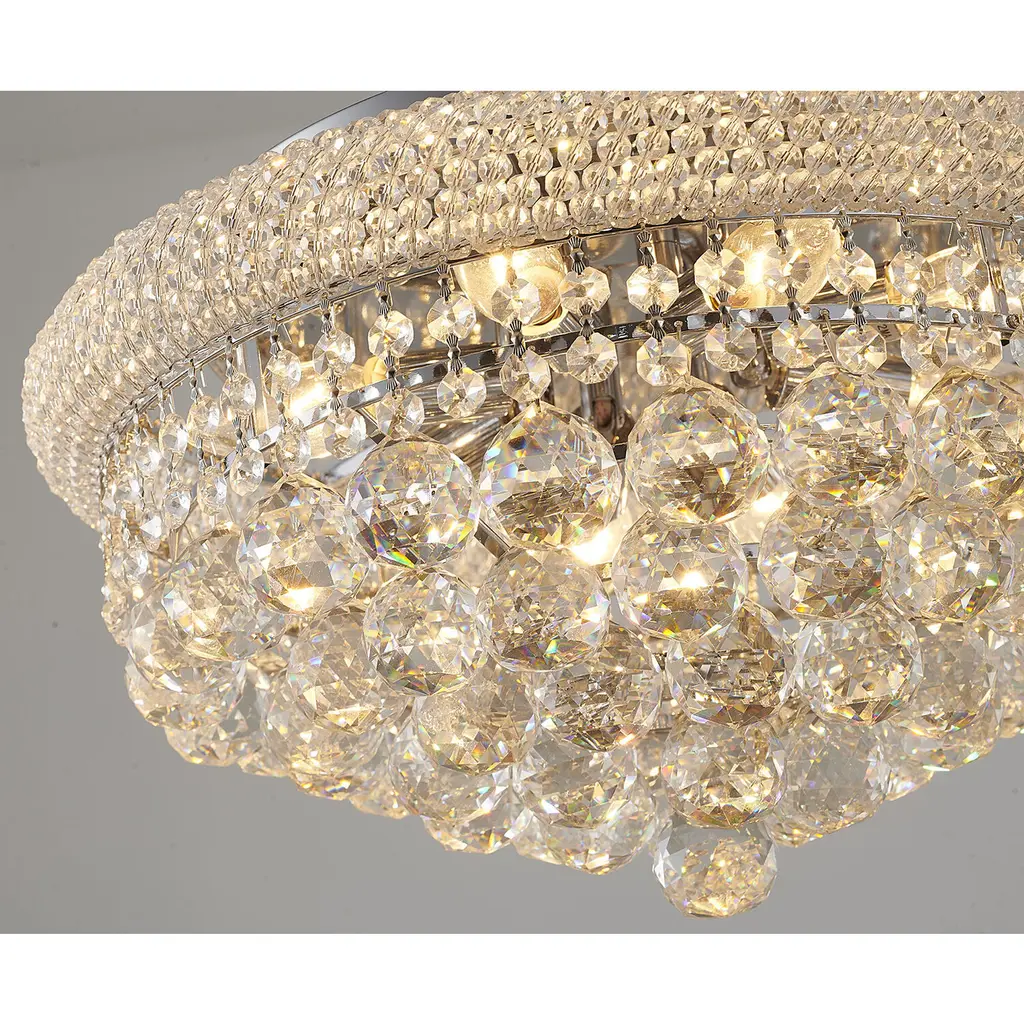 This contemporary flush mount is stunning with a chrome metal frame decked with strands of faceted clear distorted crystals, and the crystals further highlight the uniqueness of this fixture. When you hang this modern flush mount in your home, you will easily be surprised by the magnificent light reflected by the crystal accents. If you are also looking for a light source for your living room, bedroom, entryway, or dinning room, this flush mount can easily fit into your modern home decor.