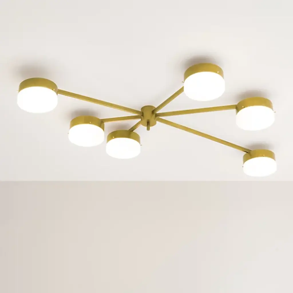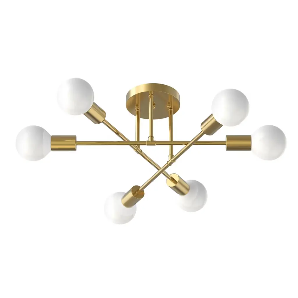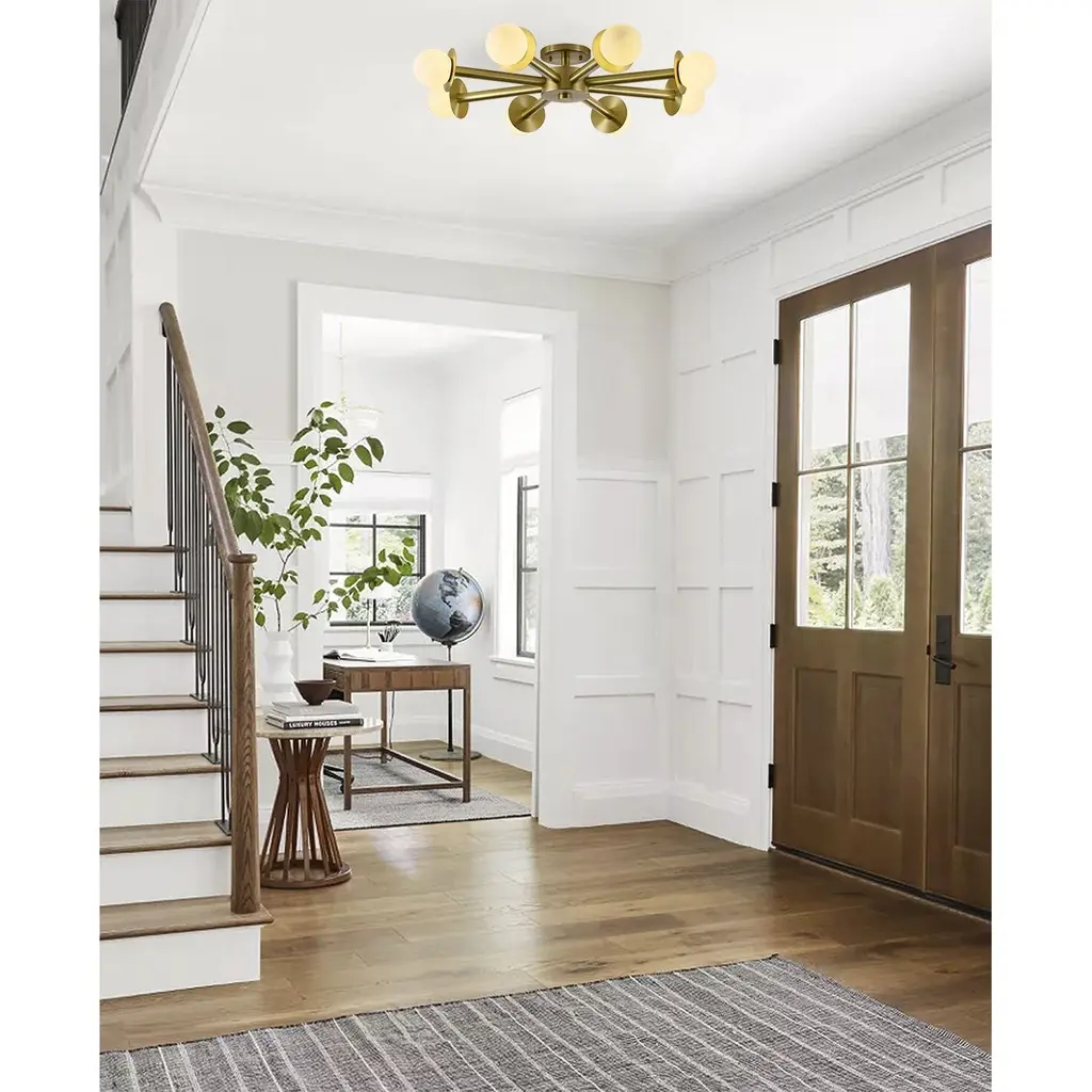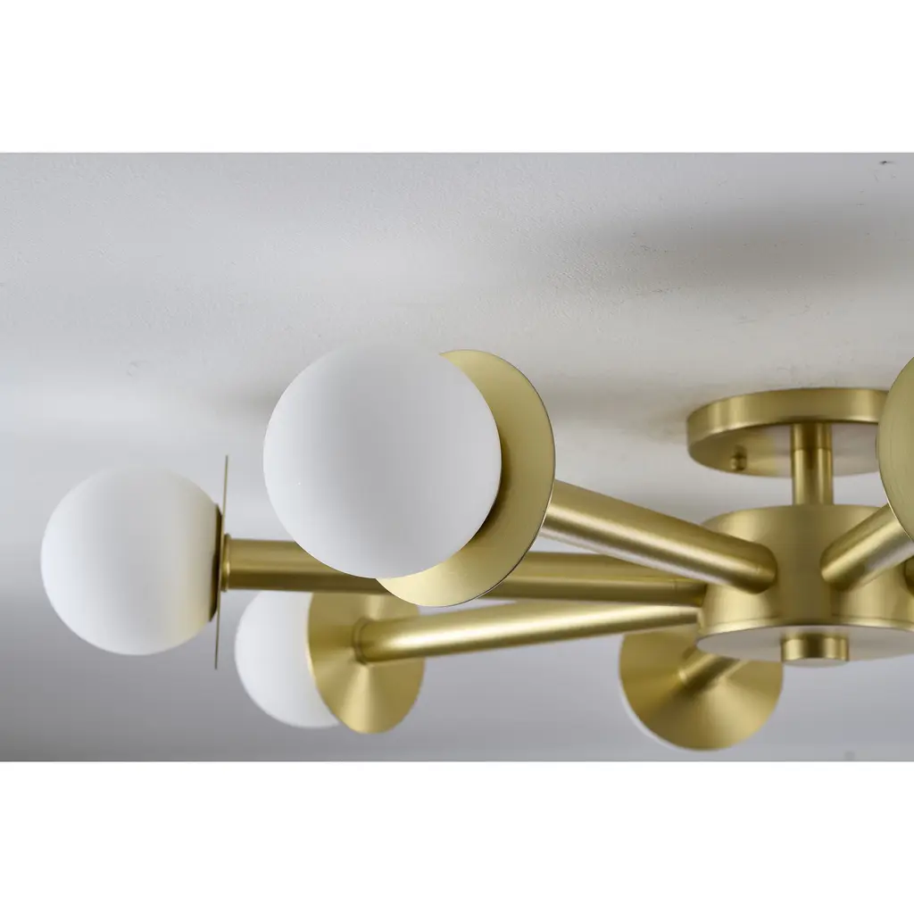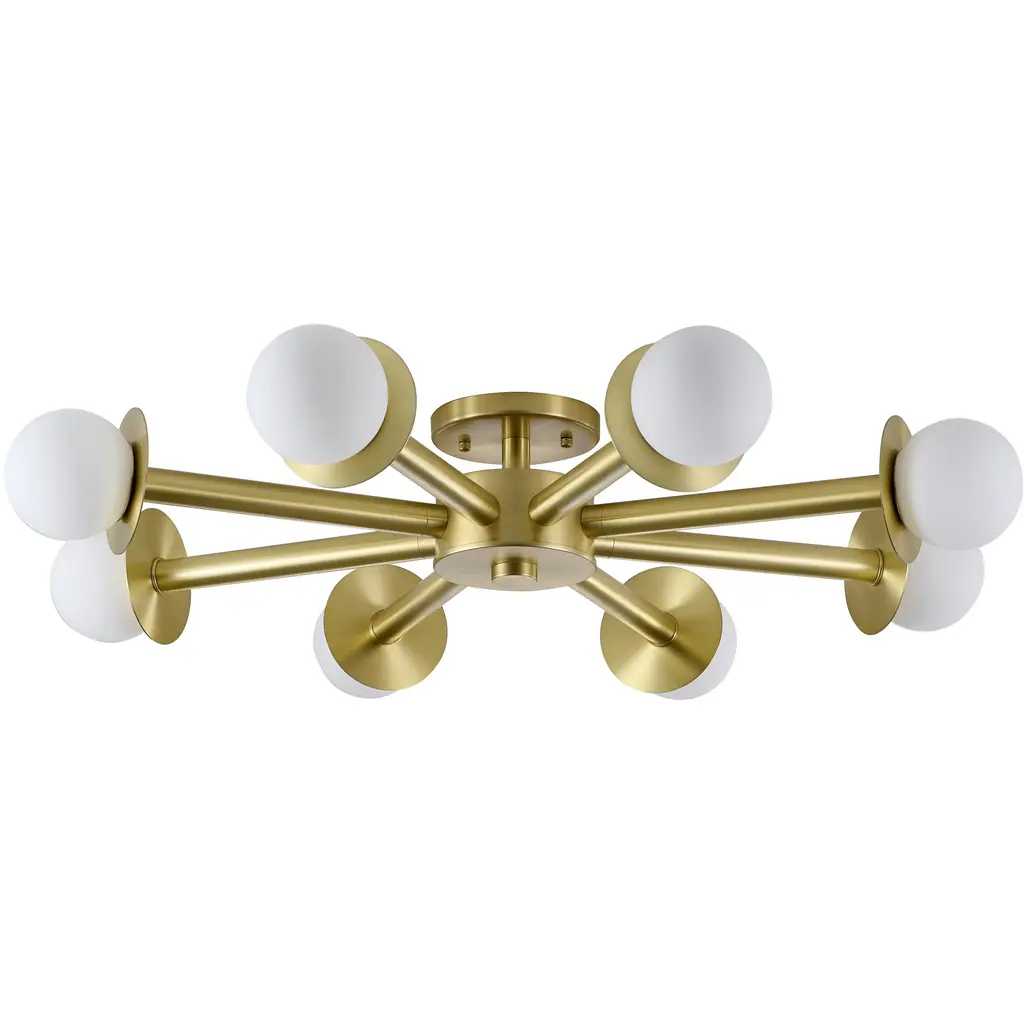 This transitional flush mount is a beautiful and elegant lighting fixture that adds a touch of sophistication and refinement to any room. The satin brass metal frame provides a warm and inviting look, while the white frosted glass shades add a touch of softness and subtlety. The lamp's dimensions of 36 inches in diameter and 6 inches high make it a great option for bedroom, living room, kitchen, dinning room, or entryway. The 8xG9 base is compatible with standard light bulbs (Bulbs Not Included), and the 40W rating means it can provide a bright and warm glow.
