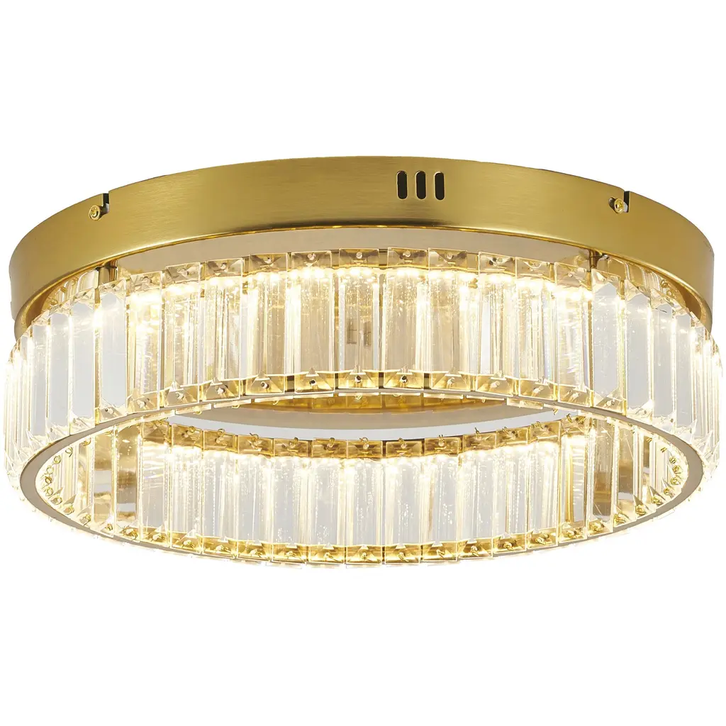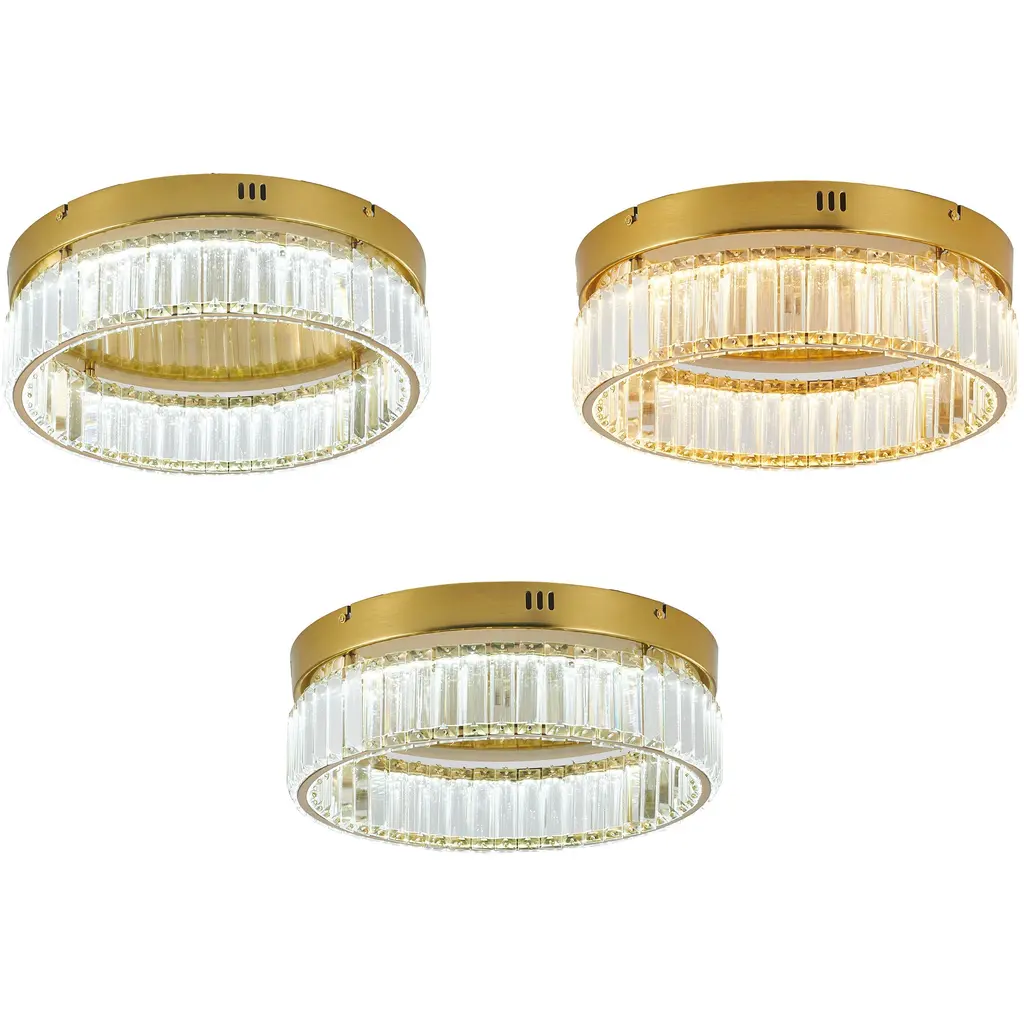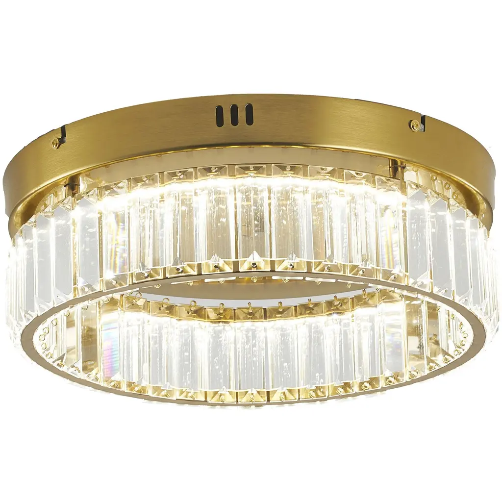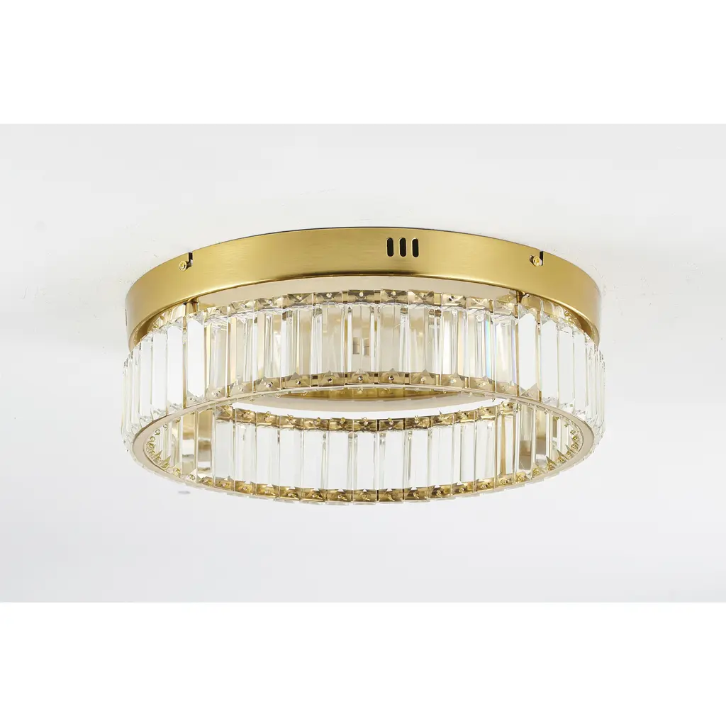 This transitional LED flush mount is stunning with a brass steel frame decked with strands of faceted clear crystal shades, and the crystals further highlight the uniqueness of this chandelier. When you hang this modern LED chandelier in your home, you will easily be surprised by the magnificent light reflected by the crystal accents. This fixture showcase opulence and elegance and is the perfect modern accent to any space. If you are also looking for a light source for your living room, hallway, bedroom, kitchen, or dinning room, this LED flush mount can easily fit into your modern home decor.