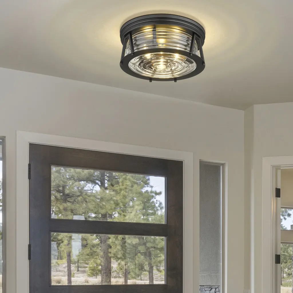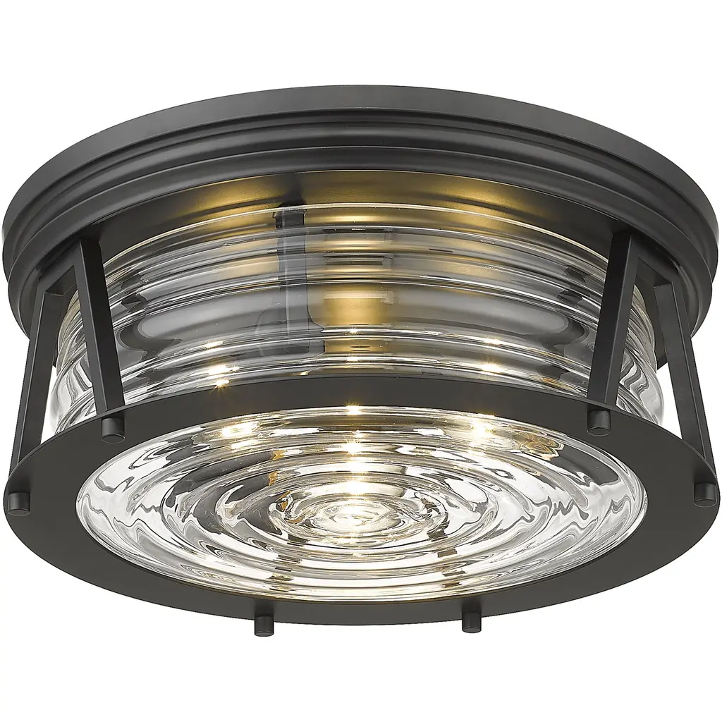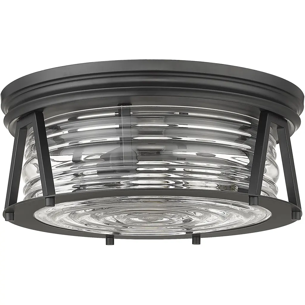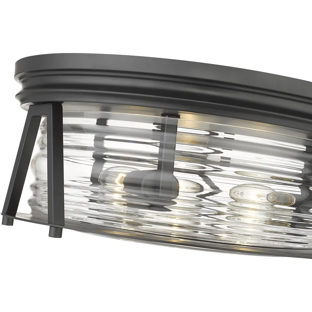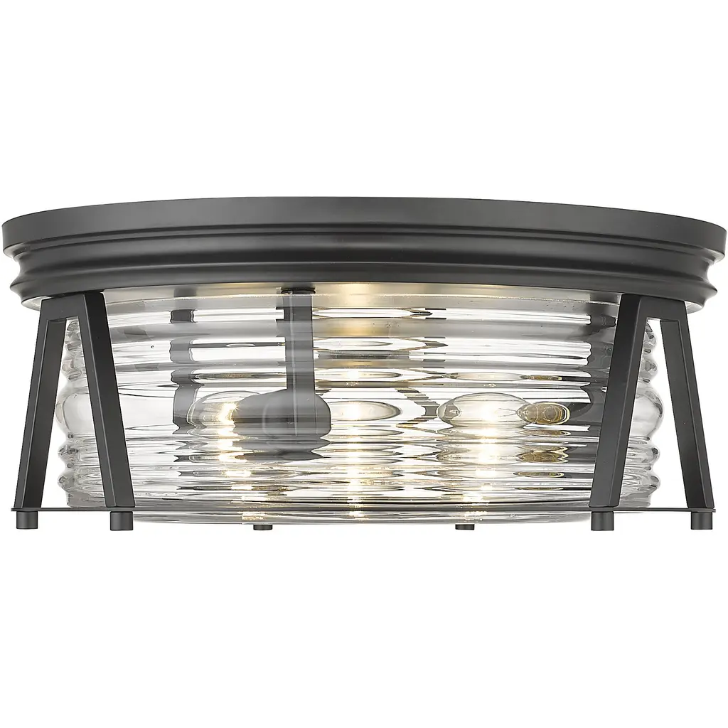 Chic lighting illuminates a custom space with decadence and a hint of nautical fare, customizing this matte black and glass three-light flushmount ceiling light. Embrace a historical theme originating from storied lighthouse designs with this light from the Cape Harbor collection, enjoying versatility that embellishes a space with modern, industrial, and Art Deco ambiance. This light offers a sleek ribbed clear glass shade nestled in a linear frame fashioned of bold matte black finish steel.