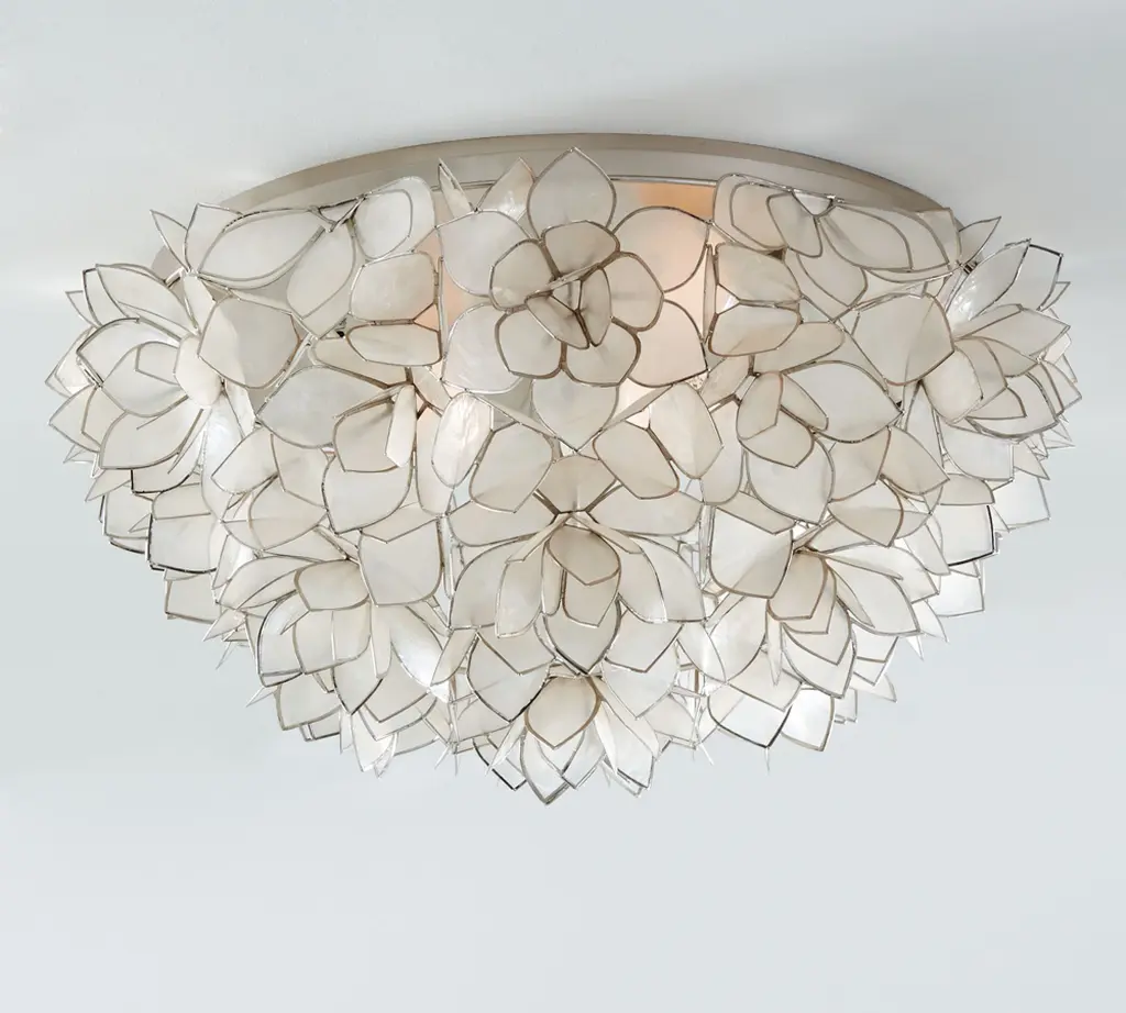 Hundreds of capiz petals form a luminous lotus flower on our flush mount fixture. The flower glows from within when the light is illuminated.