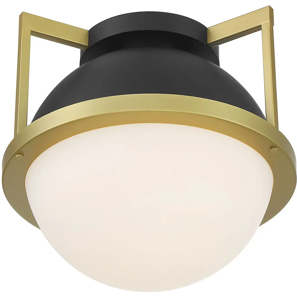 Brighten up any ceiling with the Art Deco-meets-industrial Savoy House Carlysle 1-light ceiling flush mount light. The classic combination of white opal glass and a black finish is offset beautifully by angular pronged detailing finished in gold. Carlysle is 14.25" in height and 15" in width. It uses 1 standard size bulb with a max of 60 watts (bulb not included).