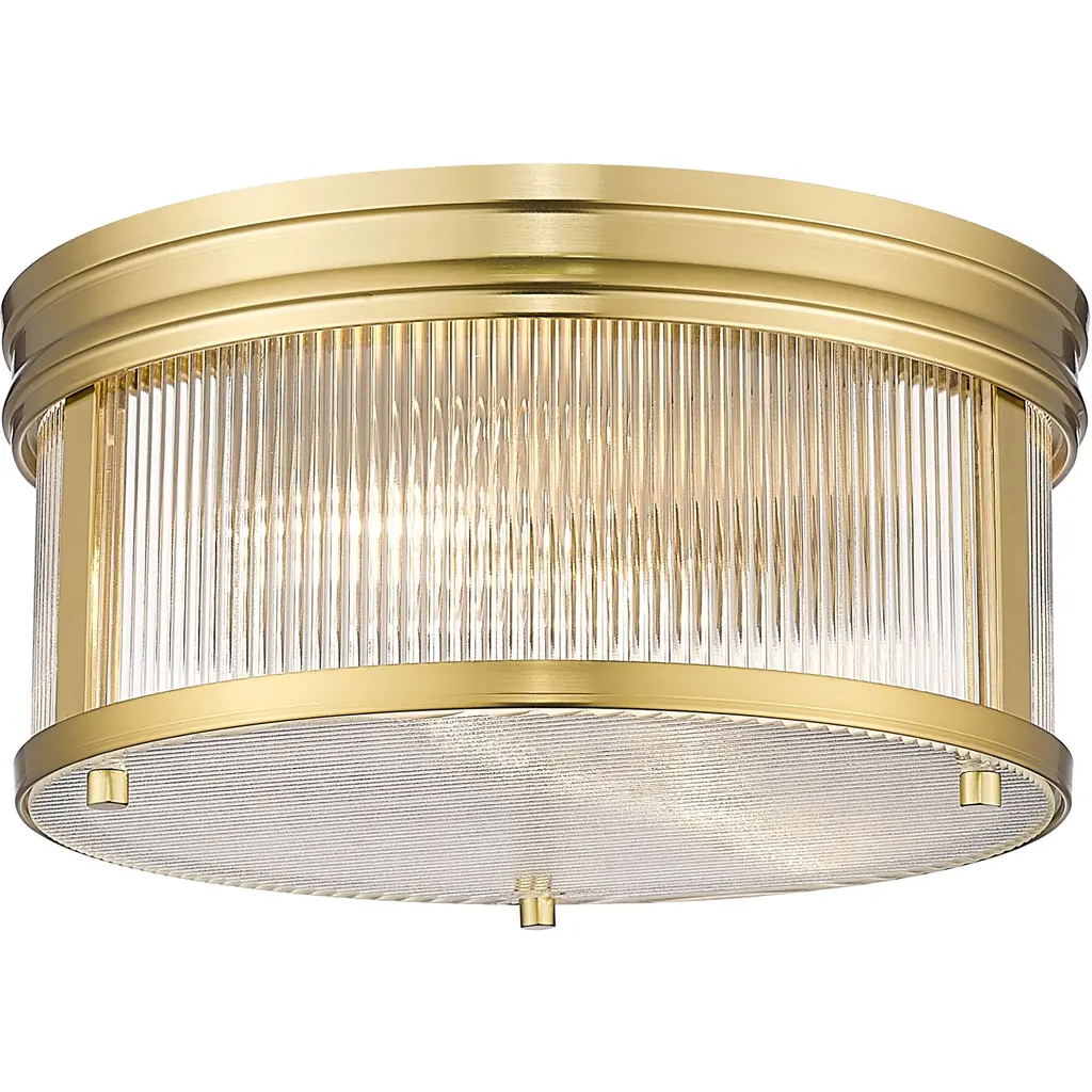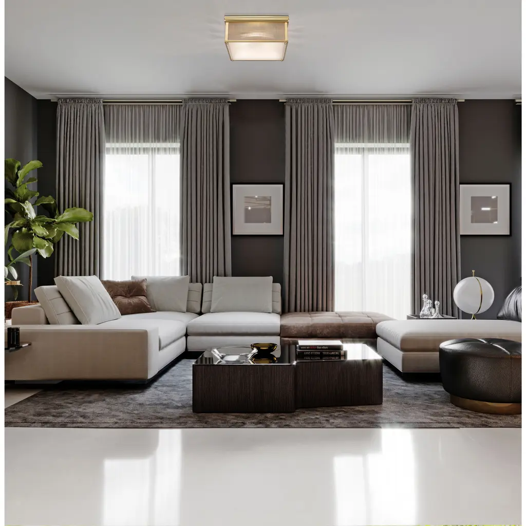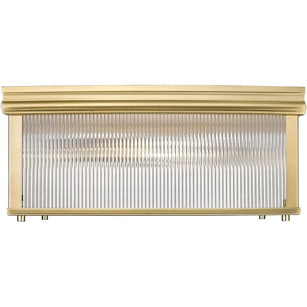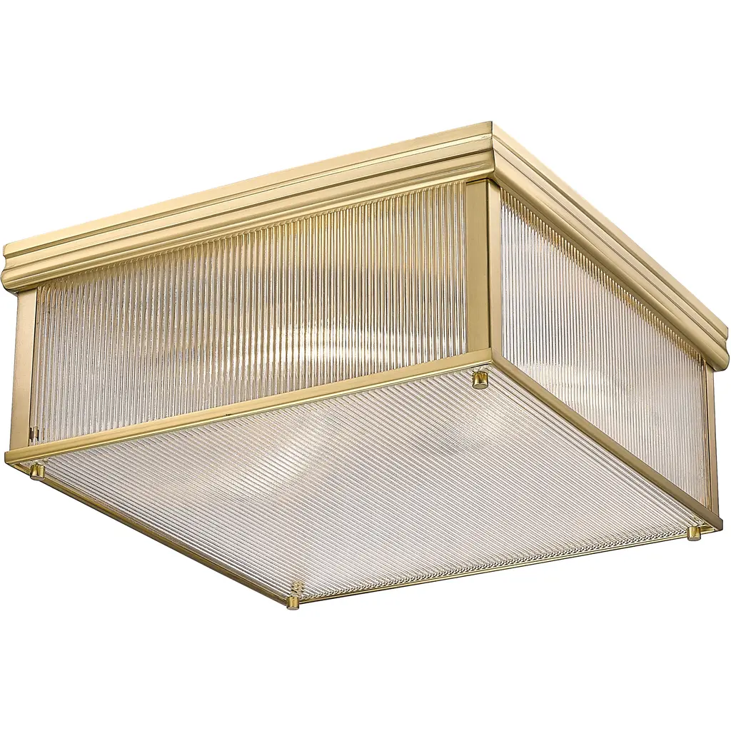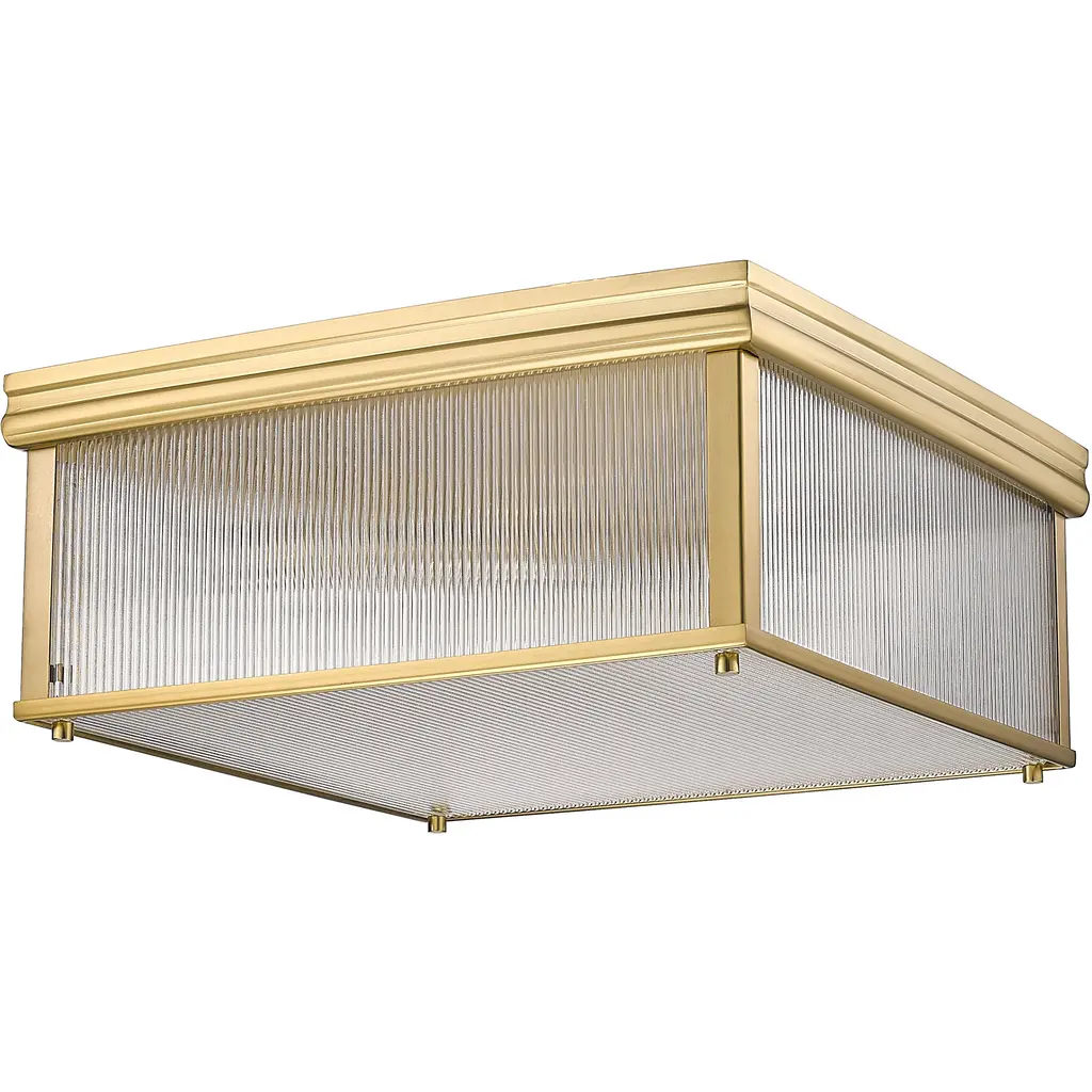 Transformed with the choice of architectural ribbed glass, this modern four-light flush mount ceiling light showcases clean lines and a timeless profile. Striking in spots with lower ceiling clearance, it's a distinctive design that finds definition in its glam modern gold finish and squared silhouette. It's a gorgeous choice for a bedroom, den, or even in your entryway.